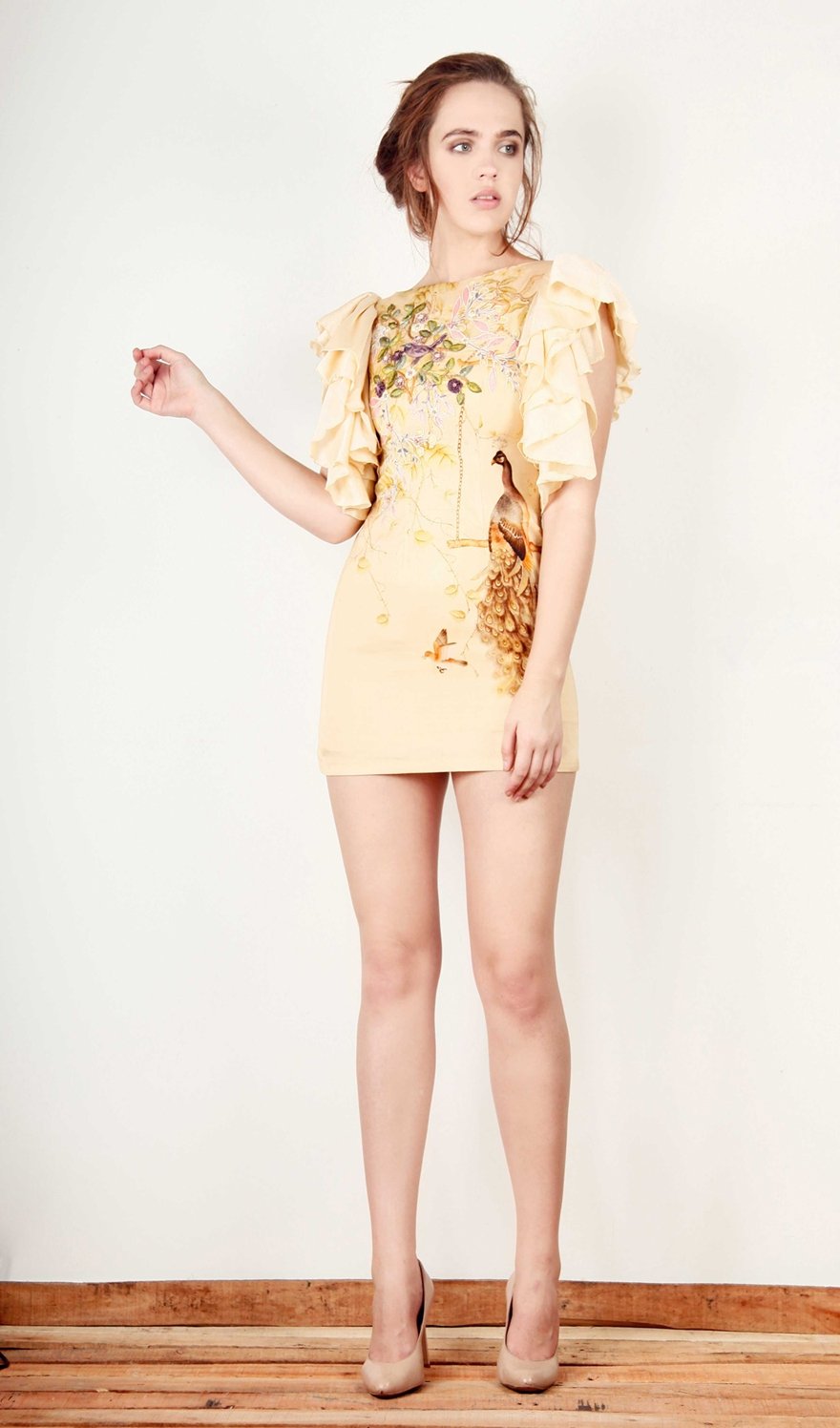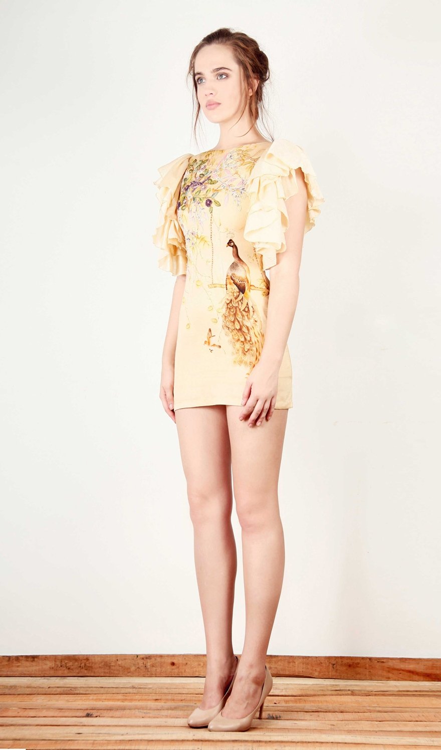 Make a stylish statement in this charming Cream Peacock Print Fitted Dress. Crafted from luxurious Modal Satin, the short dress boasts a sleek boat neckline and adorable heavy short ruffles that serve as sleeves, adding a touch of playfulness to the overall design. The vibrant peacock print in cream hue evokes a sense of elegance and sophistication, perfect for formal events, parties, or special occasions. The fitted silhouette and modal satin fabric create a flattering and comfortable fit, making this dress a must-have in your wardrobe. The unique peacock print and ruffled sleeves add a touch of whimsy, ensuring you stand out in a crowd.