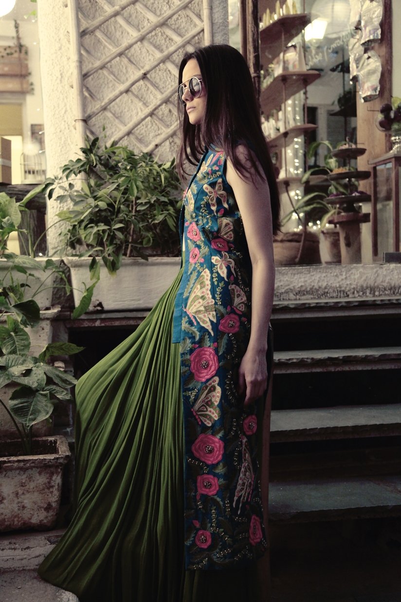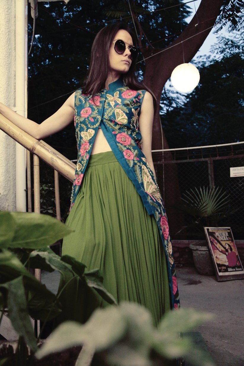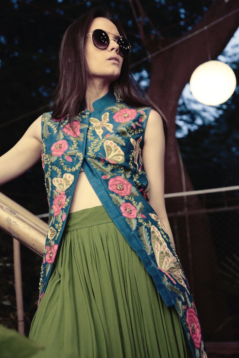 Featuring a teal front open jacket in silk base with multicolor floral and bird motif resham embroidery all over. It is paired with green pleated lehenga in georgette.