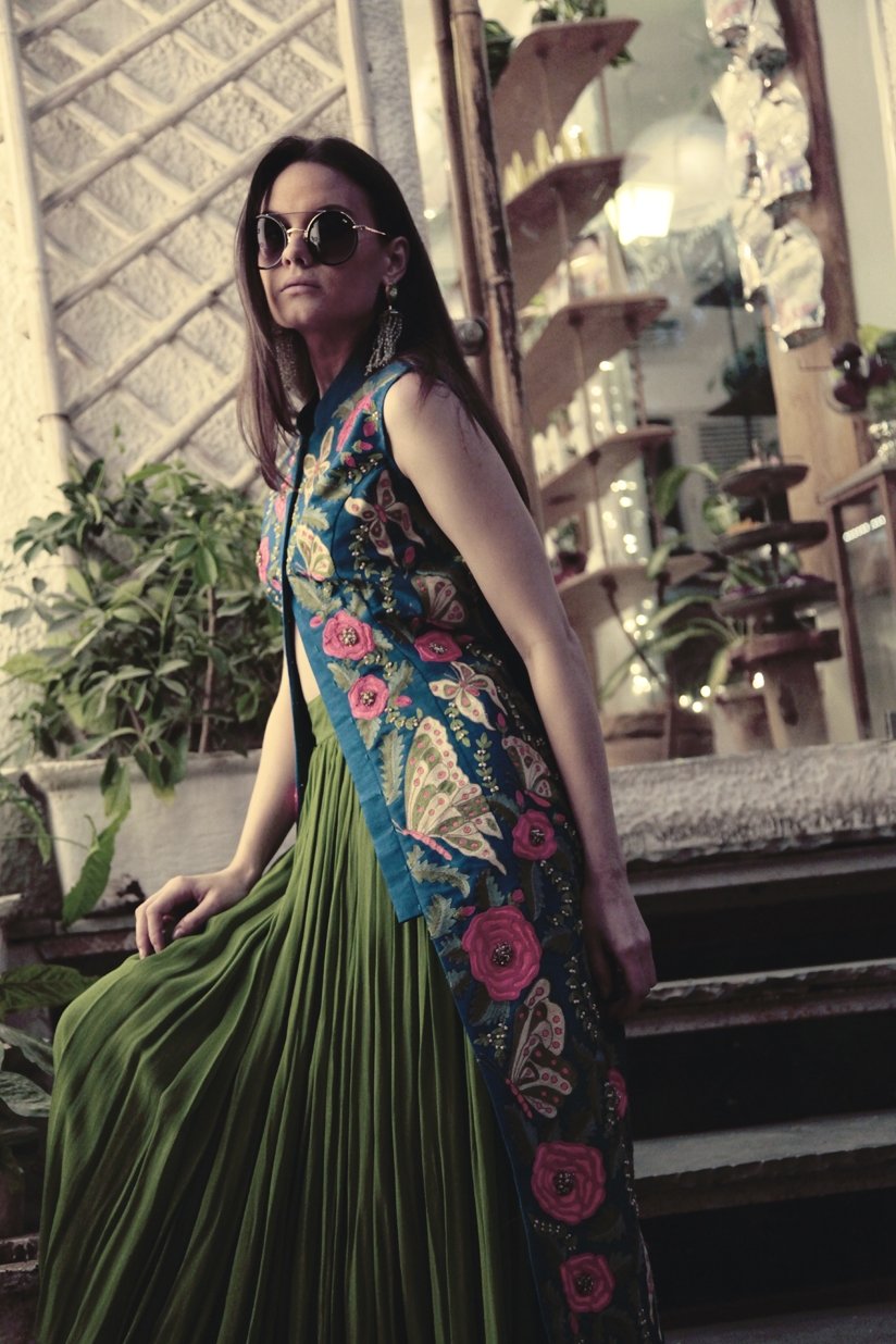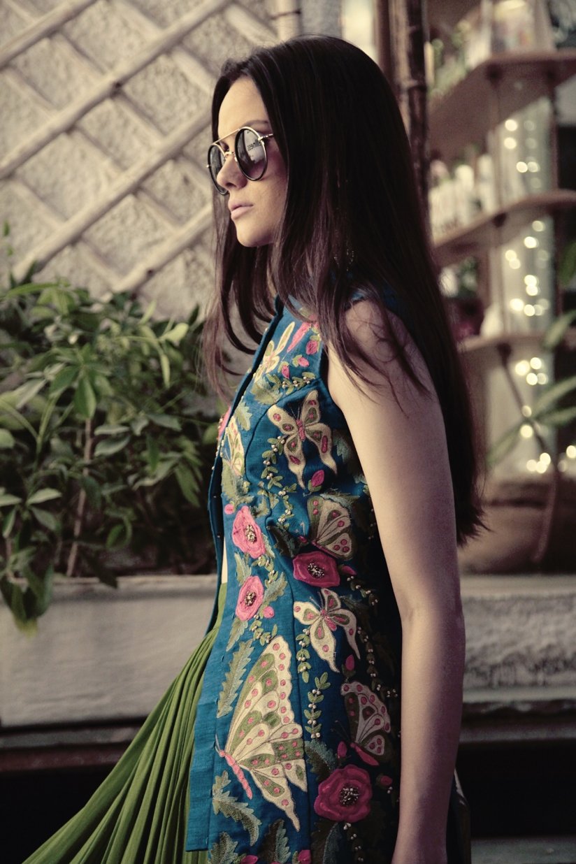 Radiate majesty and sophistication with the stunning Teal Heavily Embroidered Long Jacket with Skirt Set. The teal blue rose embroidered long front open jacket features intricate roses and butterflies embroidered all over, with gold embellishments adding a touch of luxury and glamour. The flared skirt in green complements the jacket perfectly, creating a striking contrast that is sure to turn heads. Perfect for special occasions, weddings, or formal events, this ensemble is a must-have for anyone looking to add a touch of elegance and drama to their wardrobe. The combination of teal blue, green, and gold creates a truly unique and eye-catching appearance.