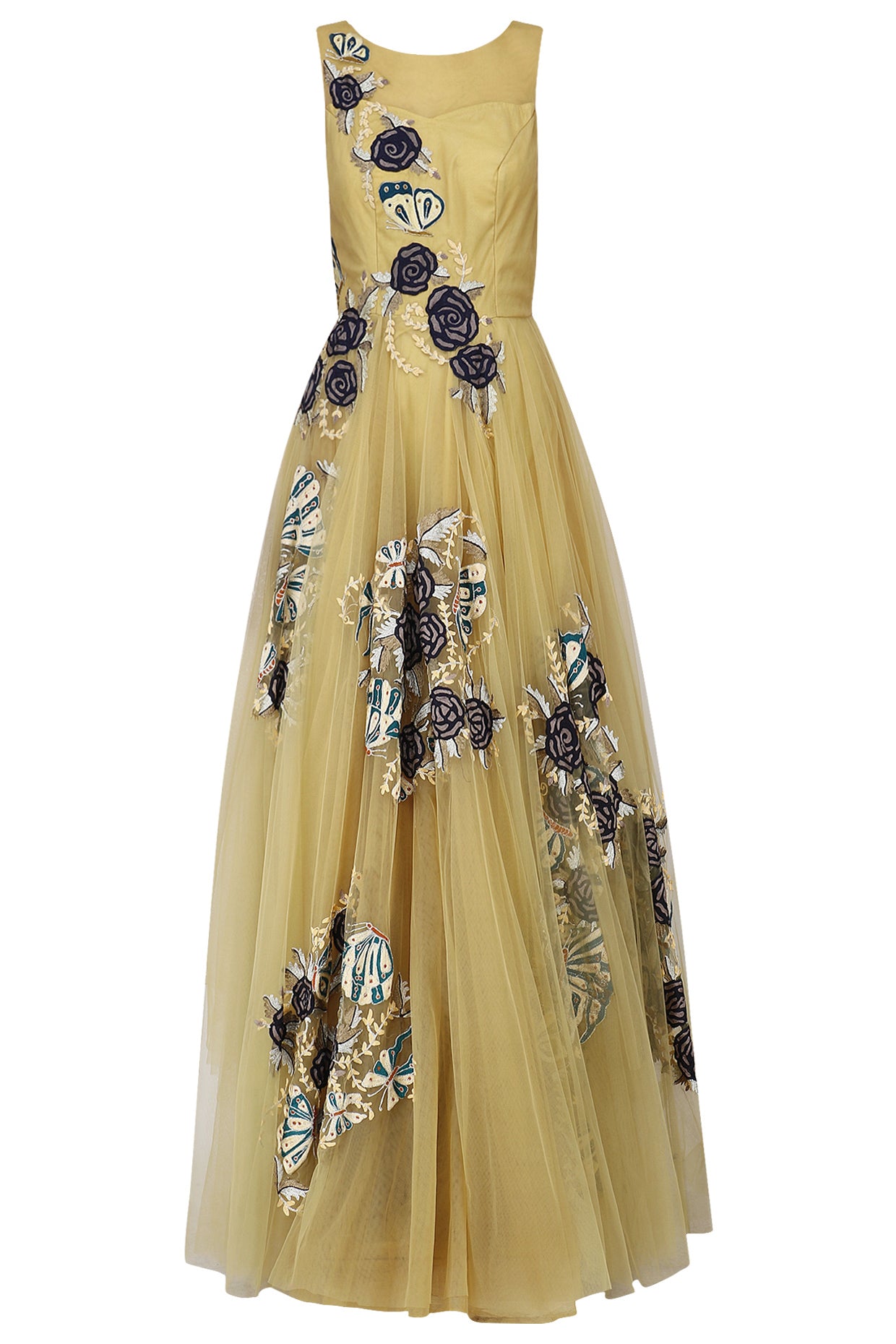 Featuring a gold layered gown in net base with butterfly motif resham embroidery scattered all over