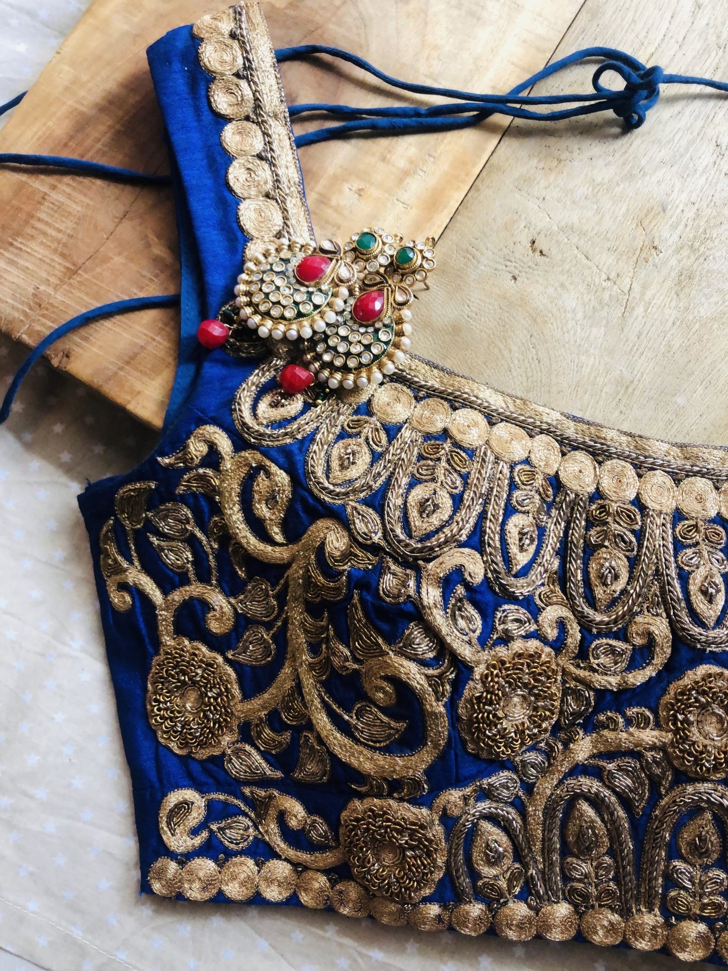 Regal Elegance: Blue Allover Embroidered Blouse - Make a majestic statement with this exquisite blue blouse, featuring intricate allover heavy golden embroidery. The choli-cut style and thin straps create a sleek silhouette, while the round neckline adds a touch of sophistication. Perfect for pairing with saris and lehengas, this stunning blouse is elevated by its opulent embroidery. Soft pastel tones or off-white/cream hues complement its beauty, creating a harmonious and ethereal look. Ideal for weddings, festivals, or formal events, this show-stopping blouse is sure to turn heads!