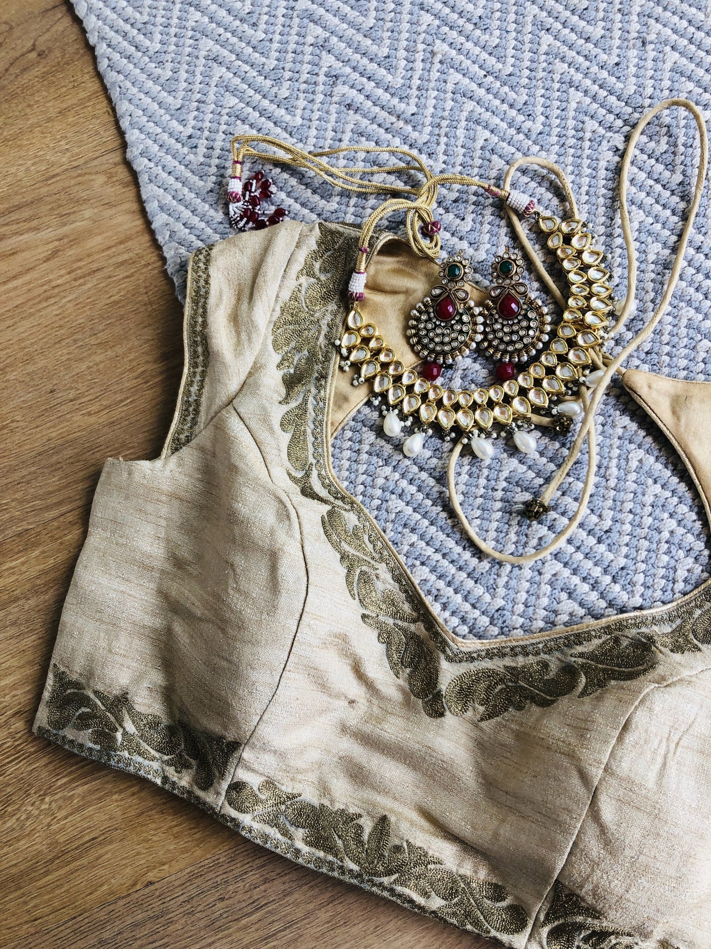 This exquisite off-white embroidered blouse exudes timeless charm and vintage flair. The short sleeves and wide V-neckline create a classic silhouette, while the antique embroidery adds a touch of sophistication and elegance. The intricate embroidery work around the hem, cap sleeves, and neckline is a testament to exceptional craftsmanship. The back dori tie-up detail adds a touch of whimsy and romance. Versatile and chic, this blouse can be paired with both sari and lehenga, making it a great addition to any Indian wear wardrobe. The off-white hue provides a beautiful canvas for bold and rich colors like emerald green, deep red, brown tones, and even white, making it perfect for formal occasions or special events.