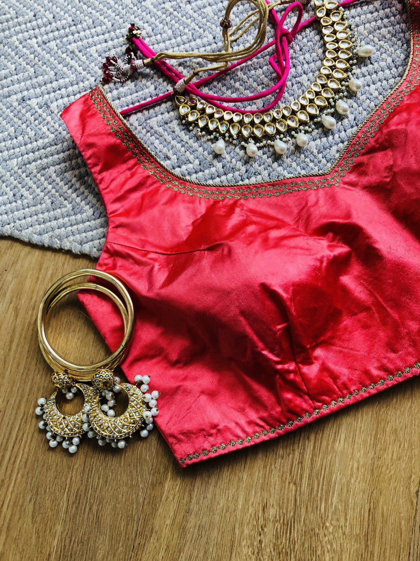 Elegant Red Silk Blouse with Delicate Gold Embroidery - Add a touch of sophistication to your traditional wear with this stunning plain red silk blouse, featuring fine gold embroidery details around the neckline and hem. The sleeveless design and sweetheart neckline create a sleek silhouette, while the back hot pink Dori tie-up detail adds a pop of color and whimsy. This versatile blouse is perfect for pairing with both saris and lehengas, and its minimal design allows for endless styling options. Complement its bold red hue with muted pink tones, cream, off-white, gold, or grey for a harmonious look, or experiment with hot pink or blue tones for a bold and eye-catching contrast. Whether you're attending a wedding or a festive occasion, this elegant blouse is sure to make a statement!