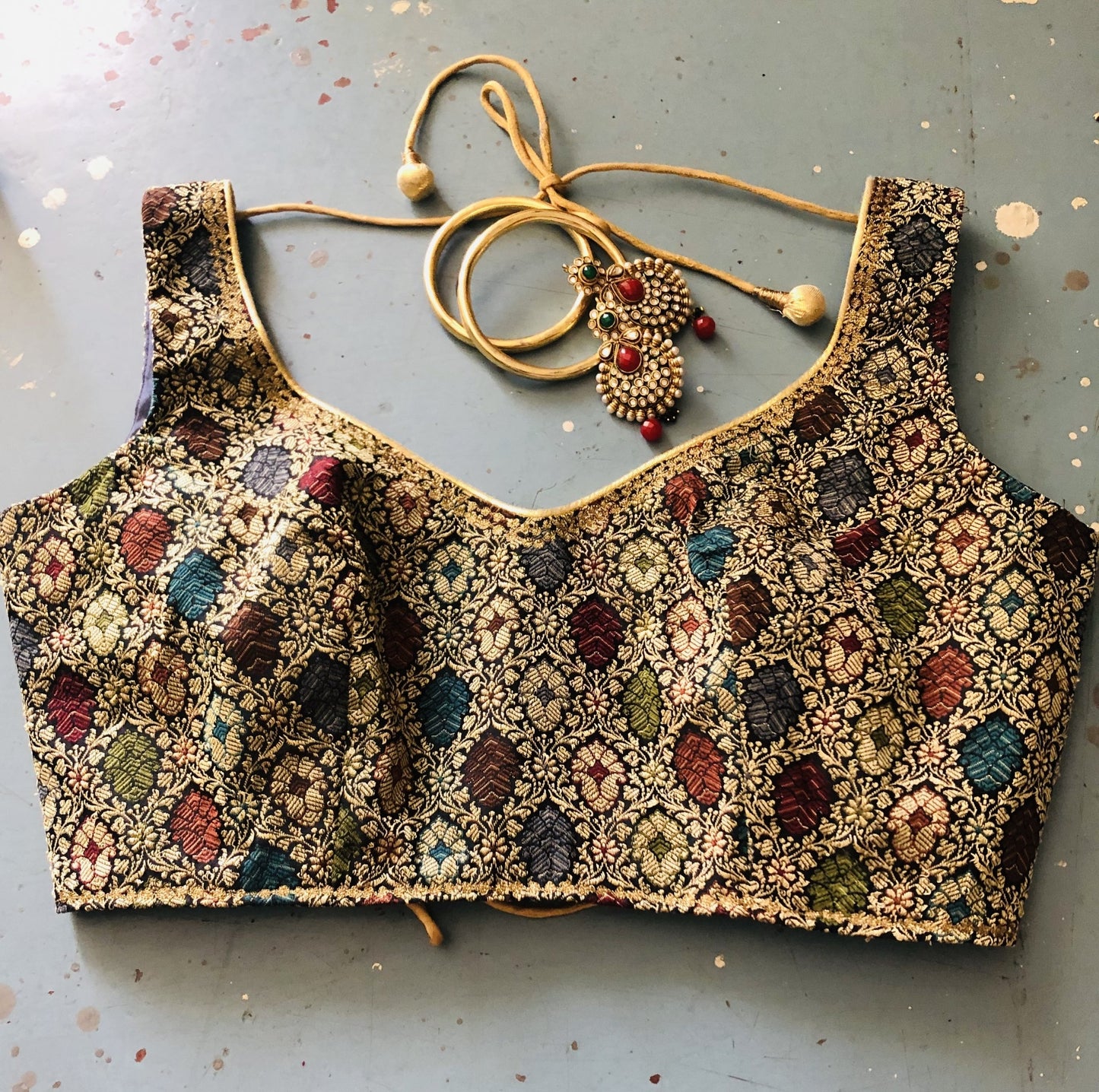 Elegant Cream Resham Work Blouse with Vibrant Multicolored Motifs - Add a touch of sophistication to your traditional wear with this exquisite cream-colored blouse, showcasing intricate Resham work all over on a luxurious silk base. The sleeveless design features stunning small, multicolored, and contemporary floral motifs, expertly crafted to create a truly eye-catching piece. With its versatile design, this blouse can be paired with a wide range of saris or lehengas and is suitable for various Indian occasions. The adjustable dori at the back ensures a comfortable and secure fit. Styling tip: Pair this blouse with any color of your choice for a stunning and unique look that's sure to turn heads.