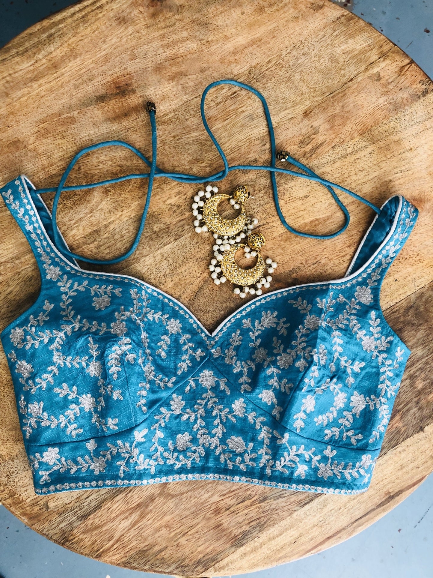Stunning Blue Embroidered Sari Blouse with Sweetheart Neckline - Make a statement at your next Indian occasion with this breathtaking blue embroidered blouse, featuring a romantic sweetheart neckline and intricate zari work all over on a luxurious silk base. The sleeveless design showcases exquisite small floral and leaf motifs, expertly crafted to add a touch of elegance. Versatile and sophisticated, this blouse can be paired with a variety of saris or lehengas, and is particularly stunning with gold or ivory saris. Perfect for weddings, festivals, or other special occasions, this blouse is sure to turn heads