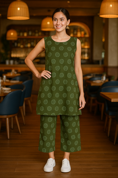 Hand Block Printed Floral Kurta Set with Loose Palazzo Pants - This charming kurta set features a beautiful hand block printed fabric with intricate small ornamental motifs, creating a unique and eye-catching design. The kurta is paired with loose palazzo pants, perfect for a comfortable and stylish ensemble. The traditional hand block printing technique adds a touch of authenticity and craftsmanship, making this set a standout piece in any wardrobe. The subtle floral pattern and ornamental motifs create a soft, romantic look, ideal for casual yet elegant occasions.