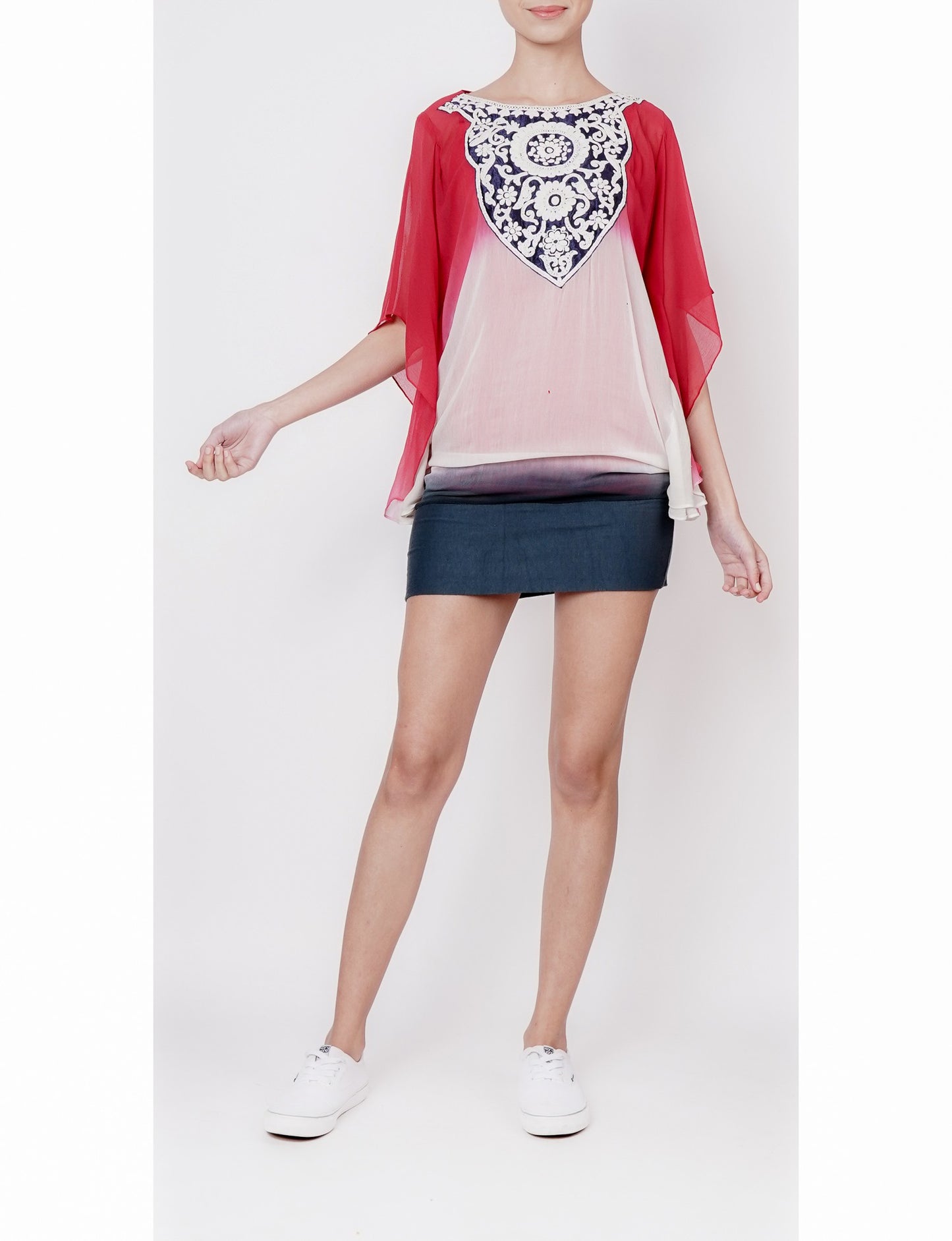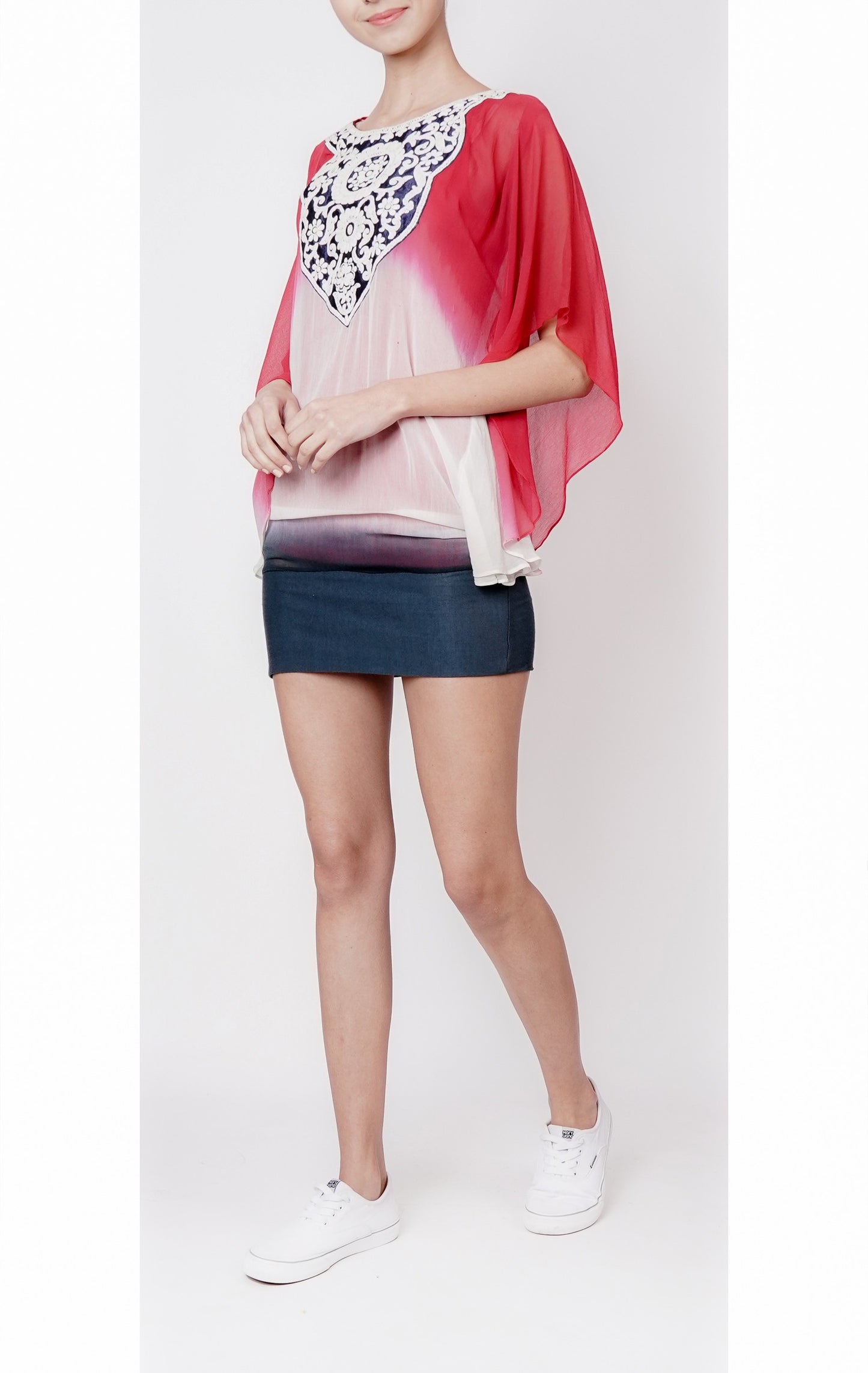 Red, White, and Blue Ombre Top with Oriental Embroidered Yoke - This vibrant top features a stunning ombre effect in shades of red, white, and blue, paired with a beautiful white dori embroidered yoke at the neckline. The yoke showcases an exquisite oriental motif, expertly crafted with intricate embroidery, adding a touch of elegance and sophistication to the overall design. The perfect blend of modern colors and traditional craftsmanship makes this top a standout piece