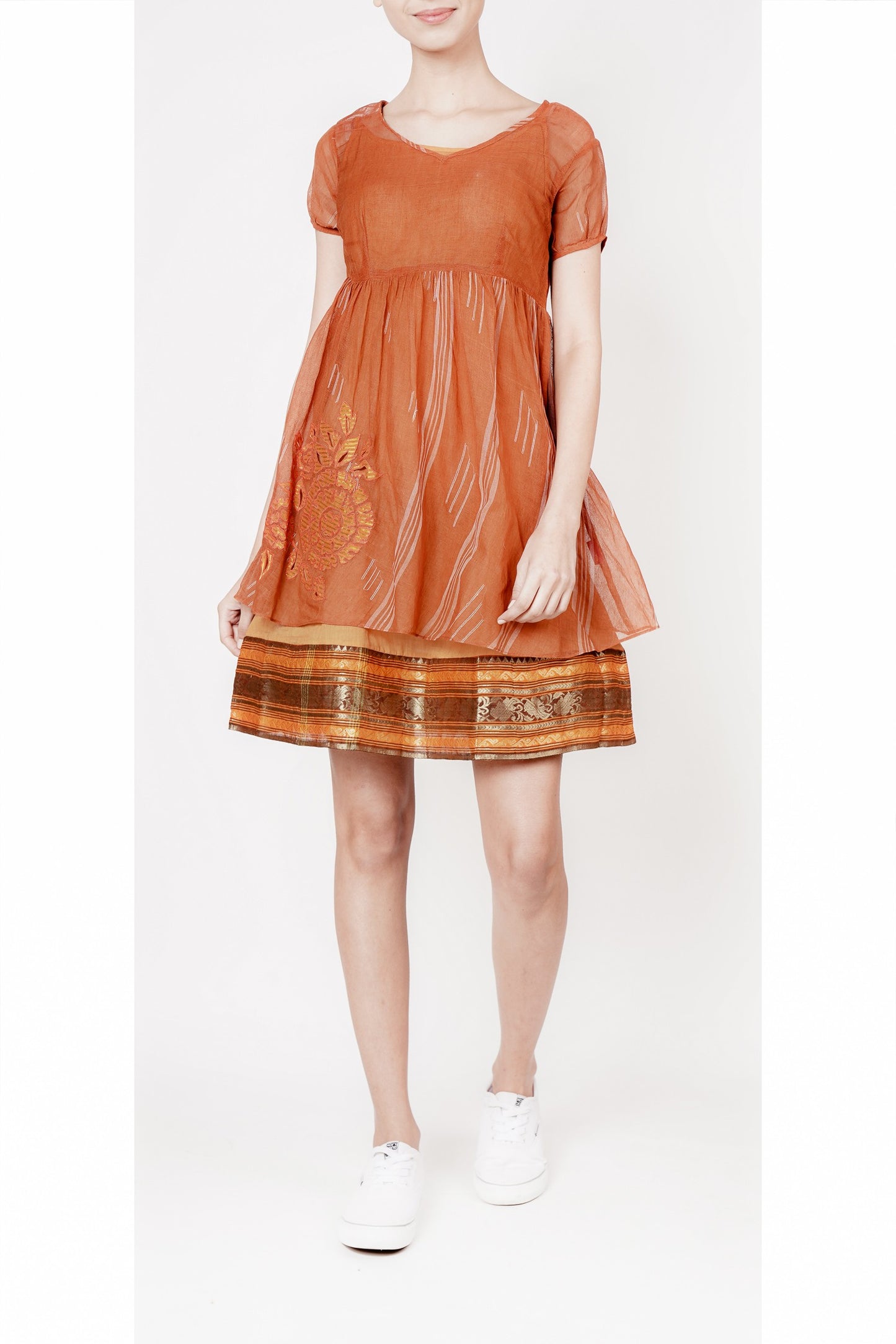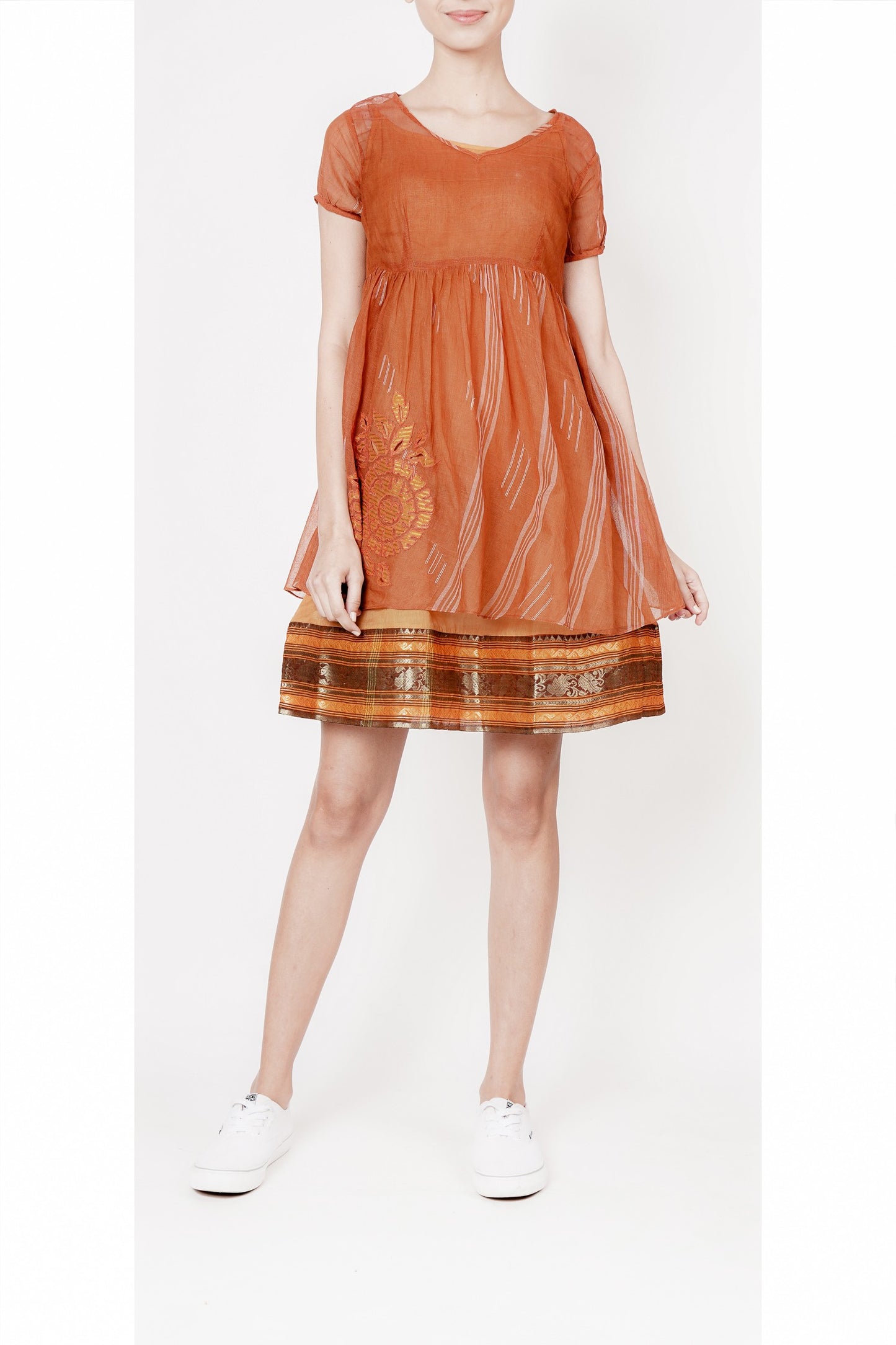 Earth-Toned Rust Cotton Dress with Handwoven Border and Unique Appliqué Detail - This charming double-layered dress features a warm rust hue and showcases traditional craftsmanship with a handwoven border. The tunic boasts a striking appliquéd motif on one side, adding a touch of elegance and sophistication to this comfortable, cotton ensemble