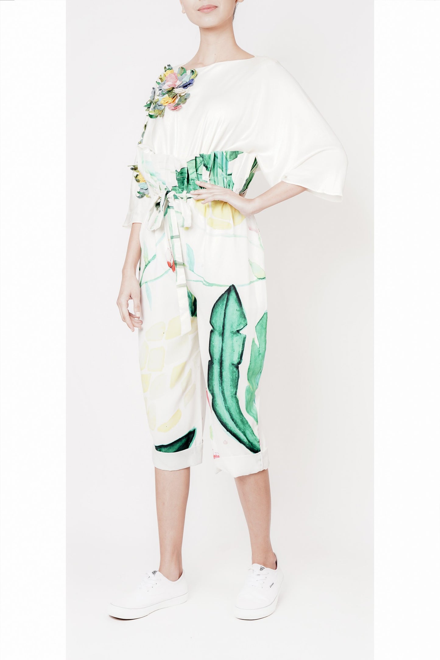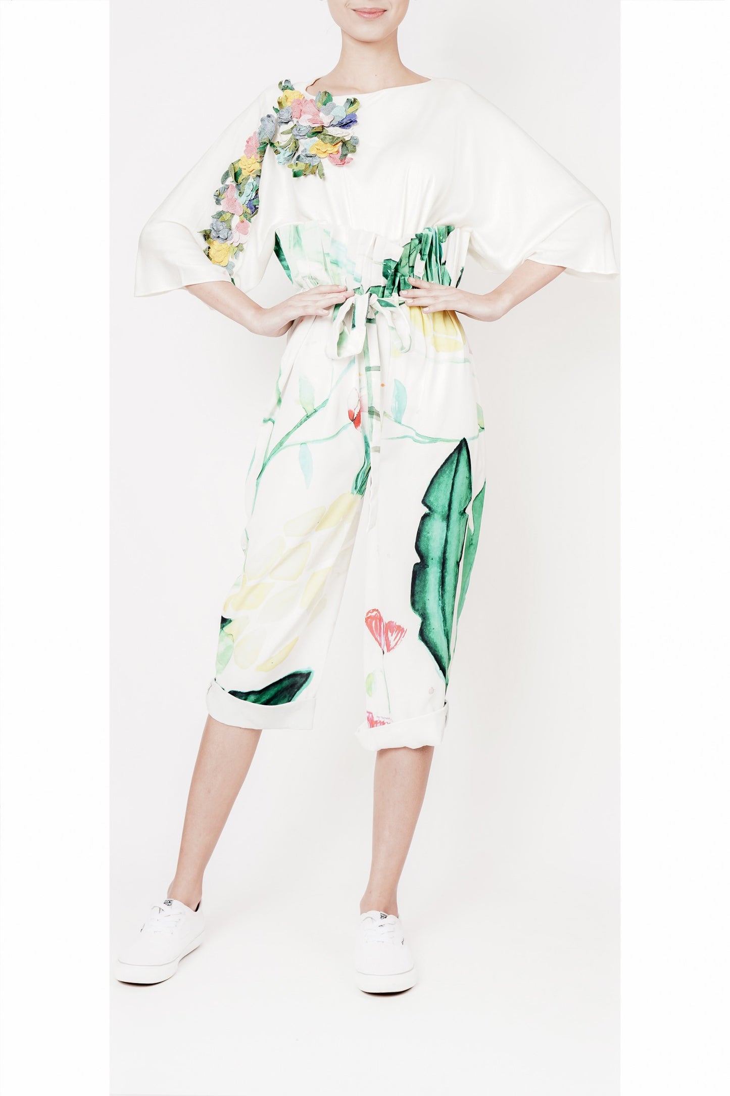 Elegant White Modal Satin Top with 3D Floral Embroidery - Pair this stunning white top, featuring intricate three-dimensional floral embroidery on one sleeve, with matching flared pants boasting pleated details at the waist, complete with a sleek belt for a polished finish.