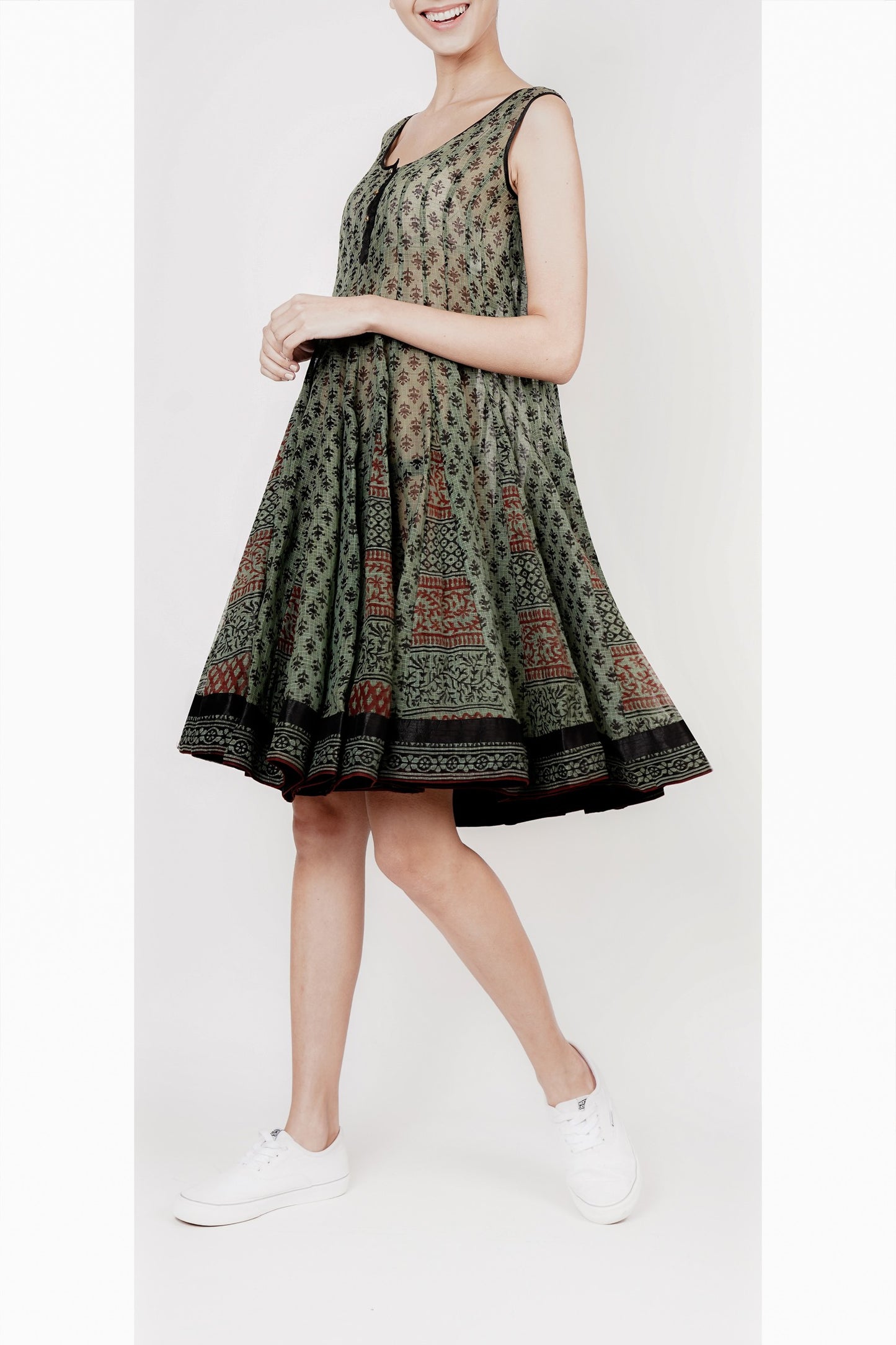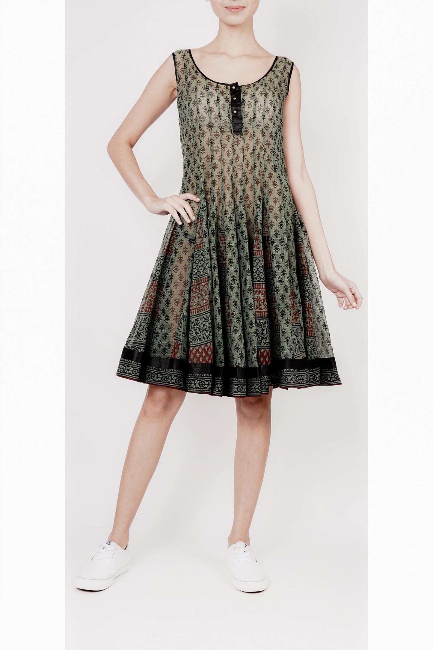Green and Black Hand- Woven Kota Tunic with Silk Hem Border - Experience the beauty of traditional block printing on this stunning green and black tunic, crafted from hand-woven Kota fabric and elegantly finished with a silk border at the hem.