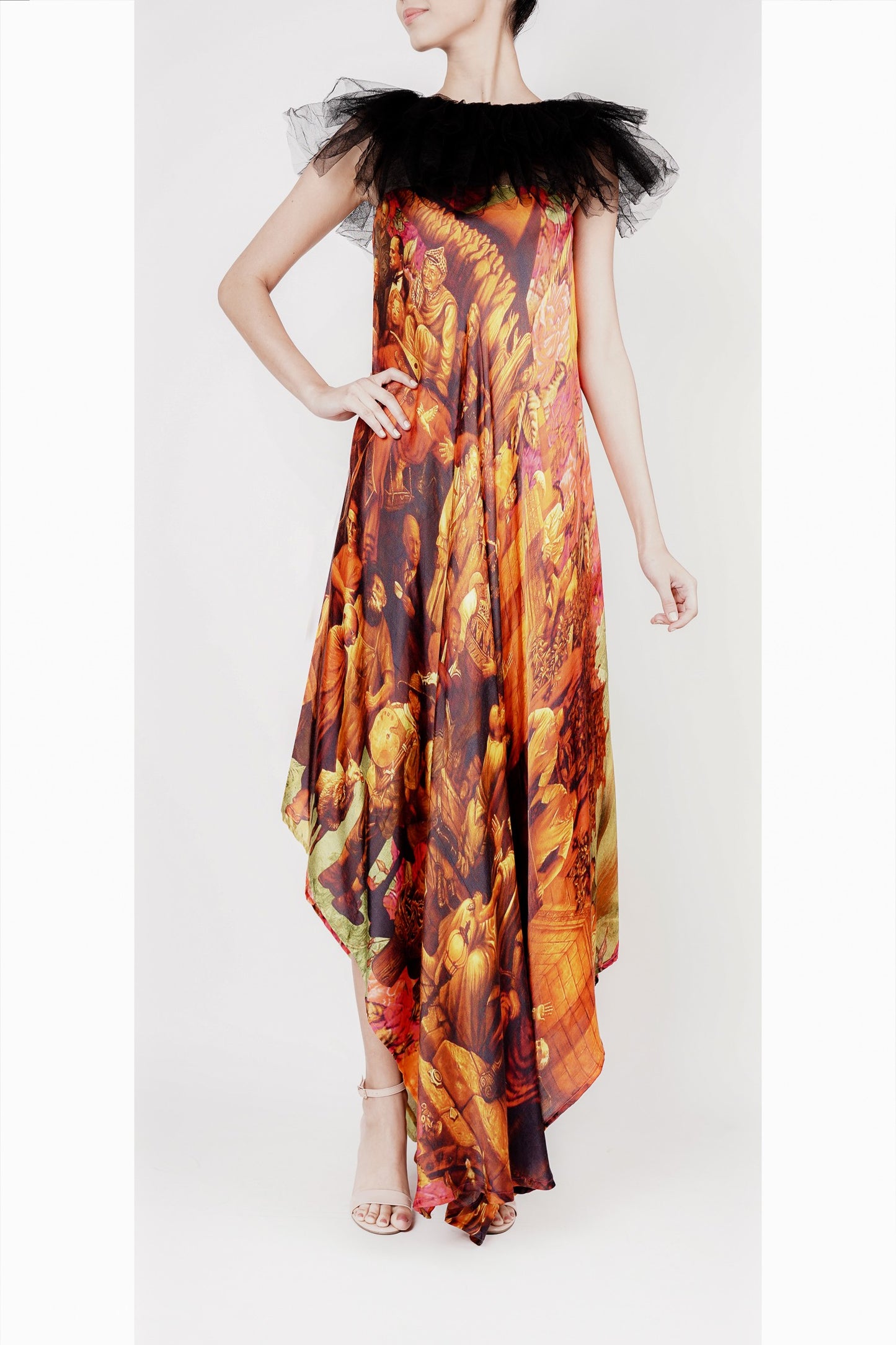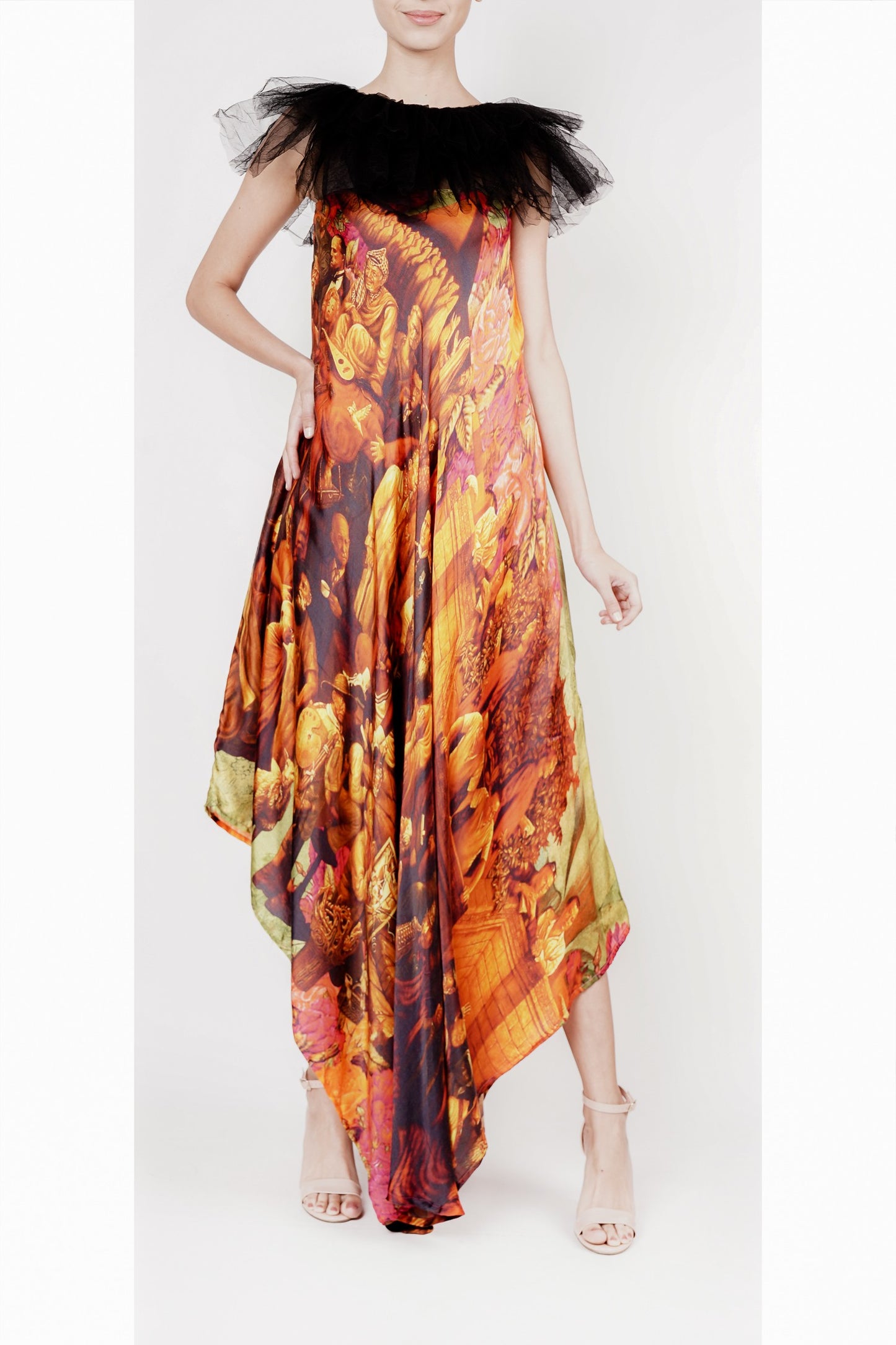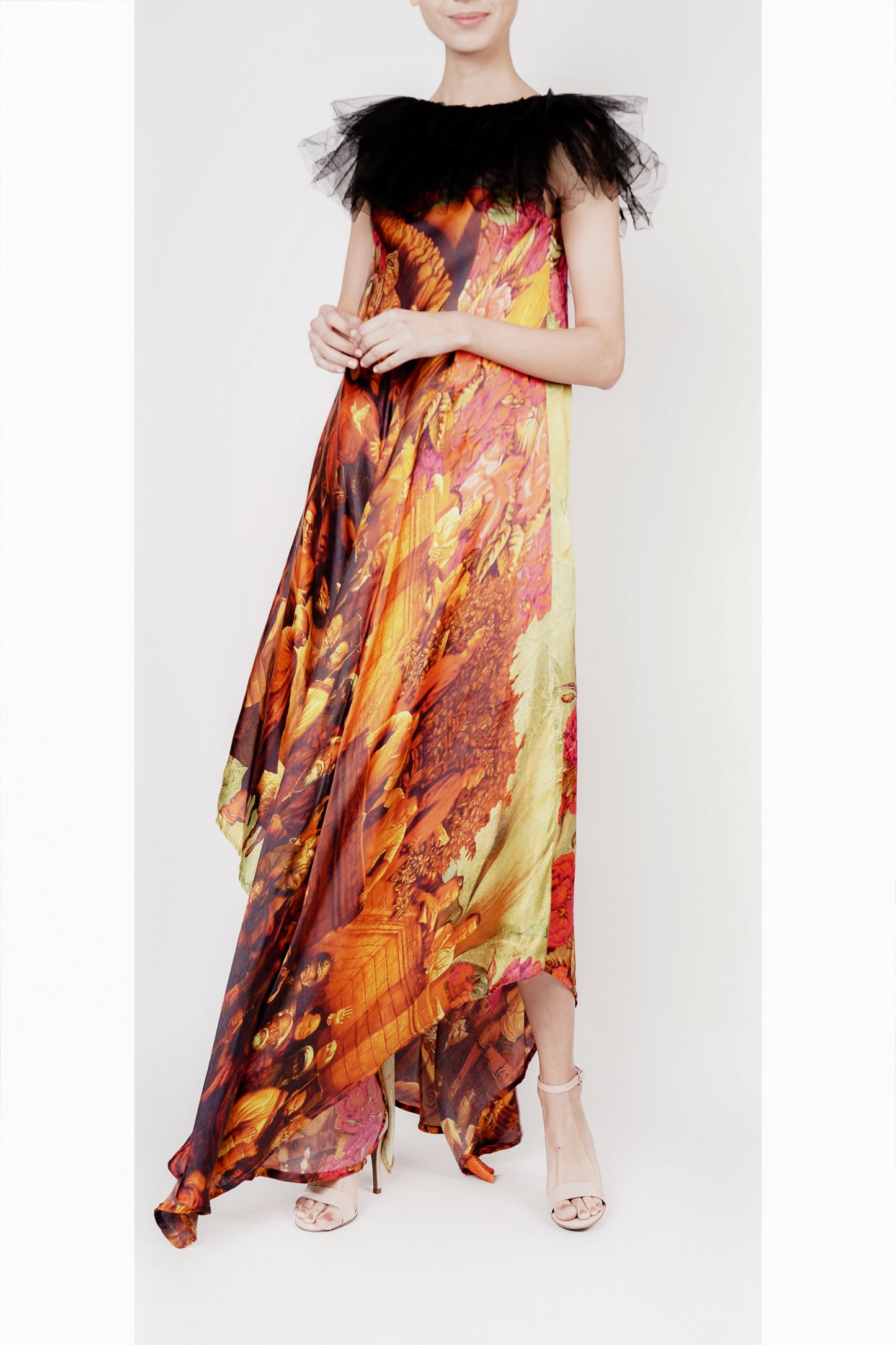 Vibrant Orange Satin Dress with Black Net Frill Detailing - Elevate your style with this stunning long printed dress featuring an all-over black net frill on the front and back neckline, crafted from luxurious satin fabric.