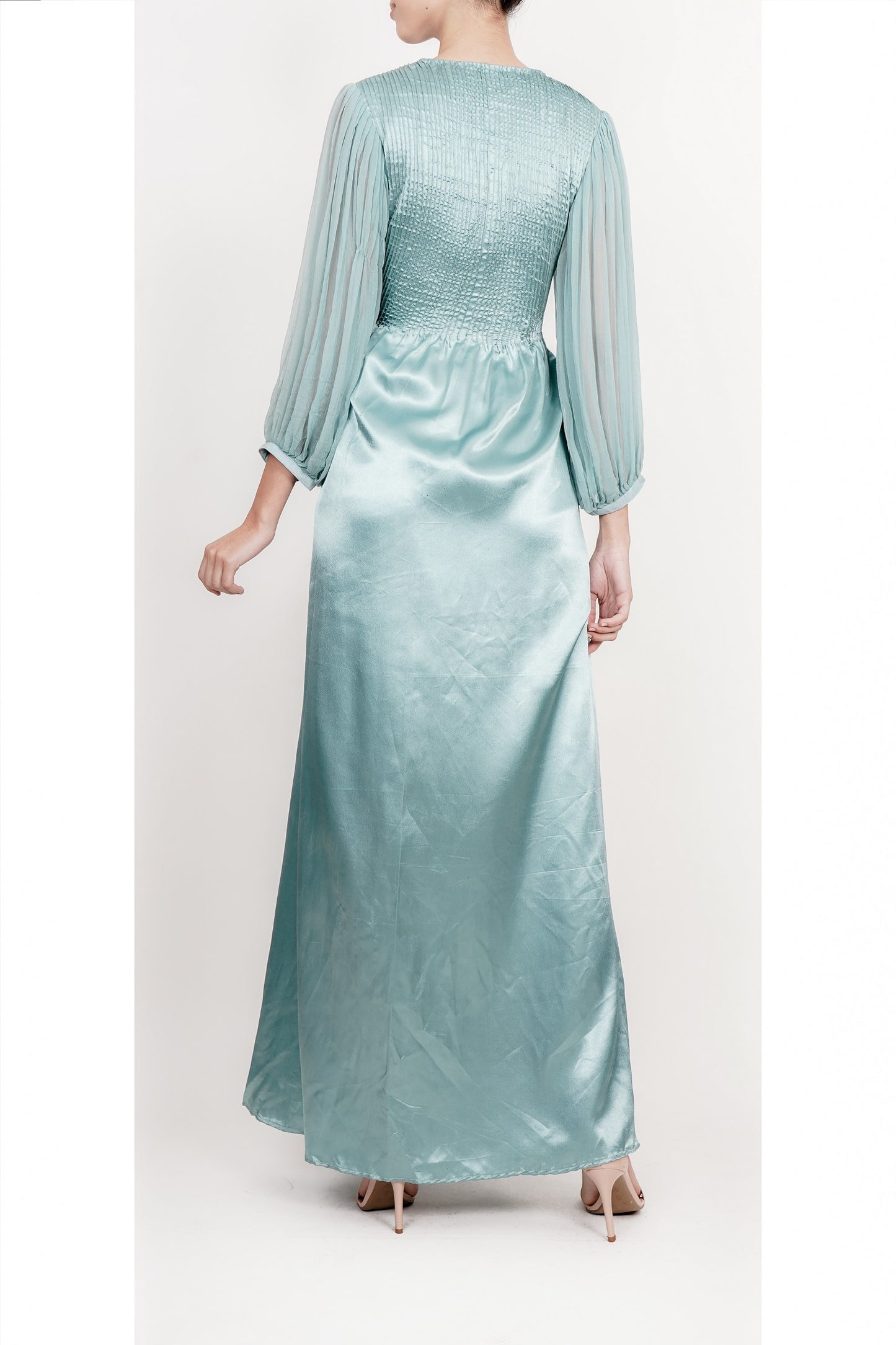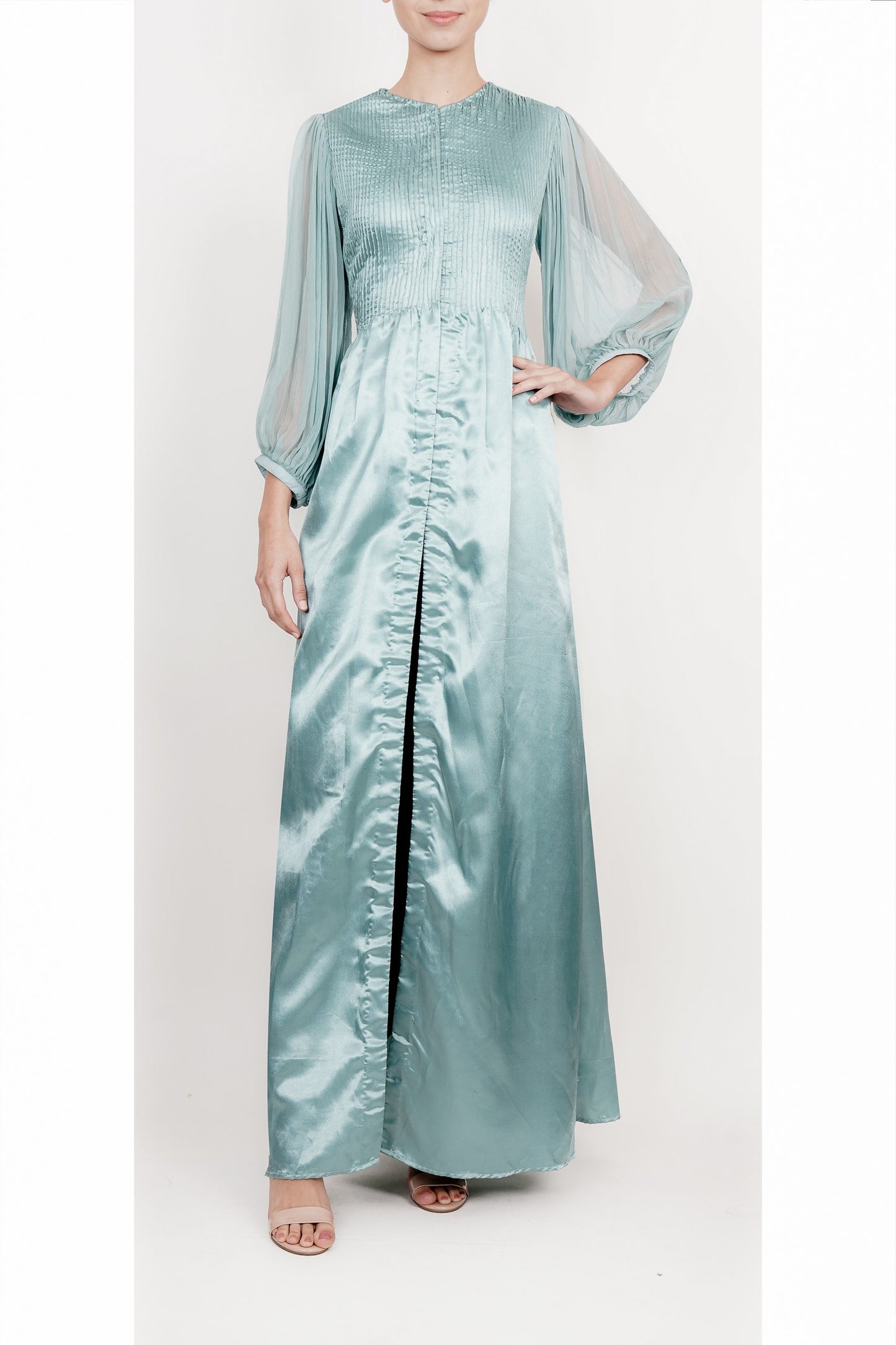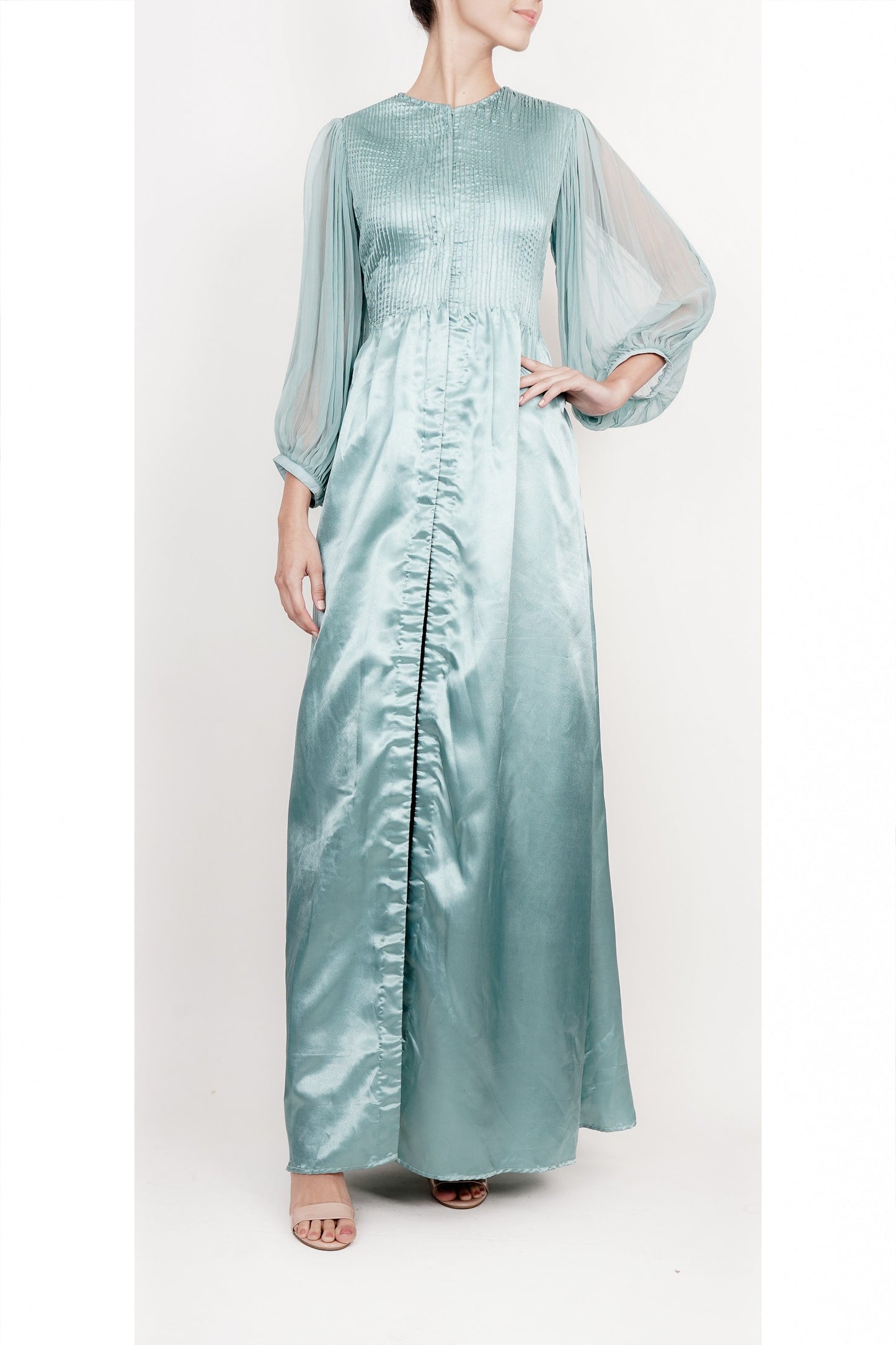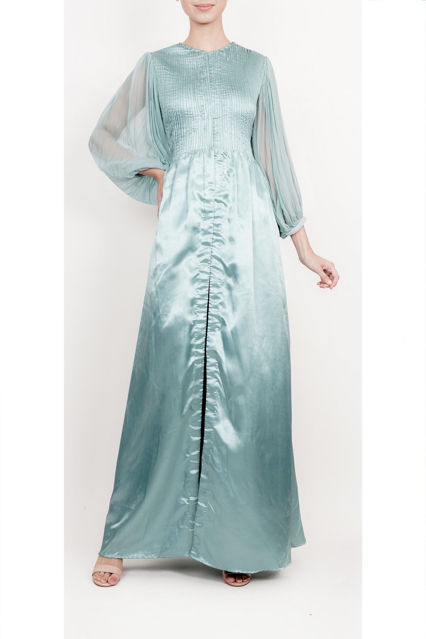 Make a mesmerizing statement with this captivating teal cape ensemble, expertly crafted to showcase exceptional craftsmanship. The all-over floral, leaves, and butterfly embroidery, done with slightly neon threads, creates a truly unique and eye-catching effect. The flowing teal cape pairs perfectly with fitted satin pants, creating a dramatic and elegant silhouette. This ensemble is ideal for special occasions, red-carpet events, or adding a touch of glamour to your everyday look. The subtle neon accents add a modern twist, making this outfit a must-have for anyone who demands style and sophistication.