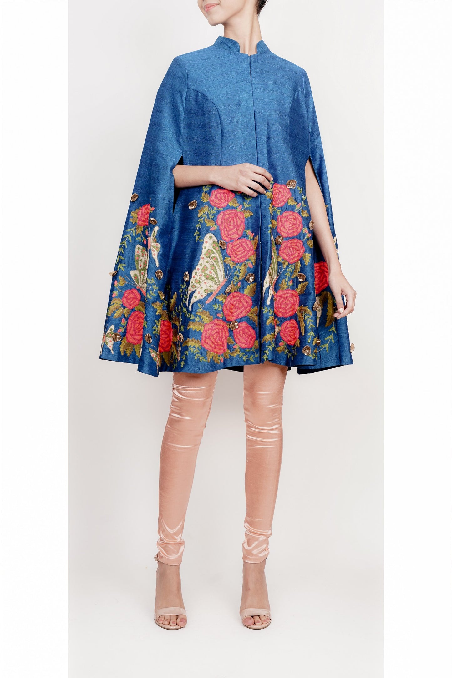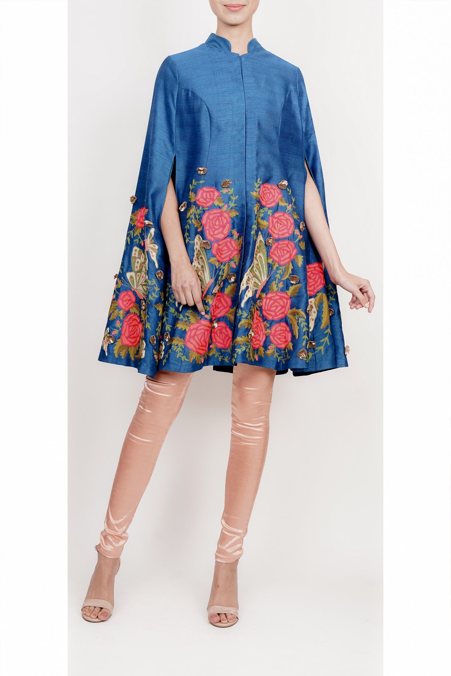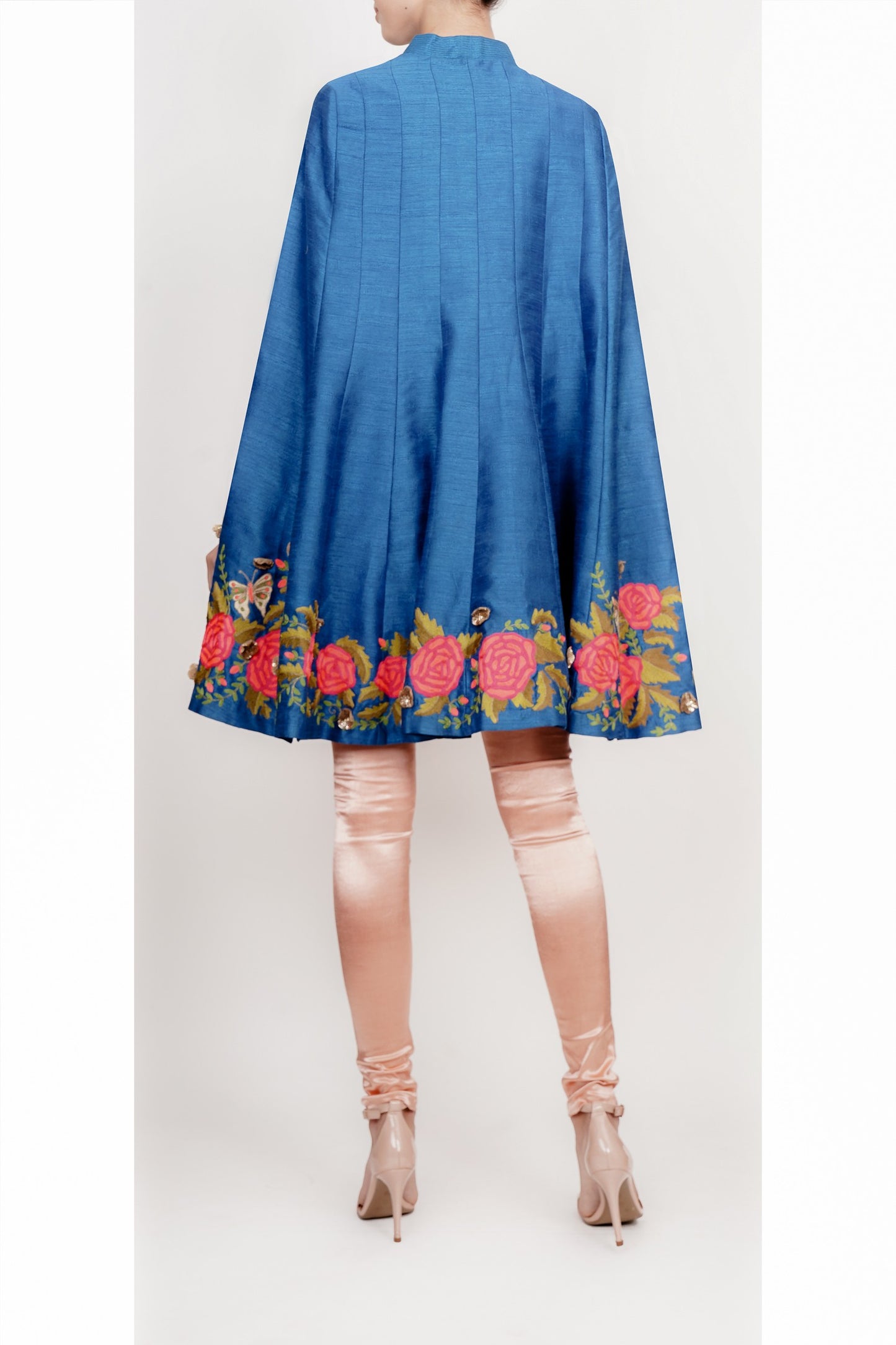 Add a touch of magic to your wardrobe with this enchanting teal cape, expertly crafted to transport you to a world of wonder. The all-over floral, leaves, and butterfly embroidery is a masterpiece of intricate craftsmanship, featuring slightly neon threads that add a modern twist. The cape's flowing silhouette creates a dramatic effect, perfect for making a statement. Paired with fitted satin pants, this ensemble is ideal for special occasions or adding a touch of whimsy to your everyday look. The combination of teal, florals, and neon threads creates a truly eye-catching effect, making this cape a must-have for anyone who dares to be different.
