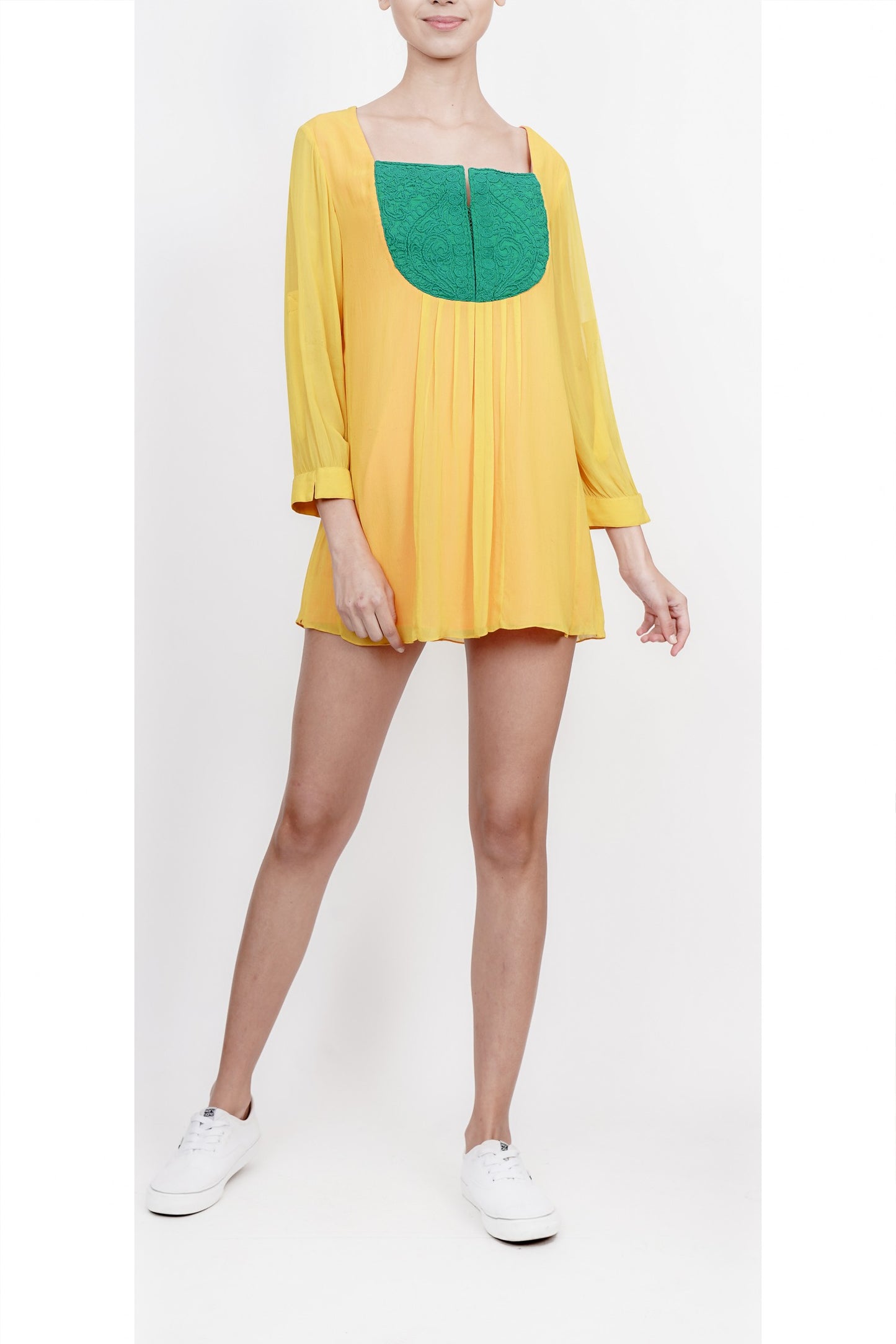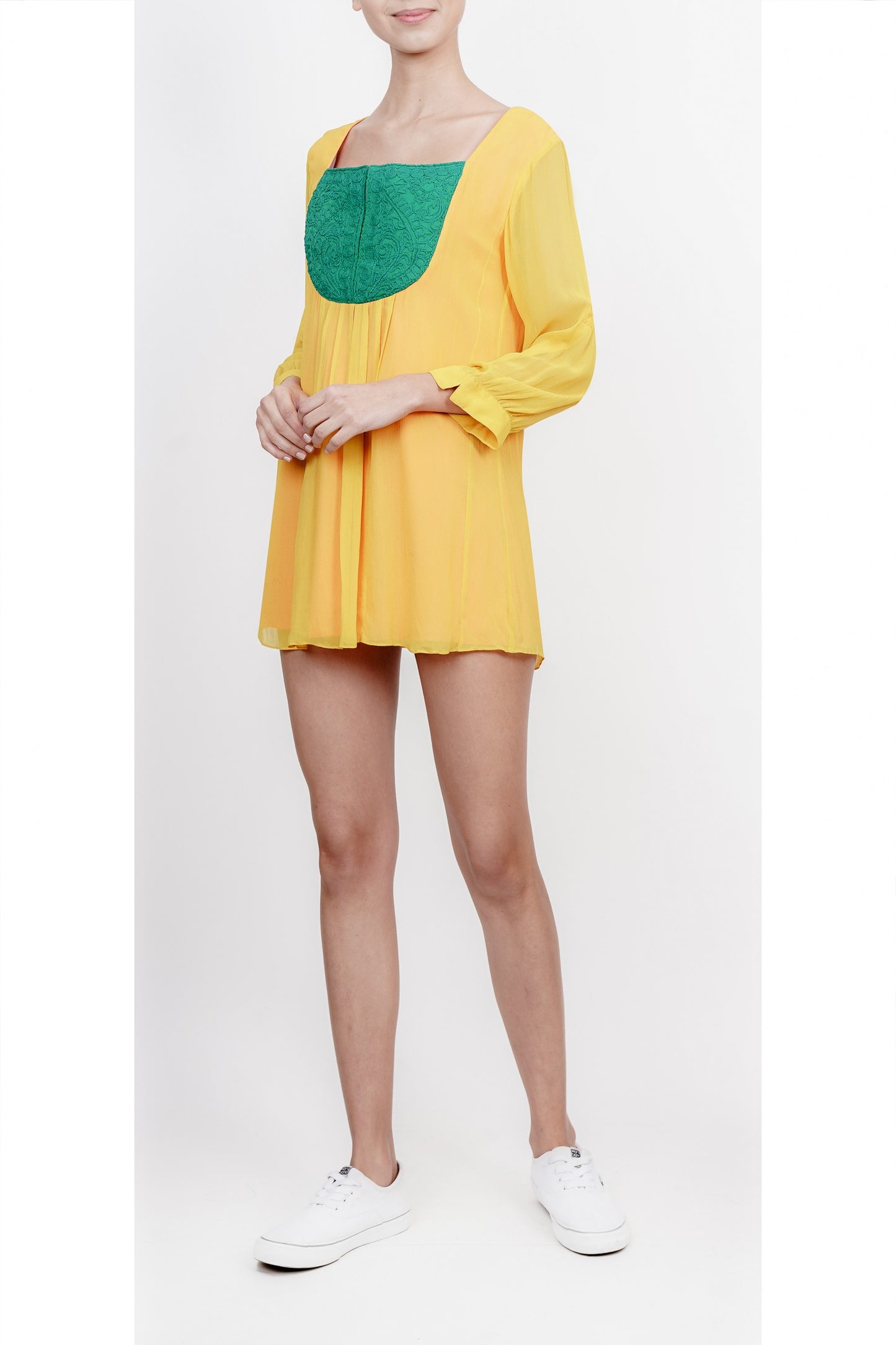 This stunning yellow georgette tunic is a perfect blend of vibrant elegance and exotic charm. The bright yellow hue is beautifully complemented by the green embroidered yoke, which adds a touch of sophistication and whimsy. The yoke is intricately embroidered with green chiffon fabric, featuring a captivating floral and oriental motif that adds depth and visual interest. The combination of yellow and green creates a striking contrast, reminiscent of a sunny day surrounded by lush foliage. Perfect for those who appreciate unique and eye-catching Indian fashion, this tunic is sure to make a statement.