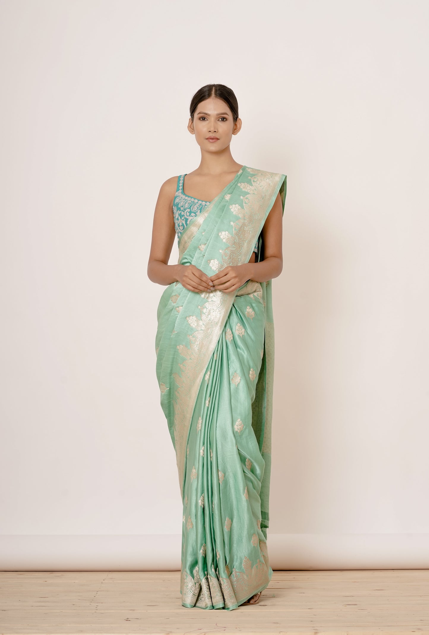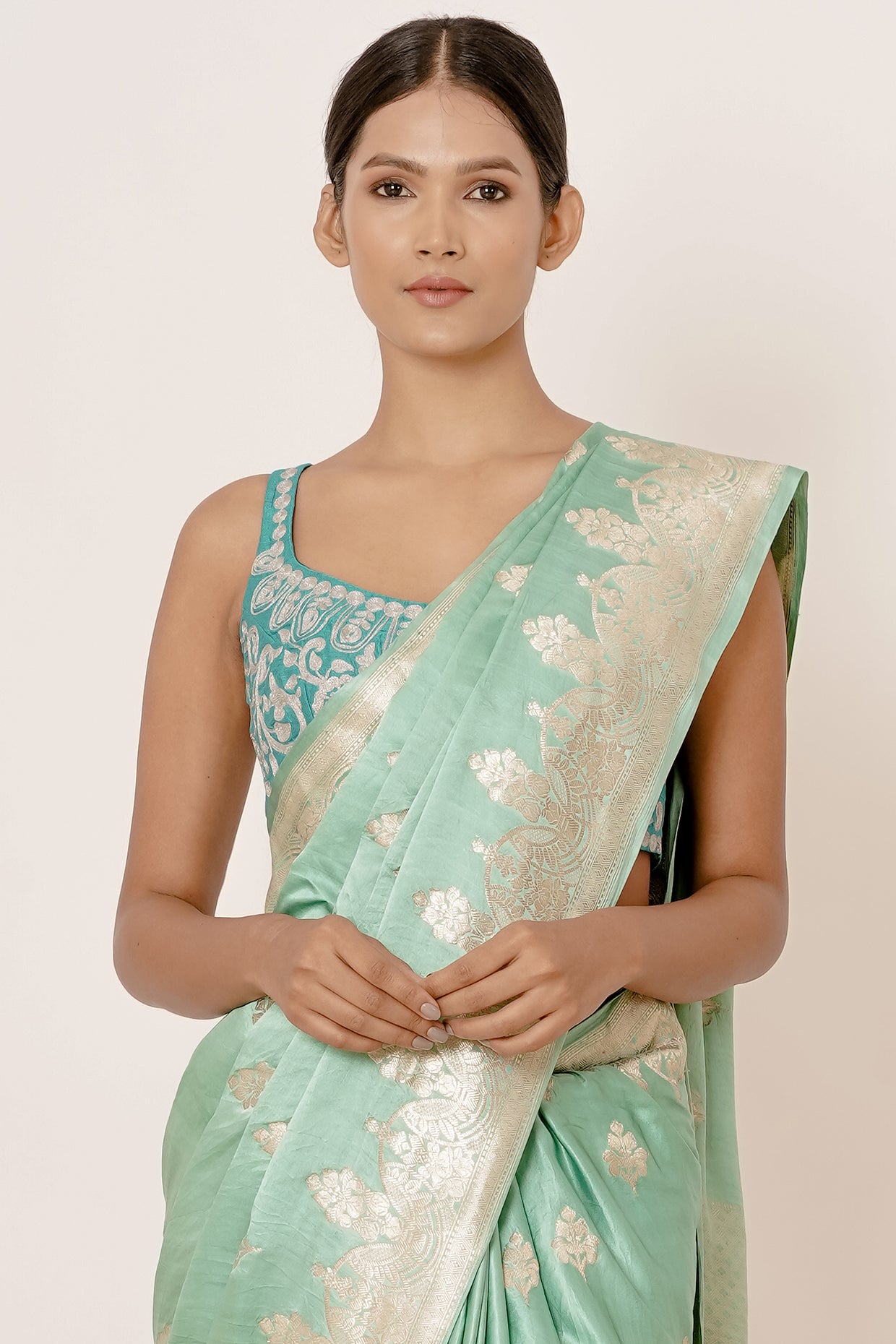 Make a statement with this breathtaking Aqua-Turquoise 100% pure Banarasi handwoven satin silk saree, featuring intricate silver zari motifs all over. The border boasts thick, intricate zari work, adding a touch of luxury and sophistication. The accompanying turq blouse is adorned with all-over silver zari embroidery, perfectly complementing the saree. This masterpiece is perfect for special occasions, weddings, or formal events, where you want to shine with elegance and poise.