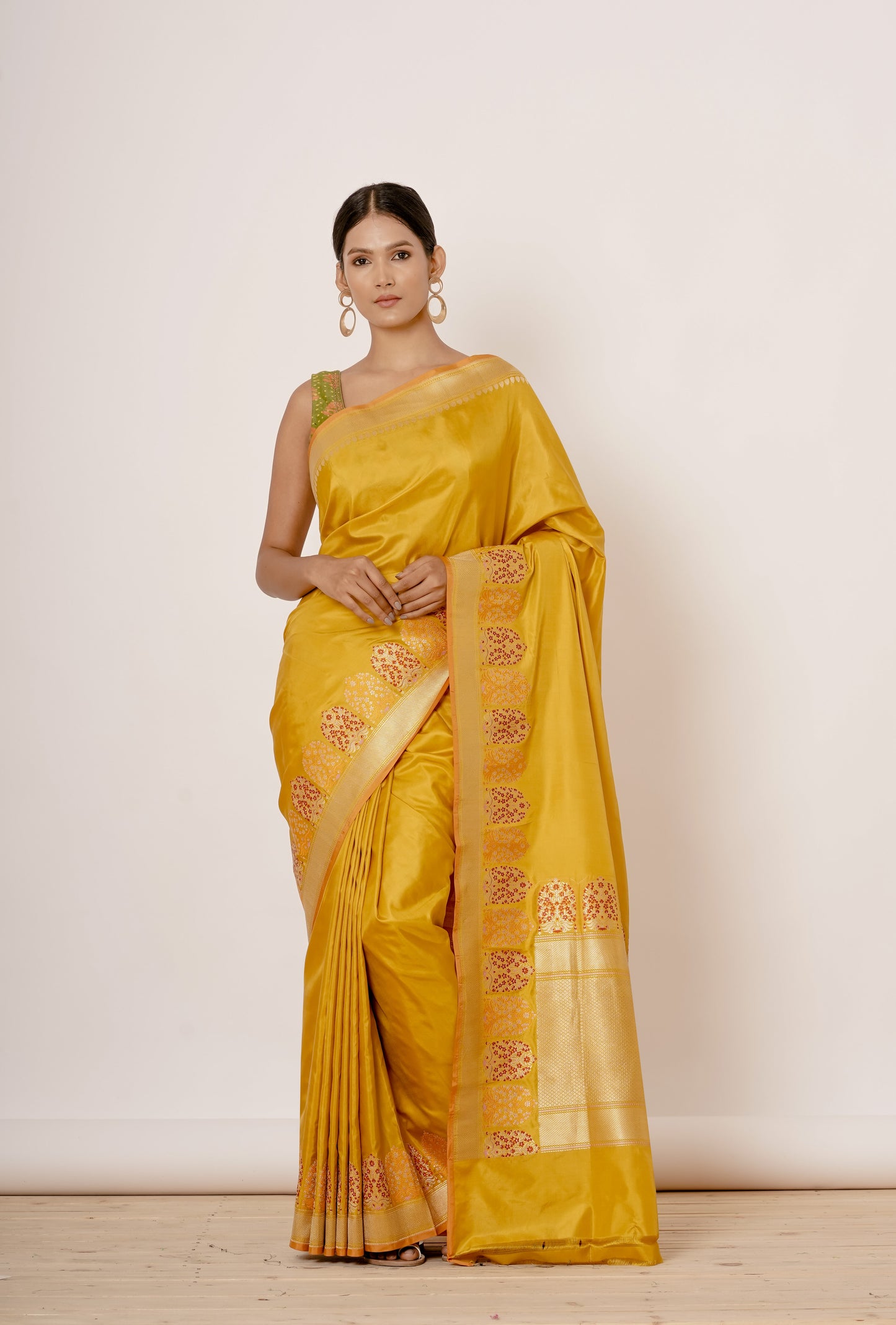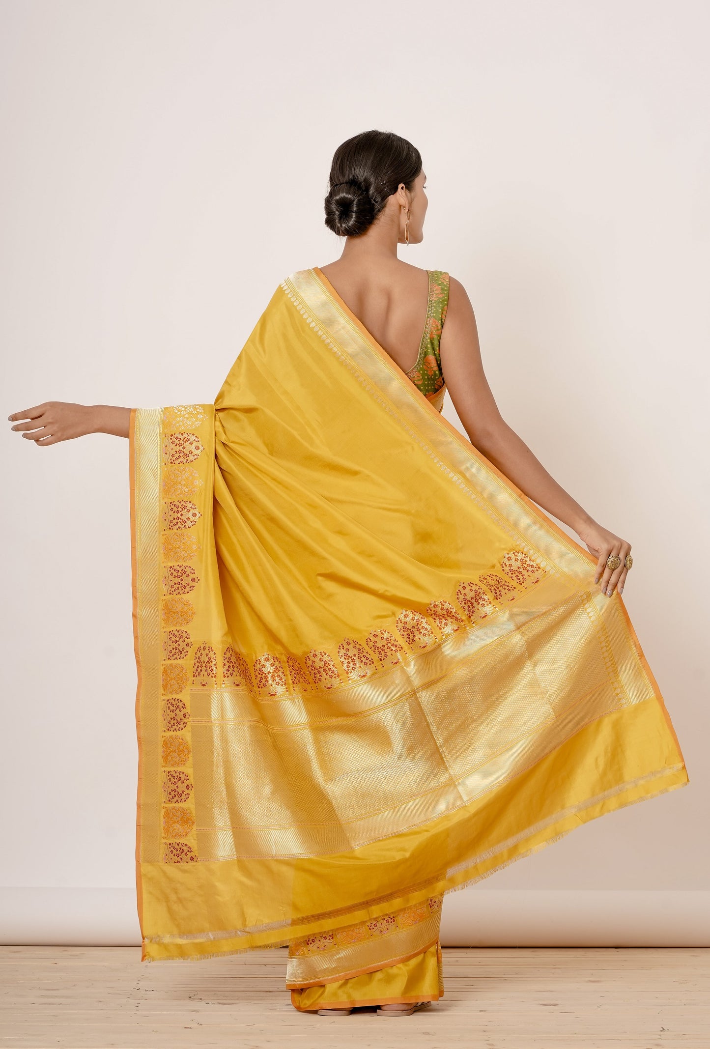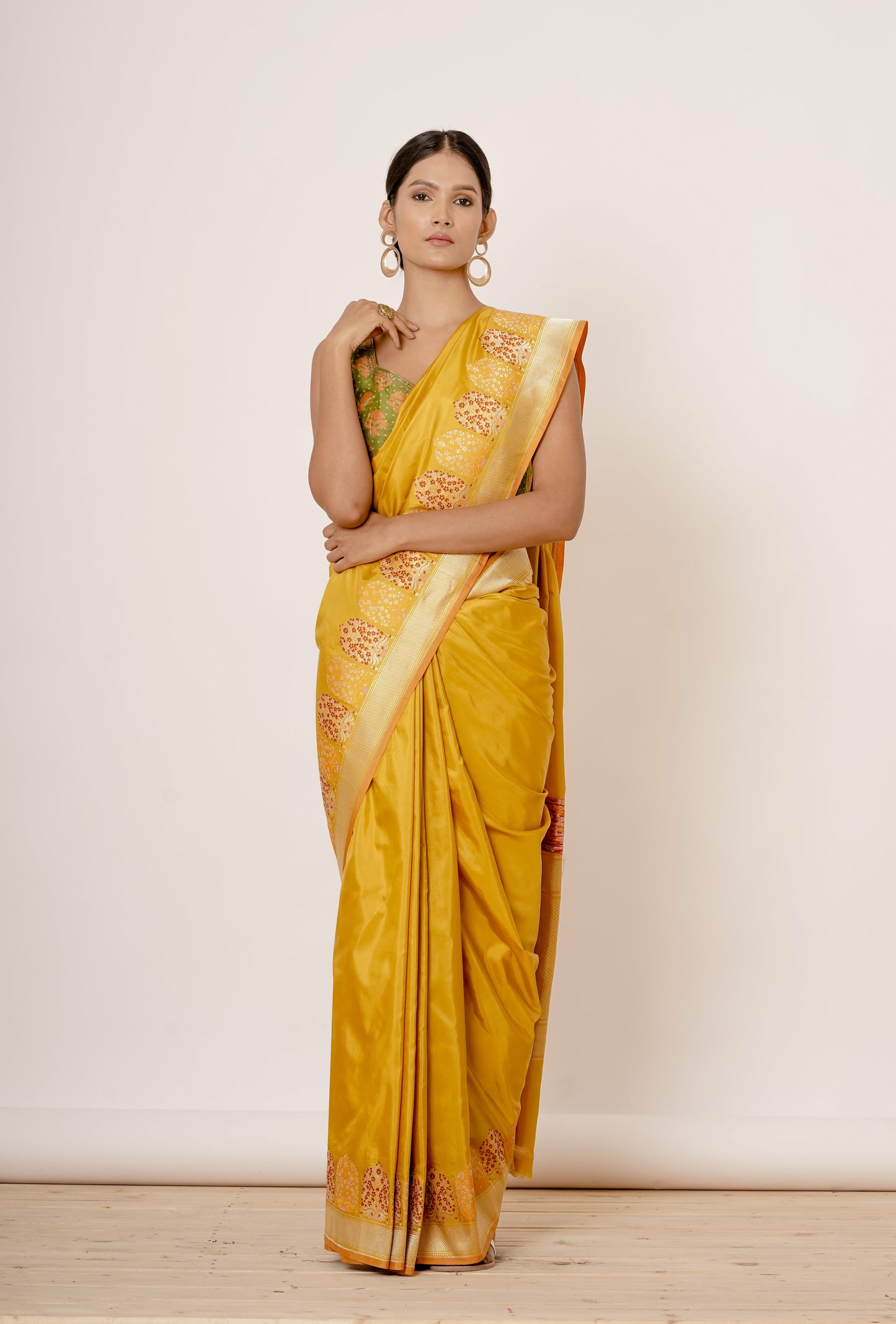 Mustard Yellow Banarasi Silk Saree with Green Blouse
