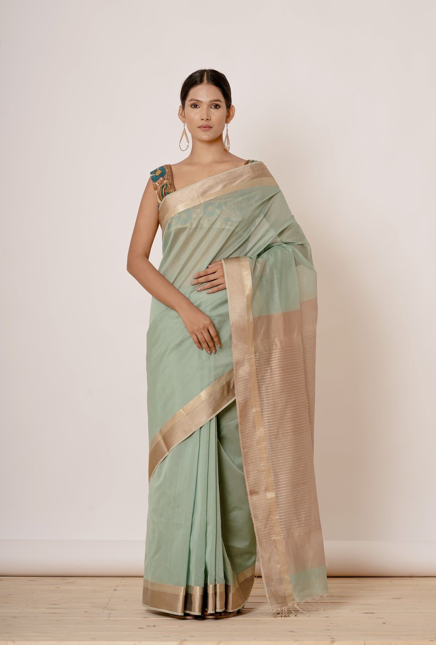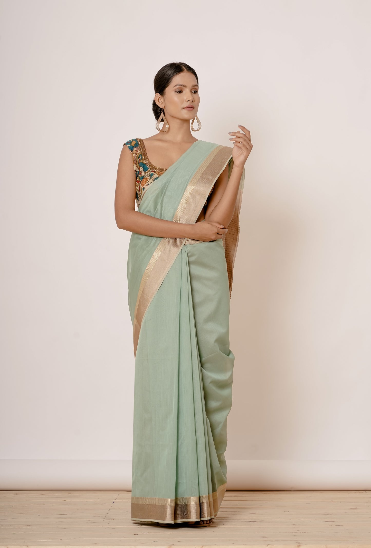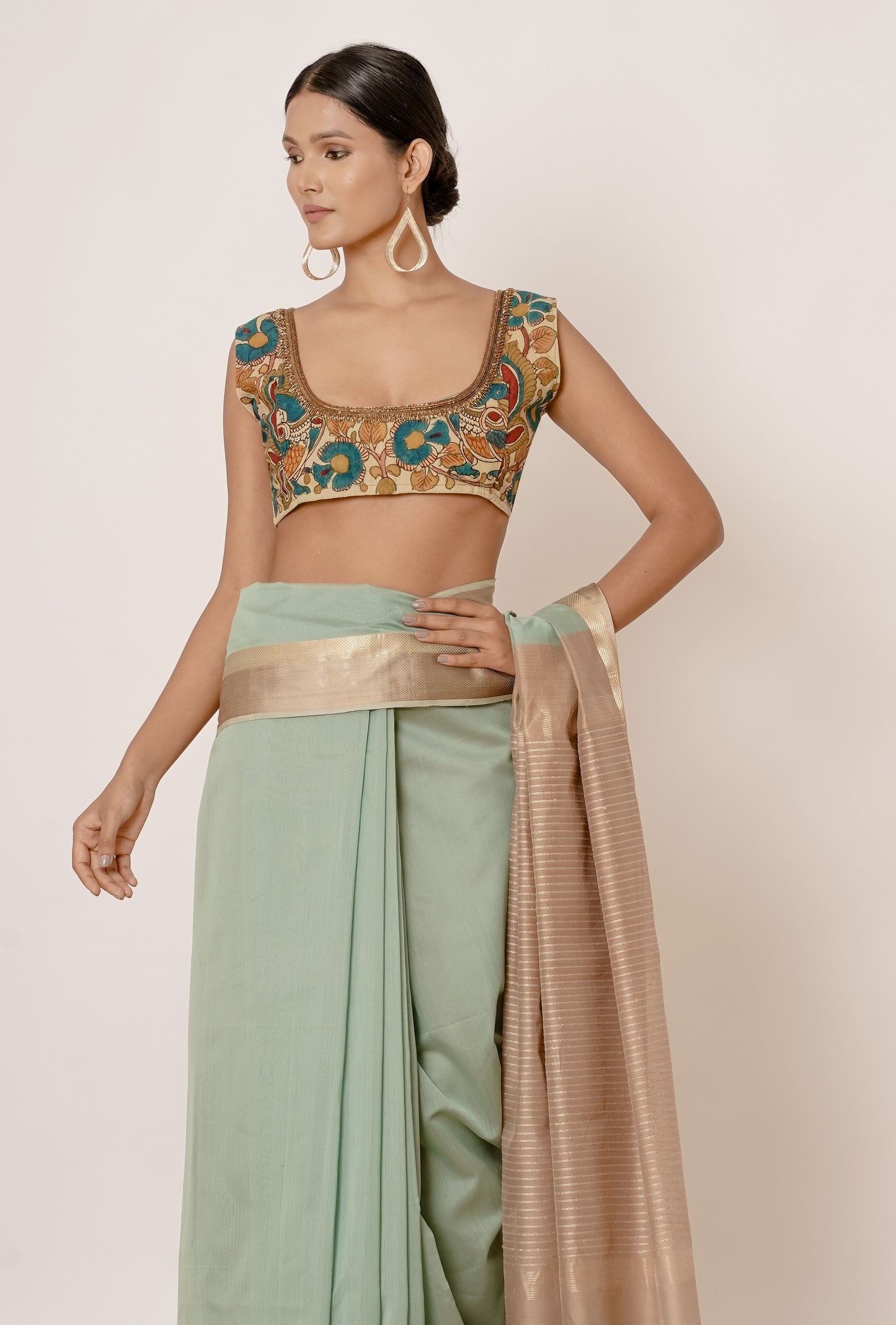 Dusty Turqoise Maheshwari Sari with Handpainted Kalamkari Blouse