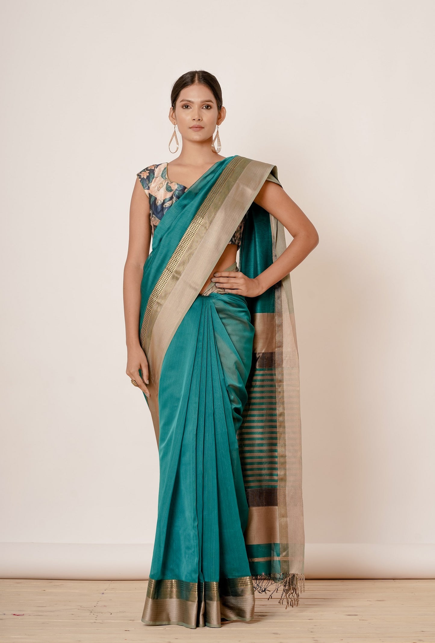 Teal Maheshwari Silk Saree with Digital Printed Blouse