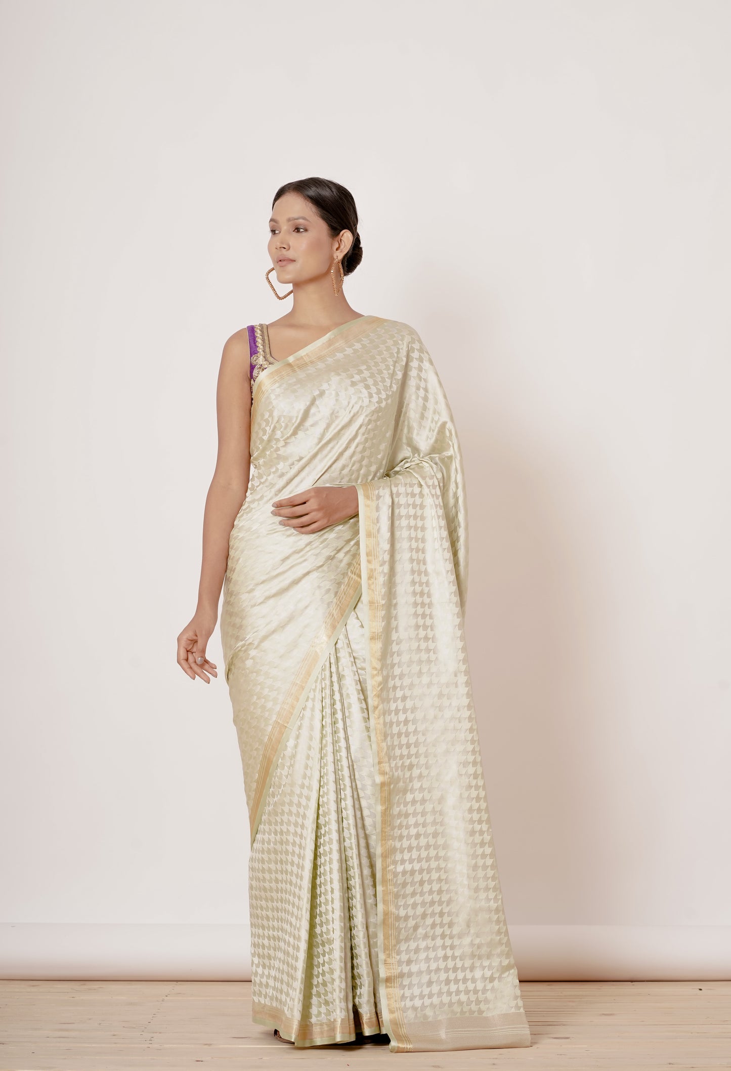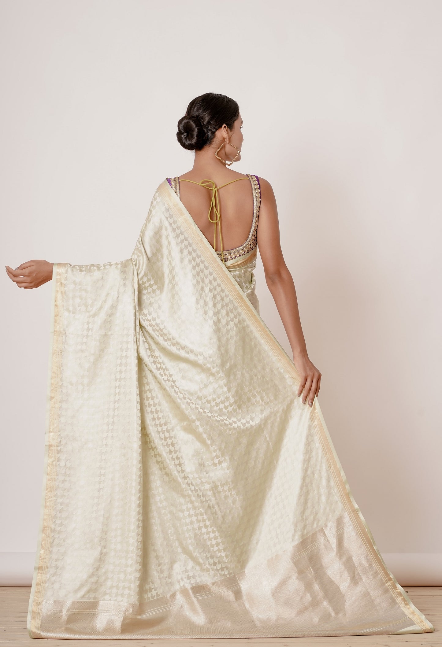 Ivory Banarasi Silk Saree with Violet Gold Zari Embroidered Blouse