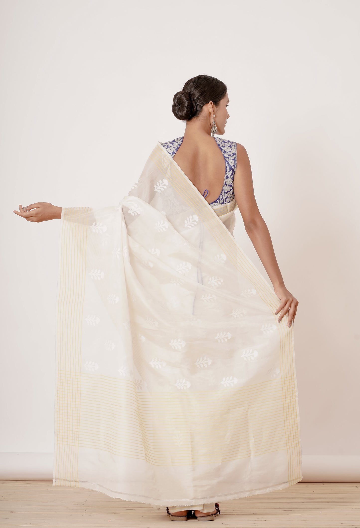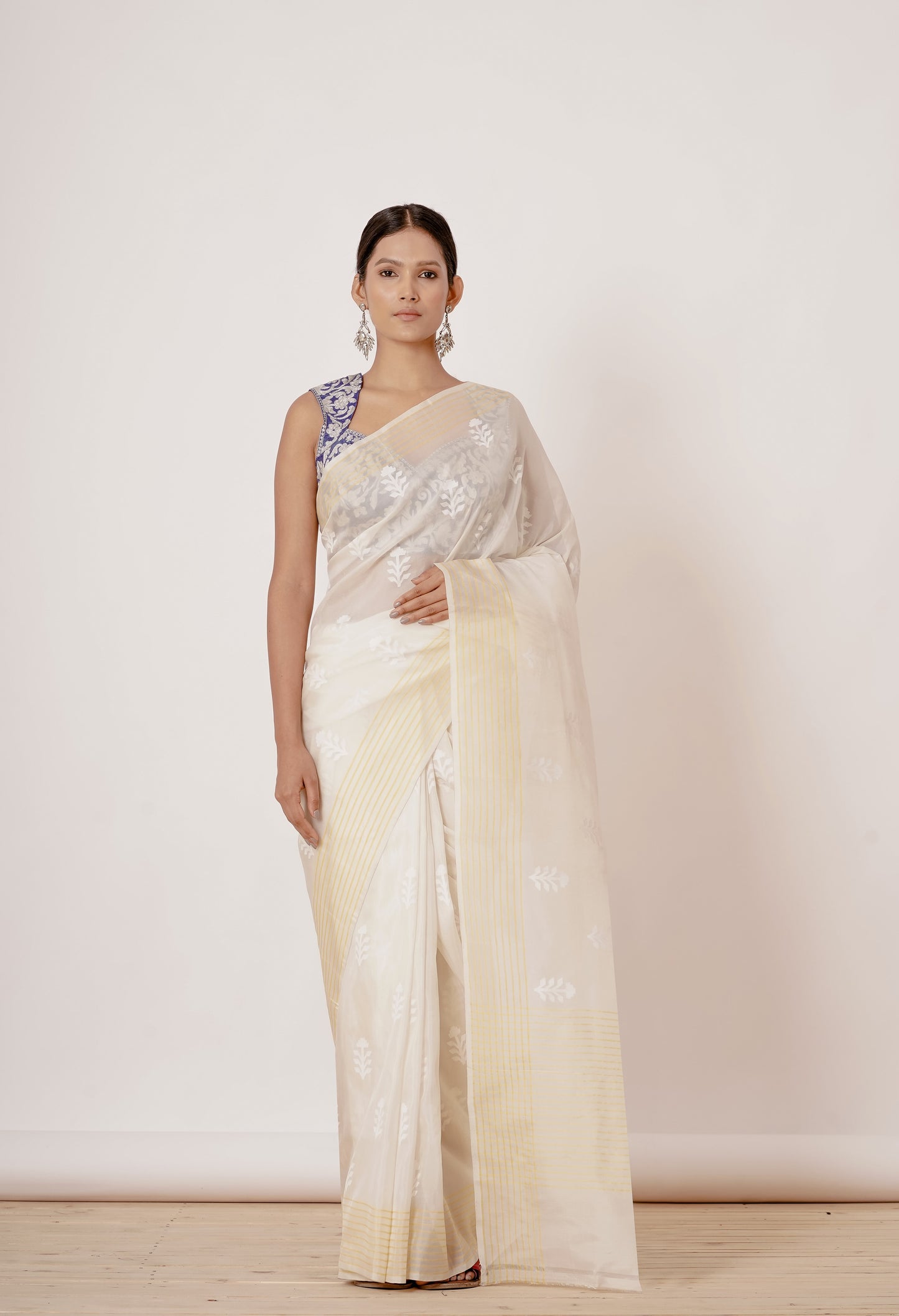 Experience the beauty of understated elegance with this cream organza saree in silk, featuring a subtle yet striking border with yellow horizontal stripes. The accompanying blue blouse is adorned with intricate silver zari embroidery all over, adding a touch of luxury and sophistication to the ensemble. The combination of the saree's simplicity and the blouse's ornate details creates a perfect balance of elegance and glamour, making it perfect for special occasions, weddings, or formal events.