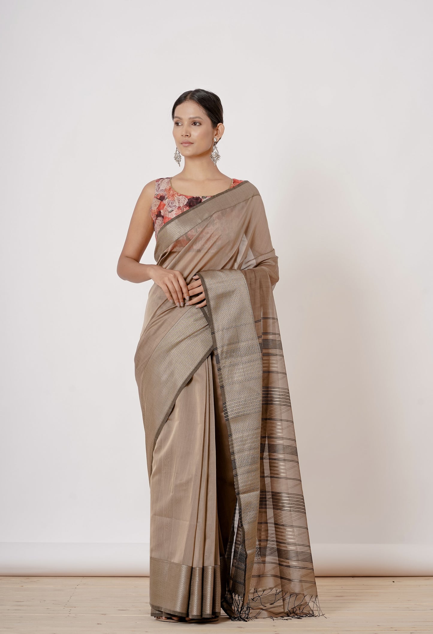 Dusty Gold Maheshwari Silk Saree with Orange Digitally