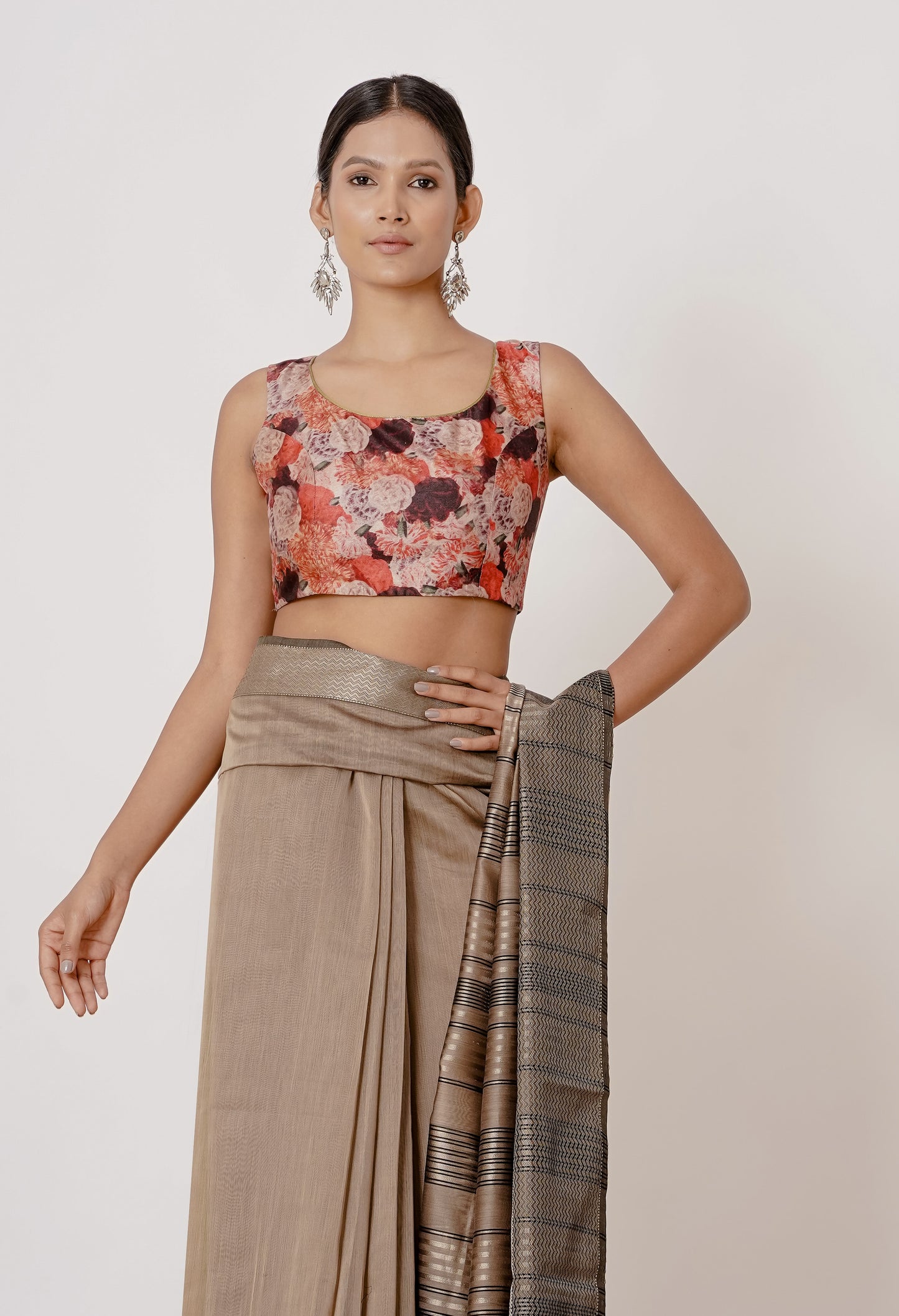 Experience the epitome of luxury and sophistication with this stunning dusty gold Maheshwari silk saree, featuring a thick, intricate zari border that exudes opulence and glamour. The accompanying floral digital printed blouse adds a touch of modernity and whimsy, perfectly complementing the saree's classic design. The combination of the saree's rich, sun-kissed hue and the blouse's vibrant floral print creates a truly show-stopping ensemble, perfect for special occasions, weddings, or formal events where you want to make a statement.