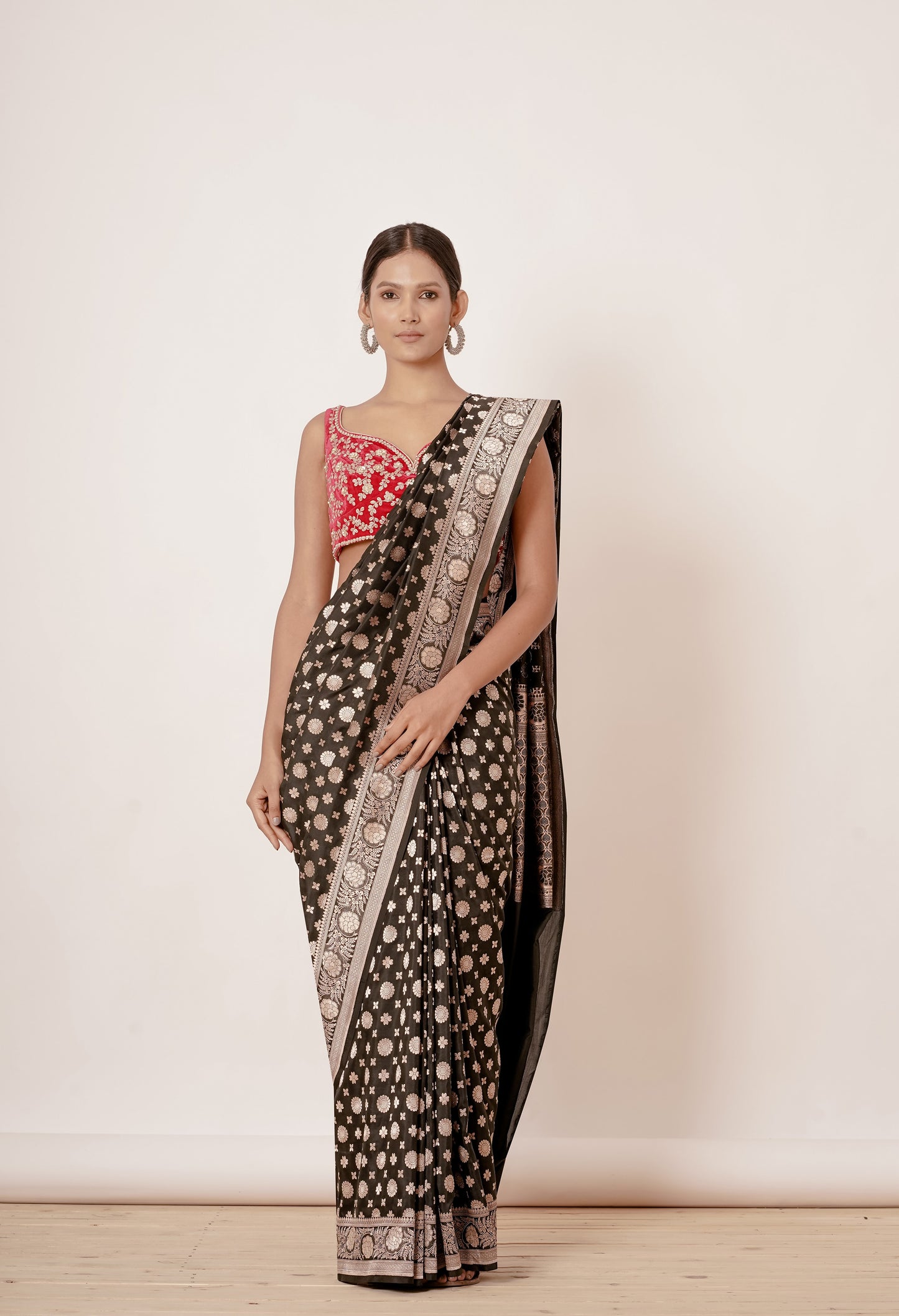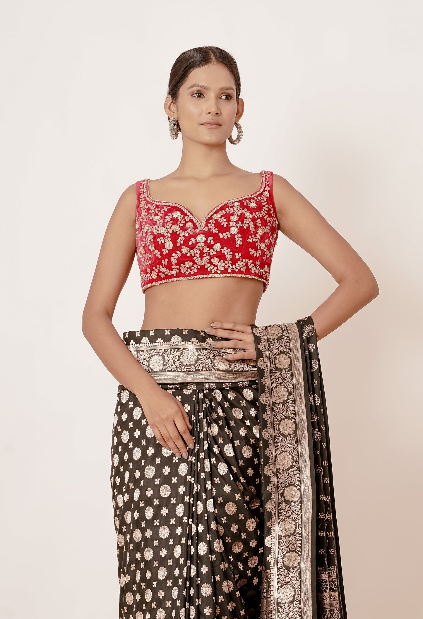 Black Banarasi Silk Saree with Silver Bootas all over and Velvet Red Blouse