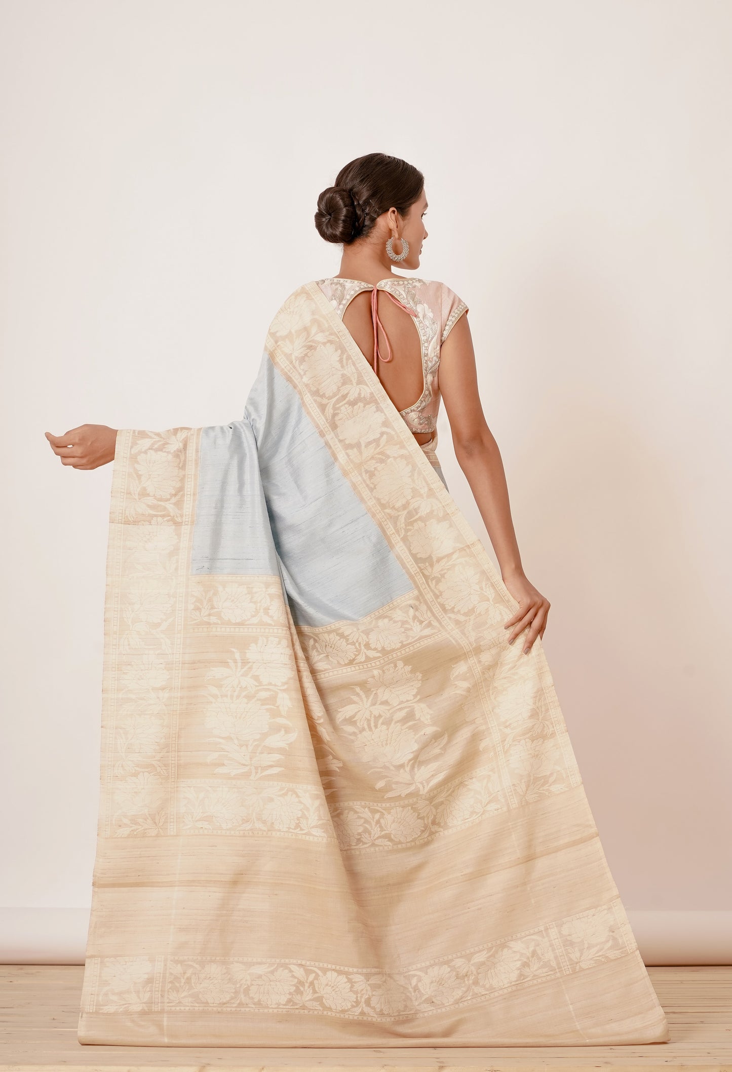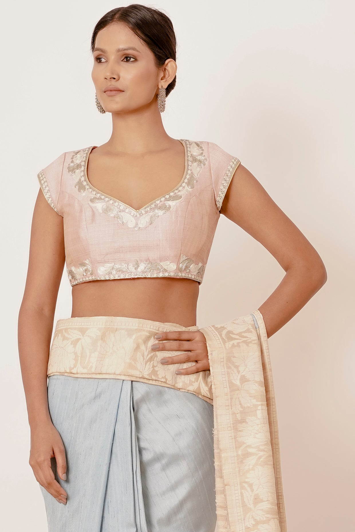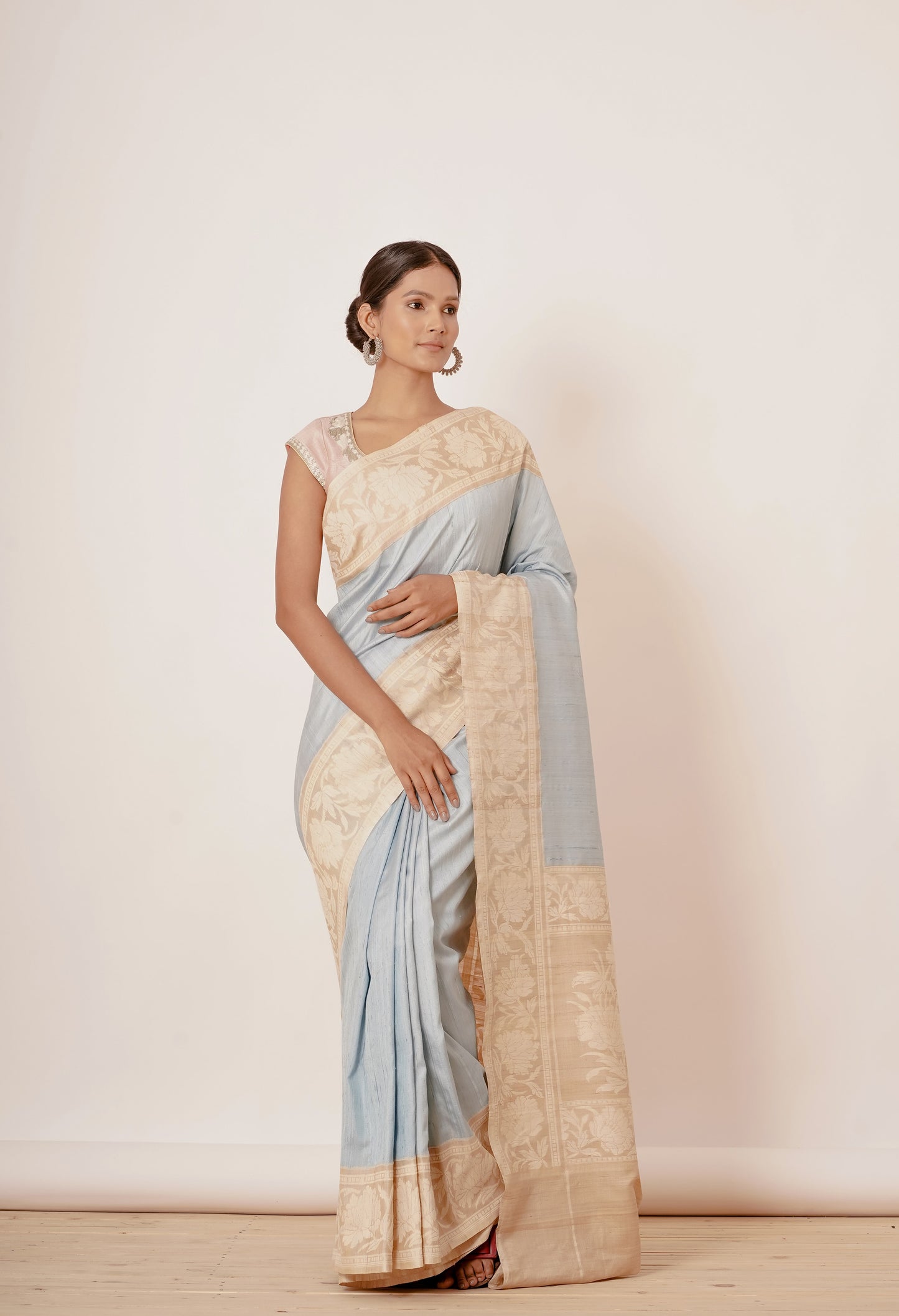 Be enchanted by this captivating light blue Banarasi silk saree, featuring a thick, intricate beige border that adds a touch of warmth and sophistication. The accompanying light rose blouse boasts cap sleeves and exquisite zari embroidery all over the neckline and sleeves, creating a romantic and whimsical effect. The combination of the saree's soft blue hue and the blouse's delicate rose color creates a truly ethereal visual effect, perfect for special occasions, weddings, or formal events where you want to exude grace and femininity.