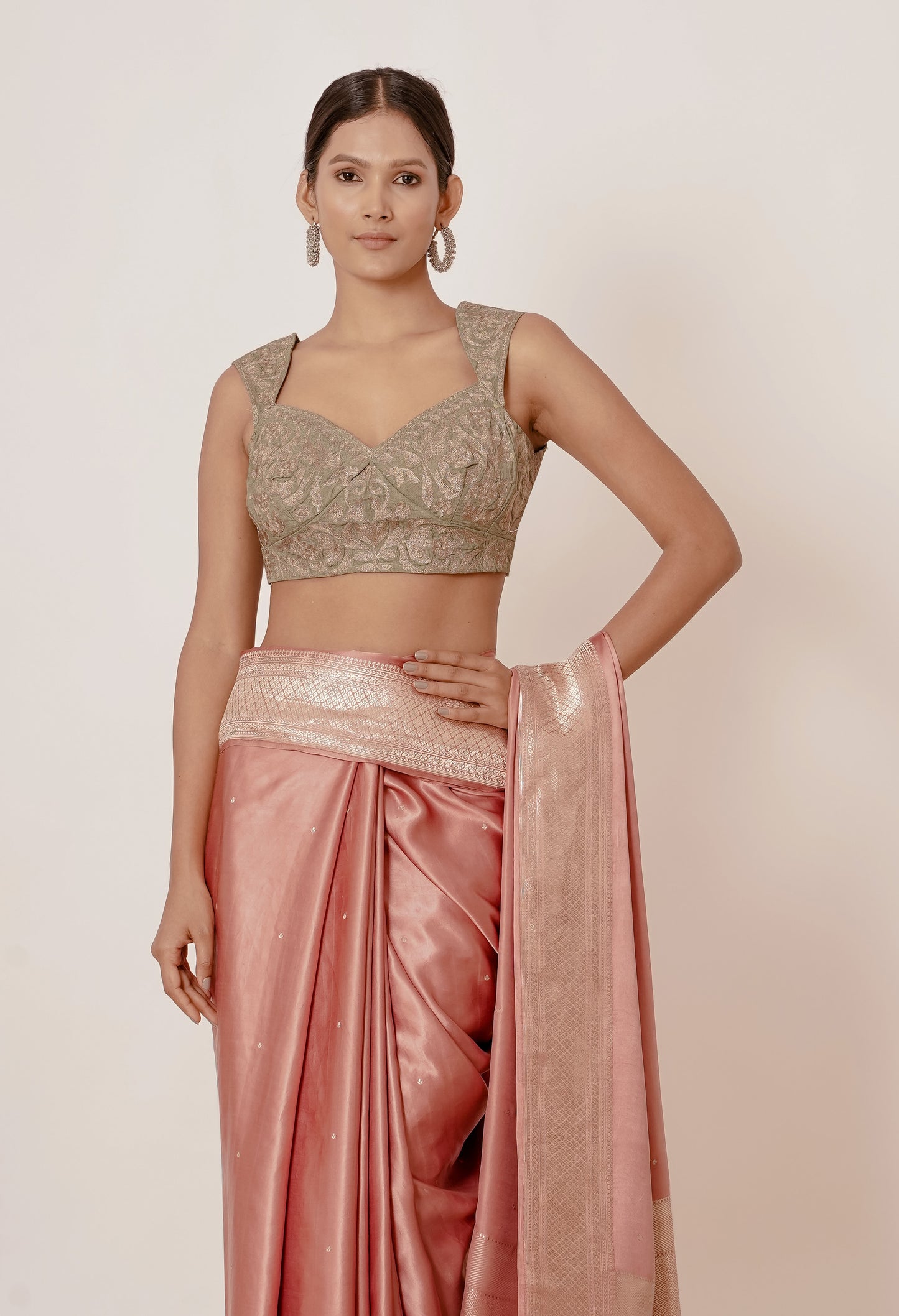 Experience the warmth and sophistication of this exquisite dusty peach Banarasi handwoven satin silk saree, adorned with small zari bootis all over and a thick, intricate border that adds a touch of luxury. The accompanying greyish-green blouse boasts all-over zari embroidery, creating a stunning contrast and adding to the overall elegant charm of the ensemble. The combination of the saree's soft, peachy hue and the blouse's muted green creates a truly unique and captivating visual effect, perfect for special occasions, weddings, or formal events where you want to exude warmth and poise.