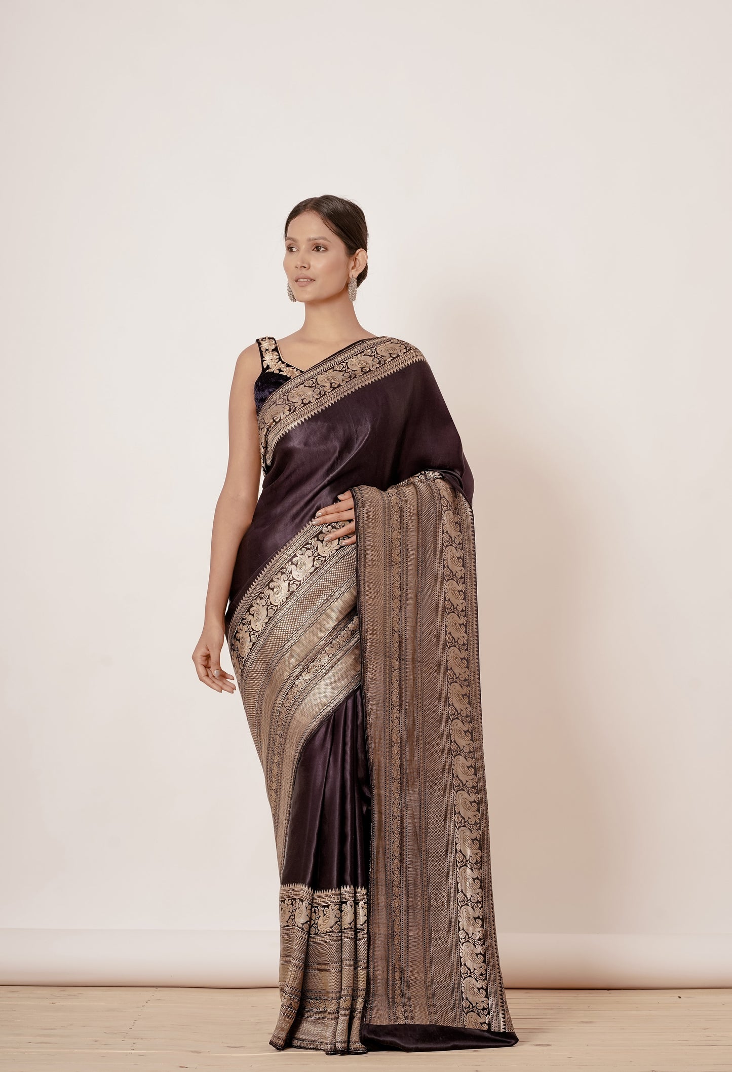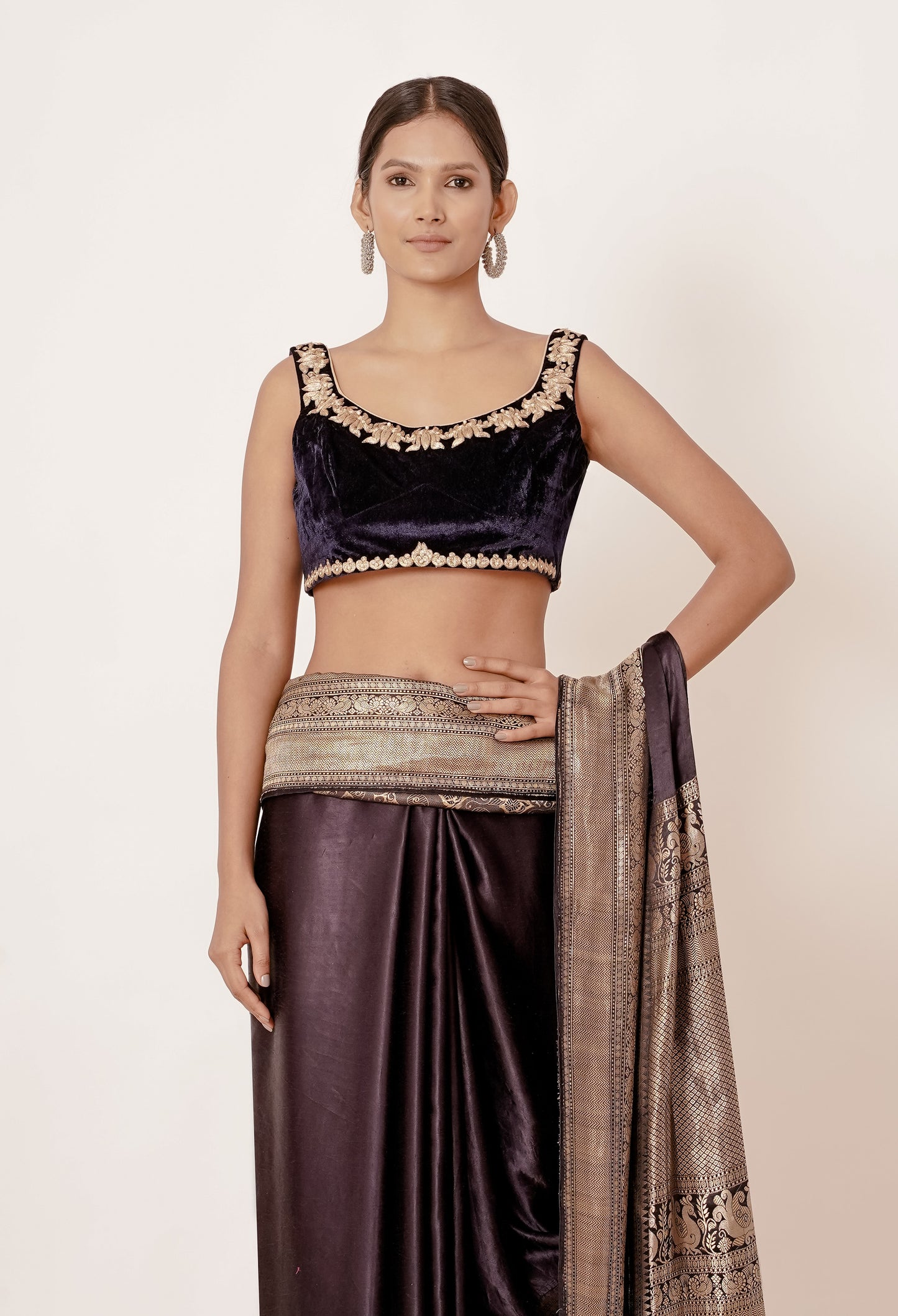 Coffee Dark Brown Black Banarasi Silk Saree with Velvet Coffee Blouse