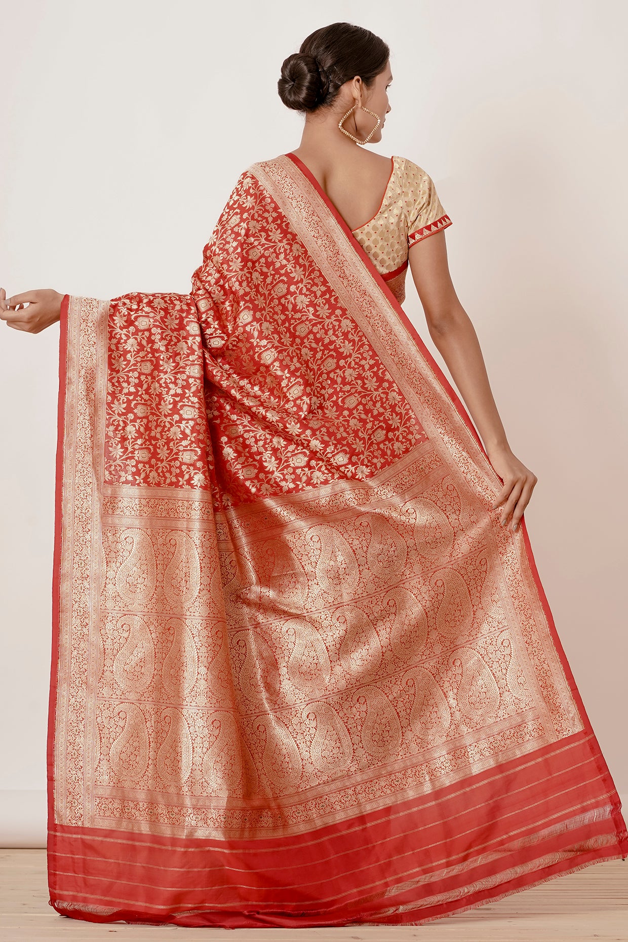 Red Ganarasi Silk Saree with Gold Backless Blouse