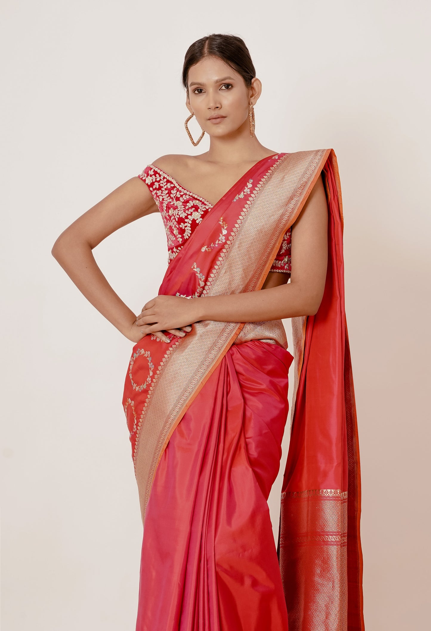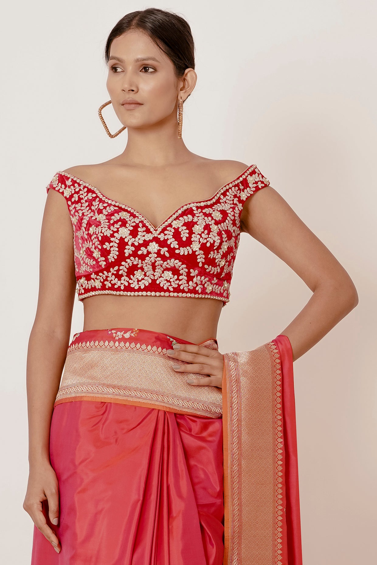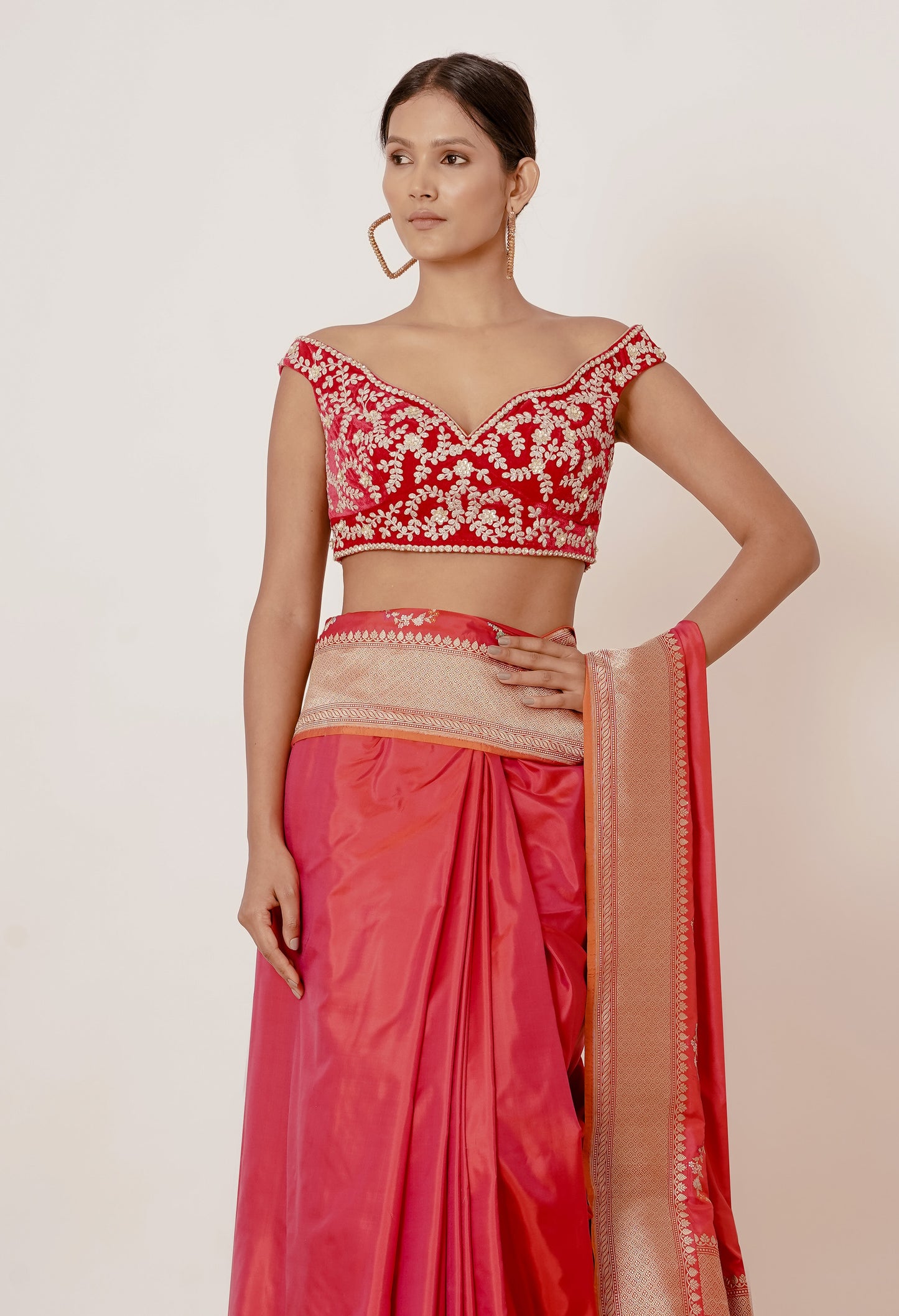 Be swept away by the romantic charm of this stunning red-pink Banarasi silk saree, featuring a thick, intricate border and circular floral zari motifs that evoke a sense of whimsy and wonder. The saree's beautiful border is perfectly complemented by the delicate motifs, creating a truly eye-catching visual effect. The accompanying off-shoulder velvet blouse boasts all-over zari embroidery, adding a touch of luxury and sophistication to the ensemble. The combination of the saree's soft, feminine hue and the blouse's rich velvet fabric creates a truly captivating look that's perfect for special occasions, weddings, or formal events where you want to exude romance and elegance.