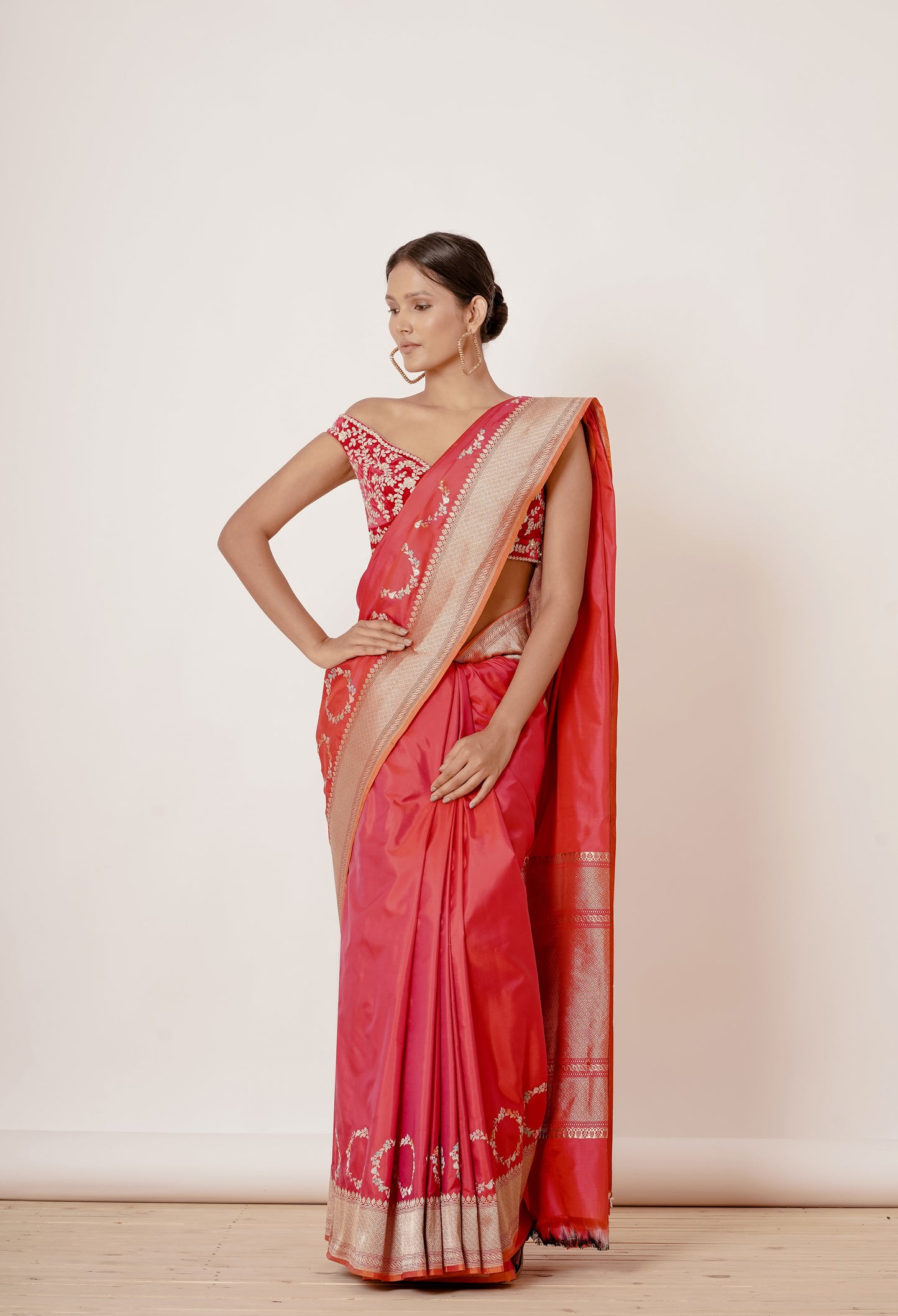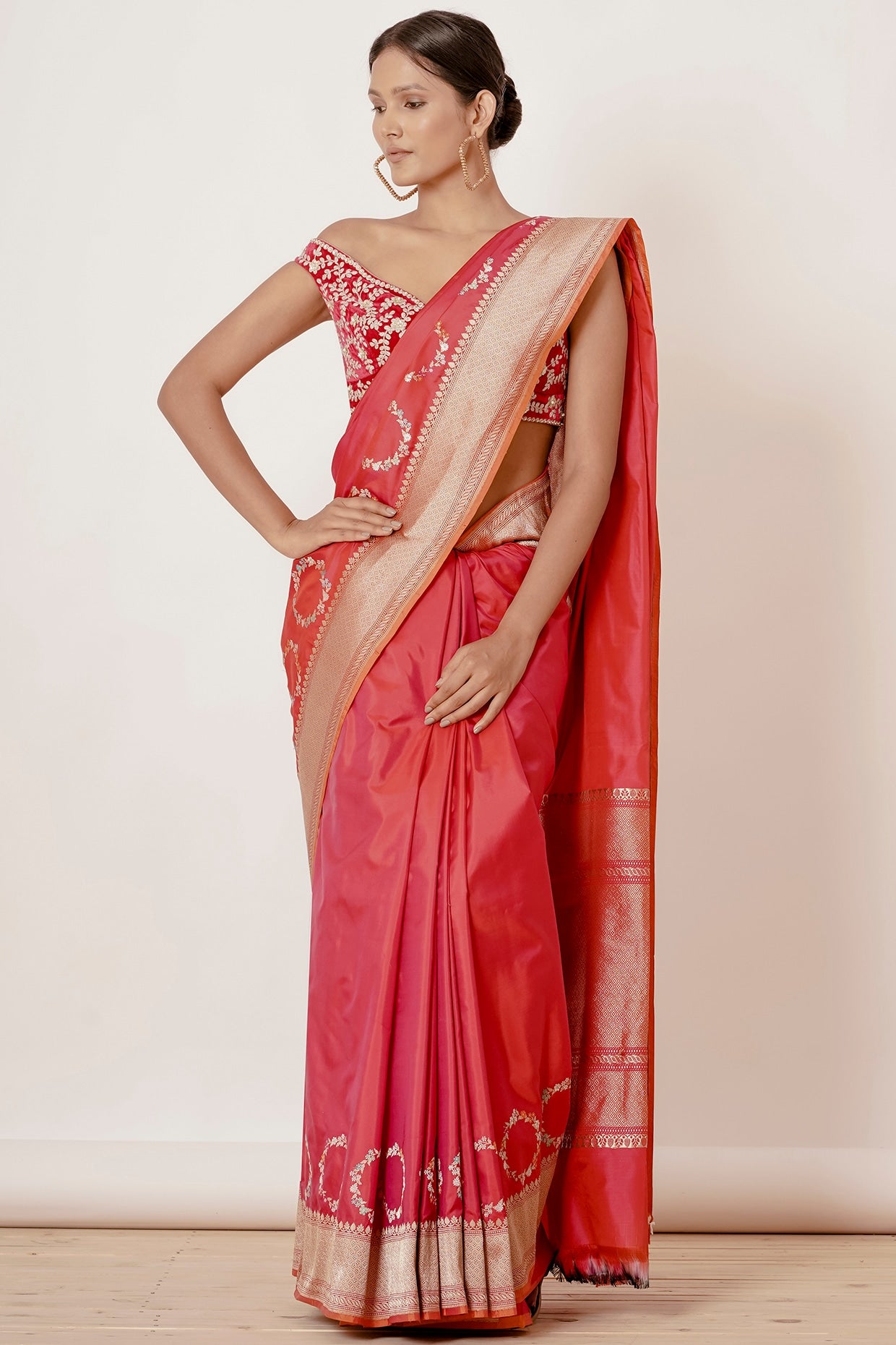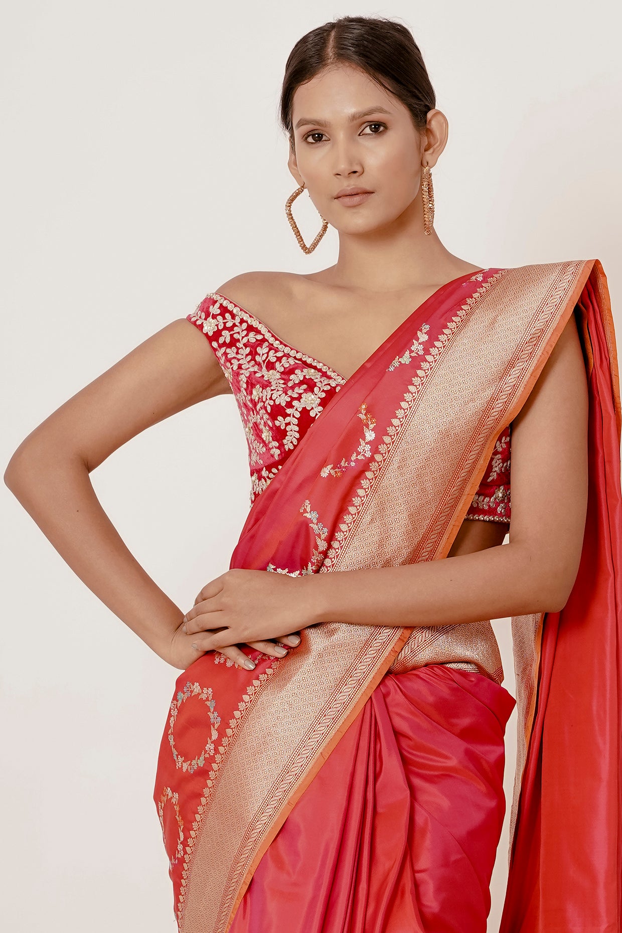 Be swept away by the romantic charm of this stunning red-pink Banarasi silk saree, featuring a thick, intricate border and circular floral zari motifs that evoke a sense of whimsy and wonder. The saree's beautiful border is perfectly complemented by the delicate motifs, creating a truly eye-catching visual effect. The accompanying off-shoulder velvet blouse boasts all-over zari embroidery, adding a touch of luxury and sophistication to the ensemble. The combination of the saree's soft, feminine hue and the blouse's rich velvet fabric creates a truly captivating look that's perfect for special occasions, weddings, or formal events where you want to exude romance and elegance.