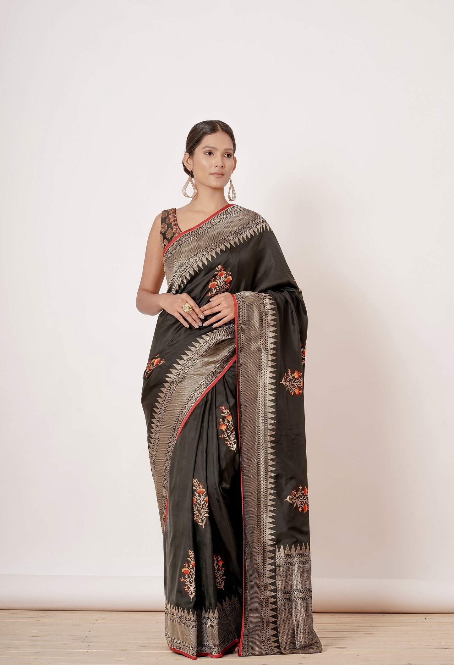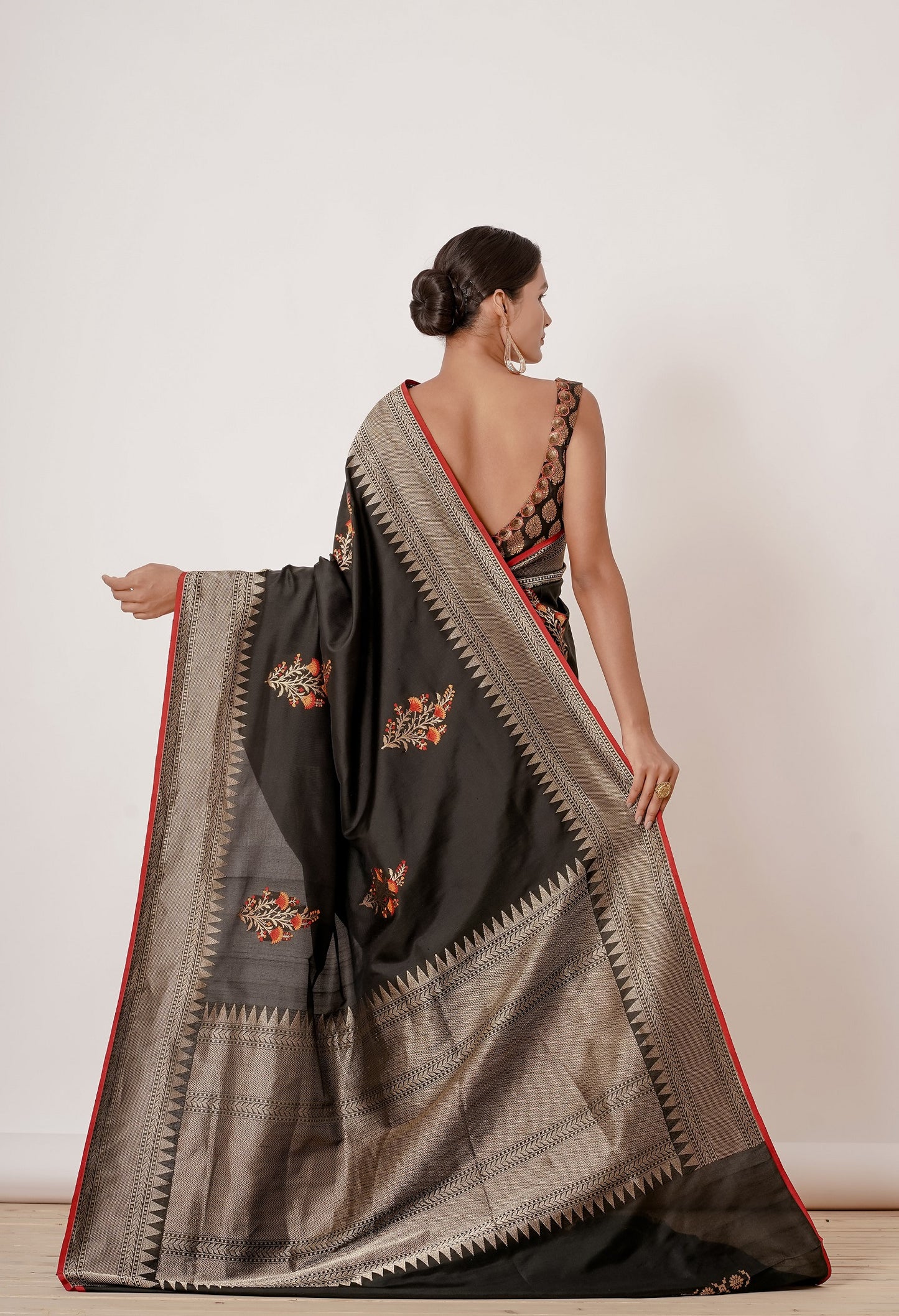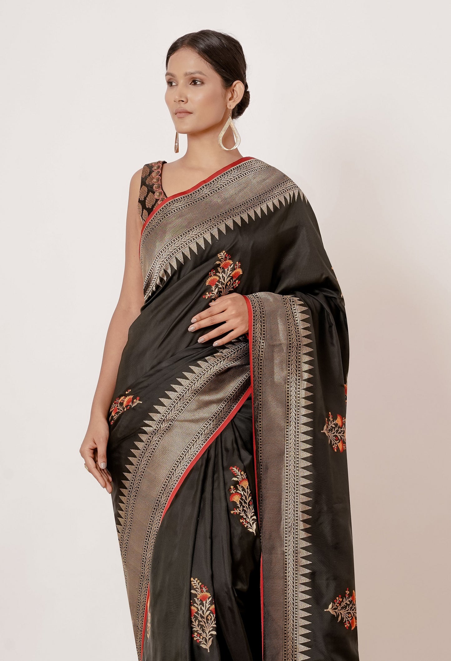 Black Banarasi Silk Saree with Floral Motifs all over and Black Brocade Blouse