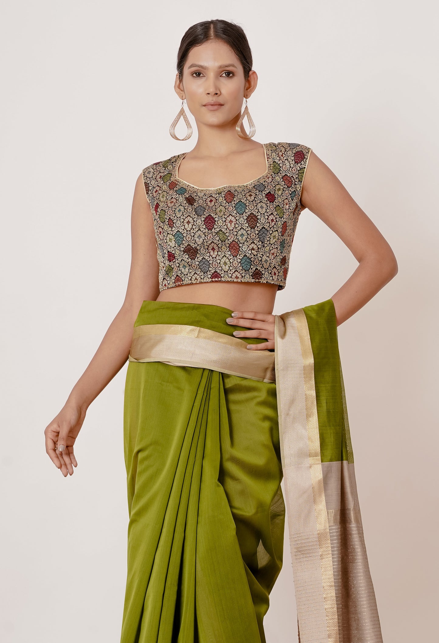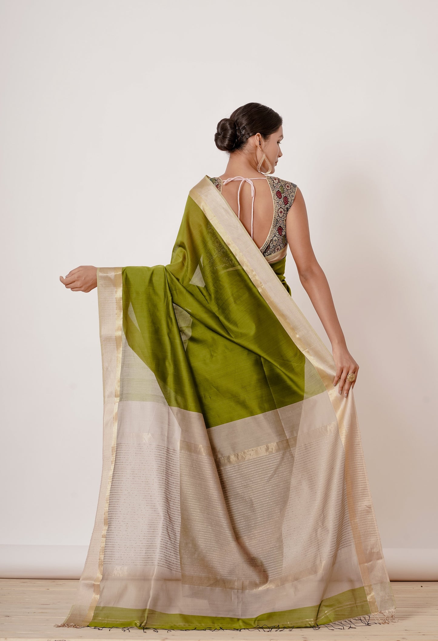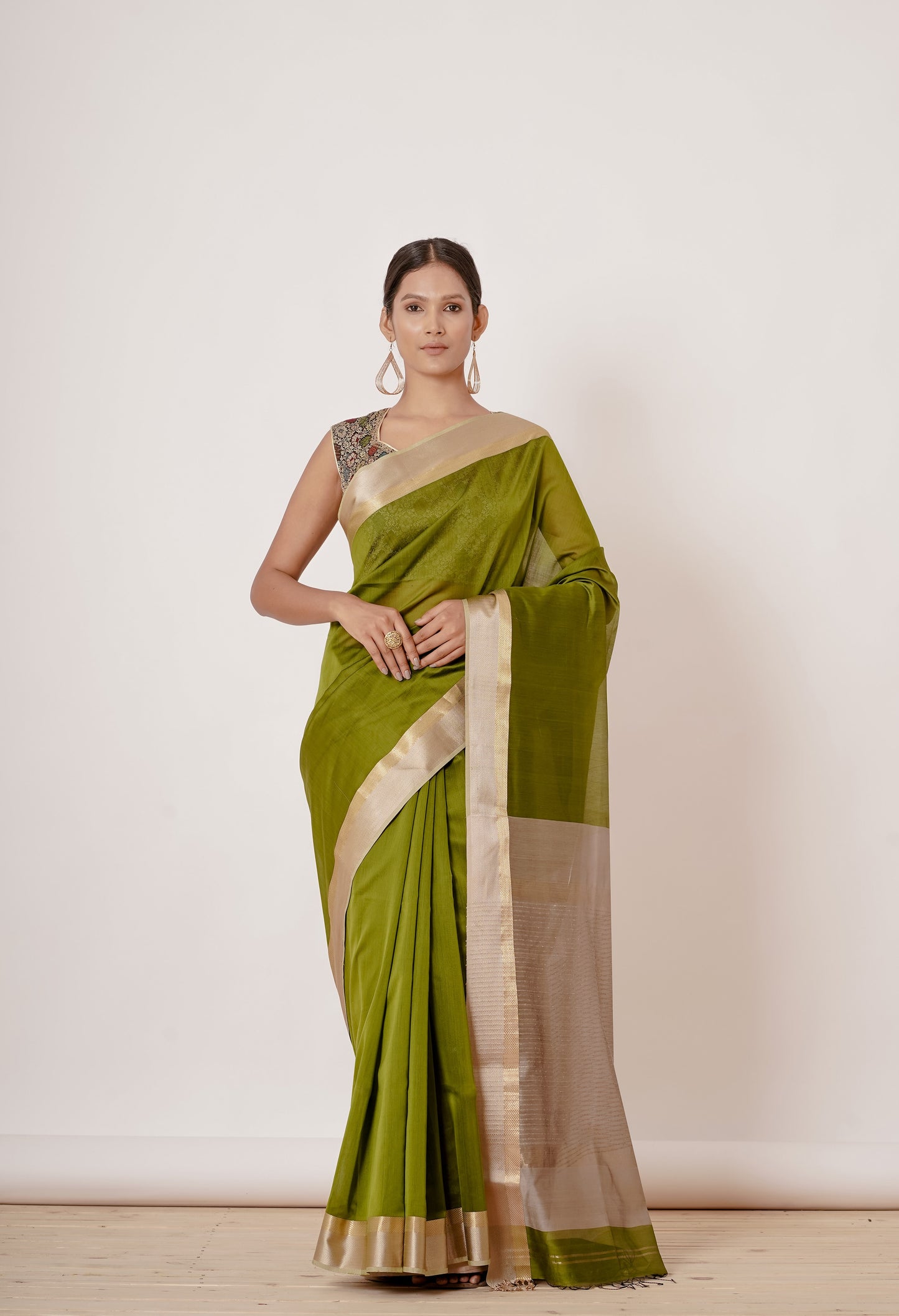 Make a statement with this exquisite olive green Maheshwari silk saree, featuring a thick, opulent gold zari border that adds a touch of luxury and sophistication. The accompanying brocade blouse perfectly complements the saree's rich, earthy hue, creating a truly regal and eye-catching effect. The combination of the saree's unique olive green color and the gold zari border creates a dramatic visual effect, perfect for special occasions, weddings, or formal events where you want to exude elegance and poise. The brocade blouse adds a touch of traditional charm, making this ensemble a perfect blend of modern luxury and classic style.