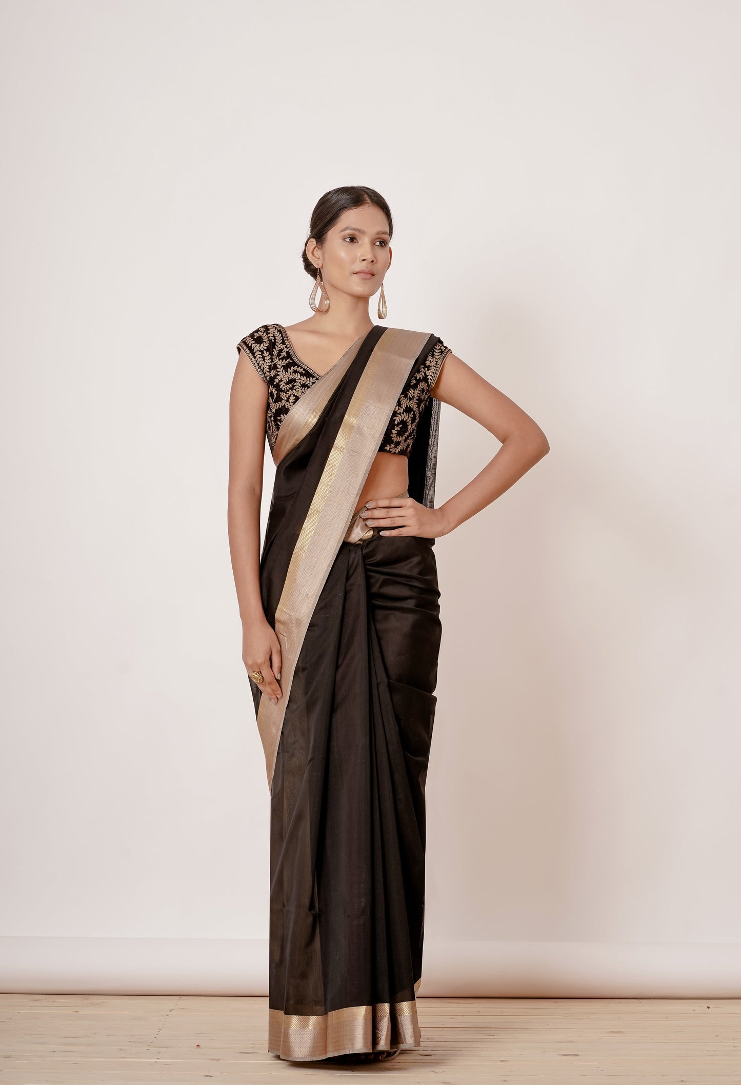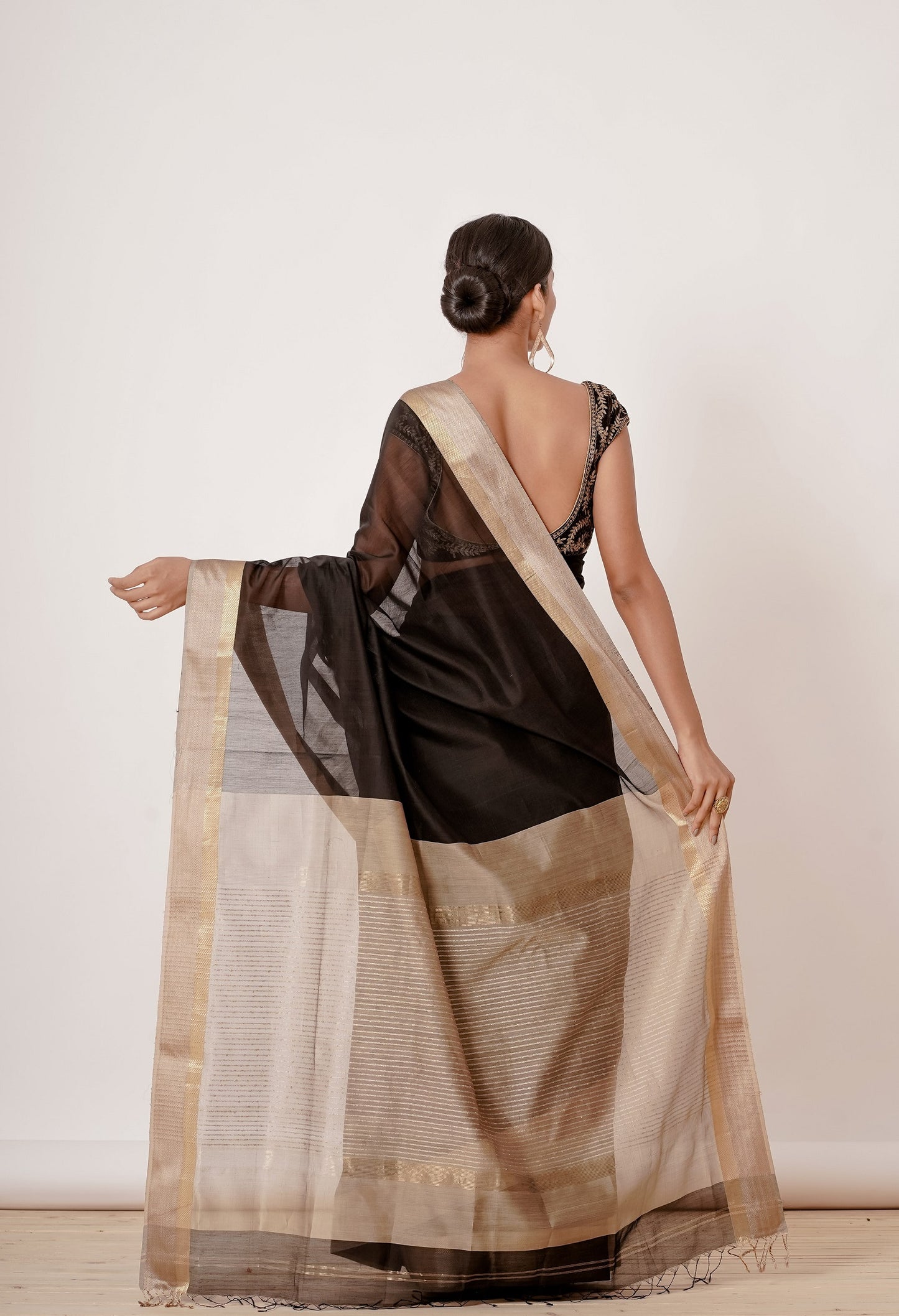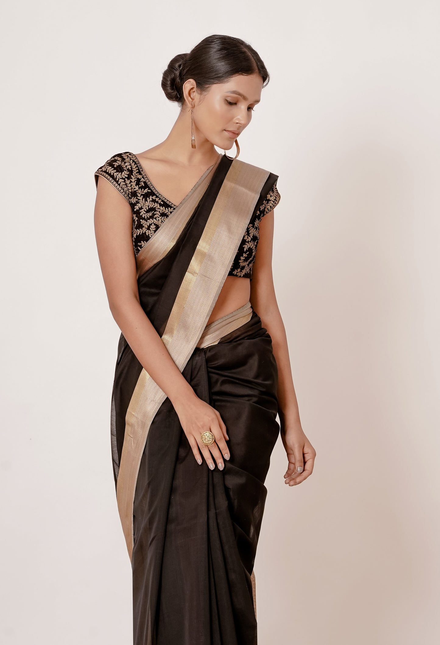 Experience the epitome of elegance with this stunning plain Royal black Maheshwari silk saree, featuring a beautiful beige and gold border that adds a touch of luxury and refinement. The accompanying black blouse boasts intricate zari embroidery all over, creating a truly regal and eye-catching effect. The combination of the saree's rich, dark hue and the gold border creates a dramatic visual effect, perfect for special occasions, weddings, or formal events where you want to exude poise and sophistication. The all-over zari embroidery on the blouse adds a touch of opulence, making this ensemble a perfect blend of classic style and modern glamour.