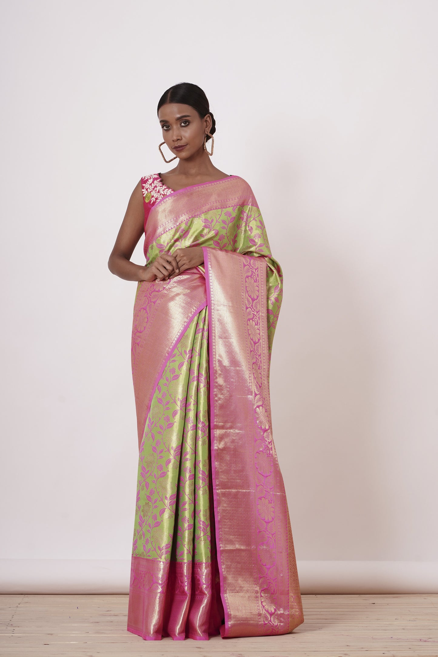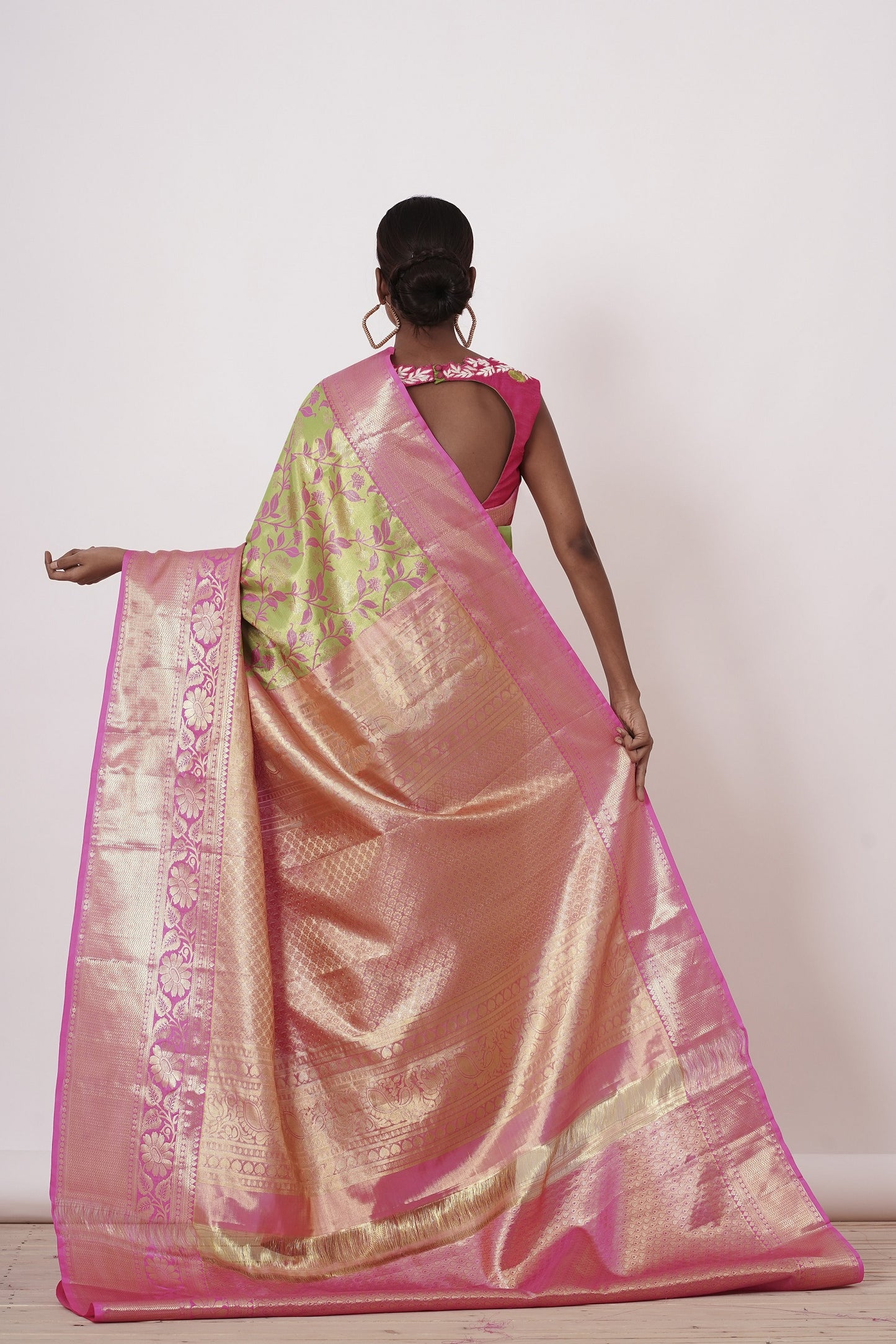 Lime Green Dharamavaram Silk Saree with a Light Fusia Pink Blouse