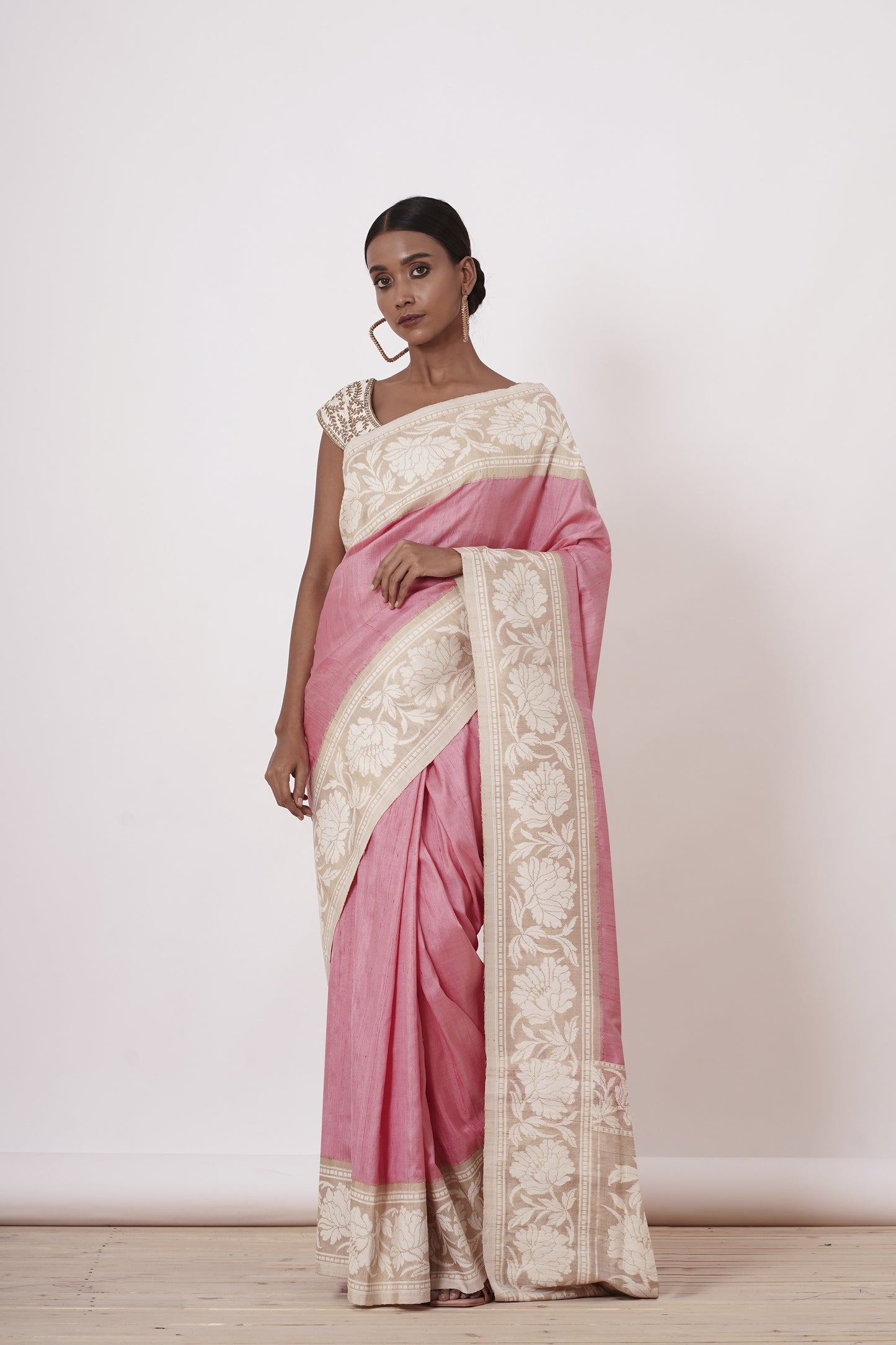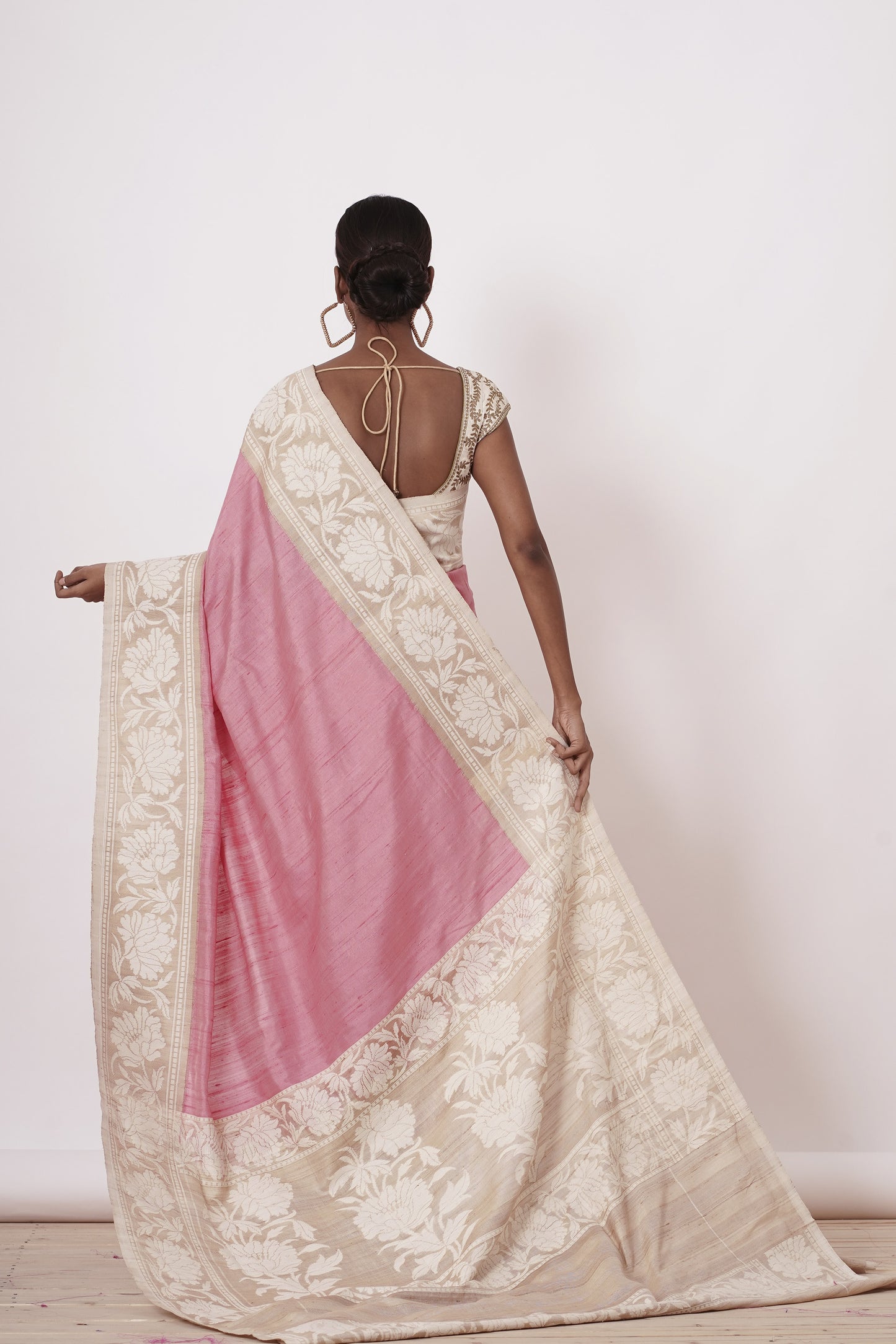 Experience the quintessence of traditional charm with this exquisite onion pink Banarasi saree, featuring a striking big beige border that adds a touch of sophistication and elegance. The accompanying cream blouse boasts all-over zari embroidery in gold, creating a truly regal and eye-catching effect. The combination of the saree's soft pink hue, beige border, and intricate gold embroidery creates a timeless and classic look, perfect for special occasions, weddings, or formal events where you want to exude poise, confidence, and traditional glamour.