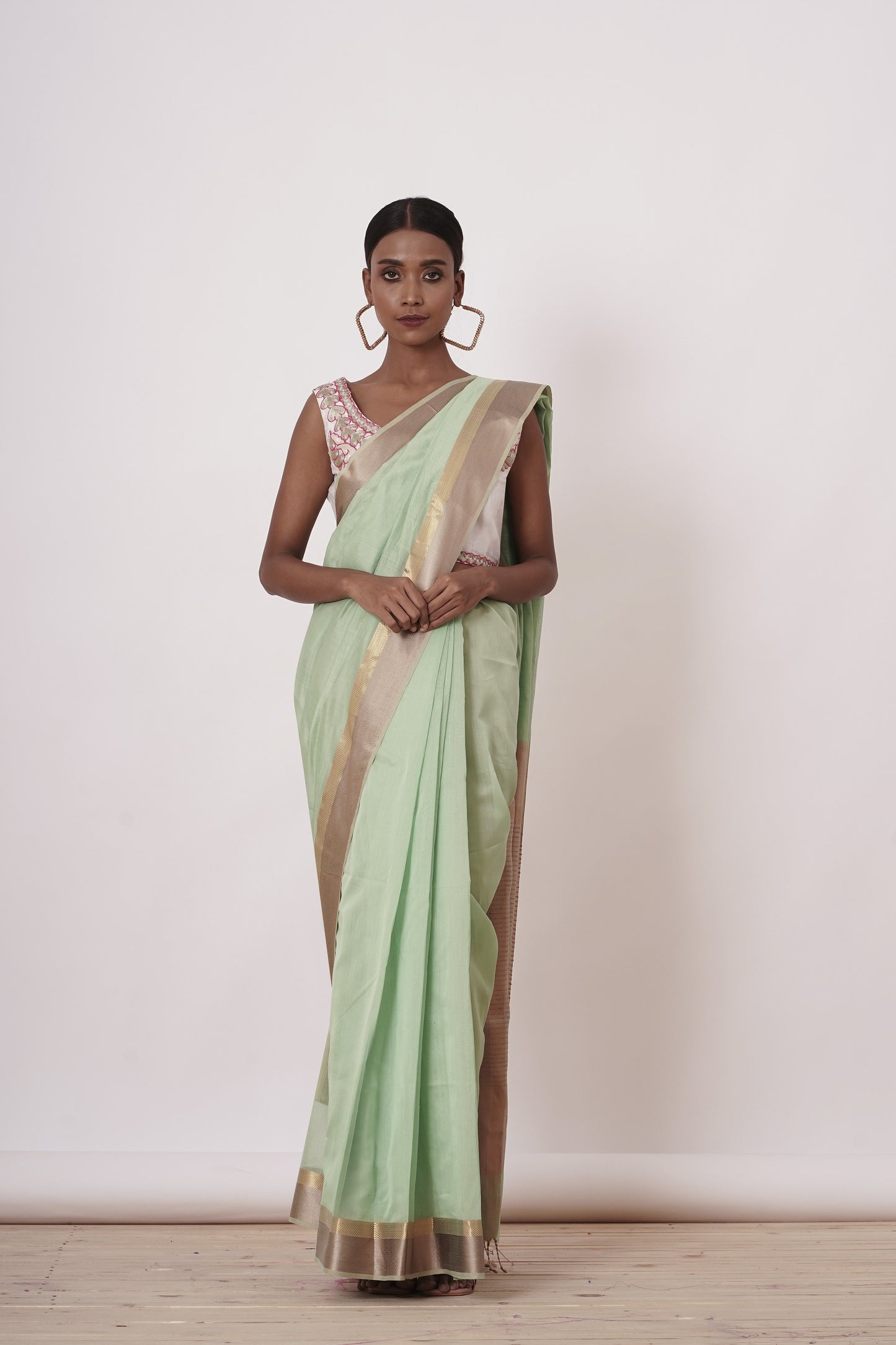 Make a statement with this captivating dusty teal Maheshwari silk saree, featuring a luxurious gold zari border that adds a touch of sophistication and glamour. The accompanying ivory blouse boasts heavy zari embroidery on the neckline and hem, creating a truly eye-catching effect. The combination of the saree's soft, muted hue, gold border, and intricate embroidery creates a mesmerizing and ethereal look, perfect for special occasions, weddings, or formal events where you want to exude elegance, poise, and refined charm.