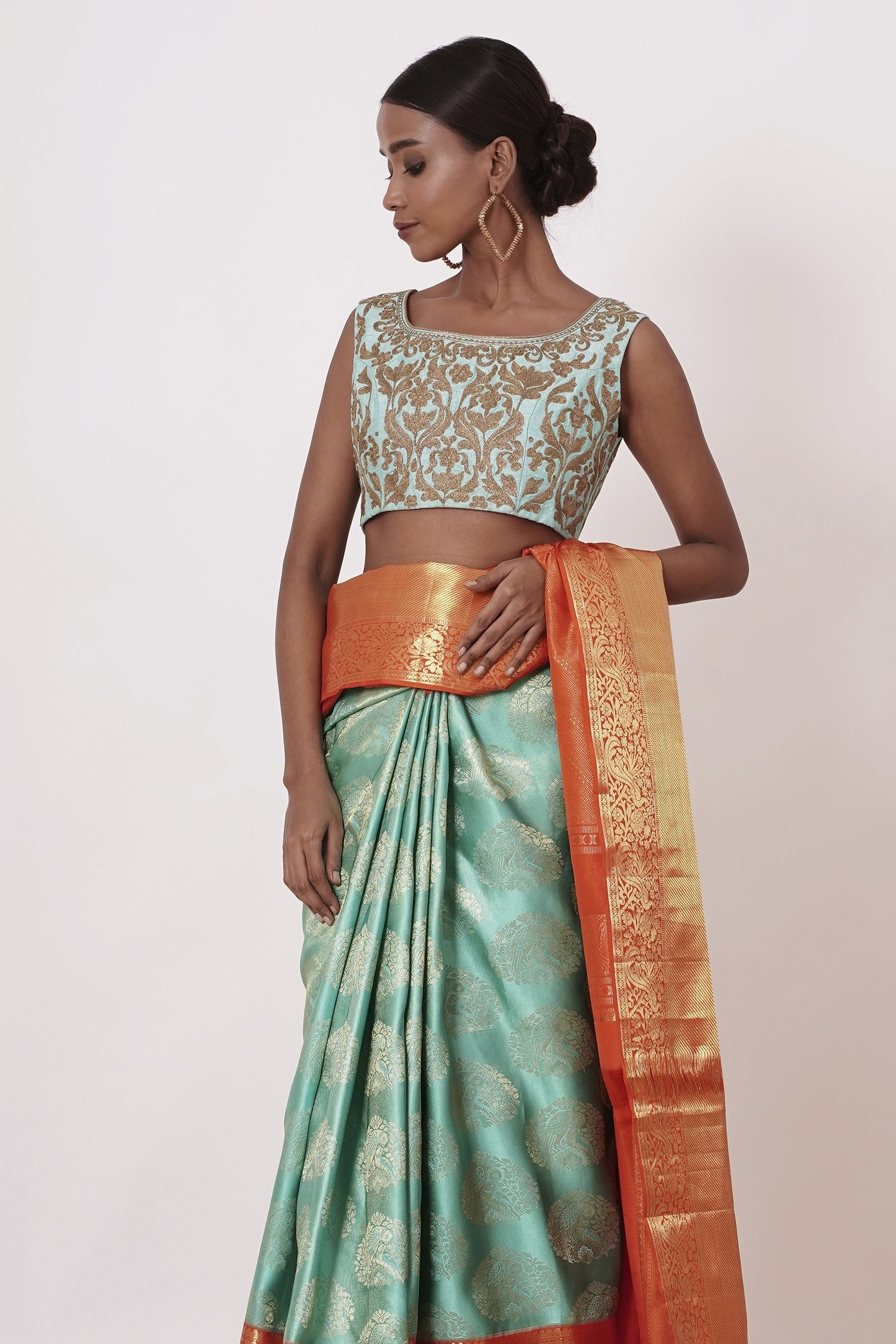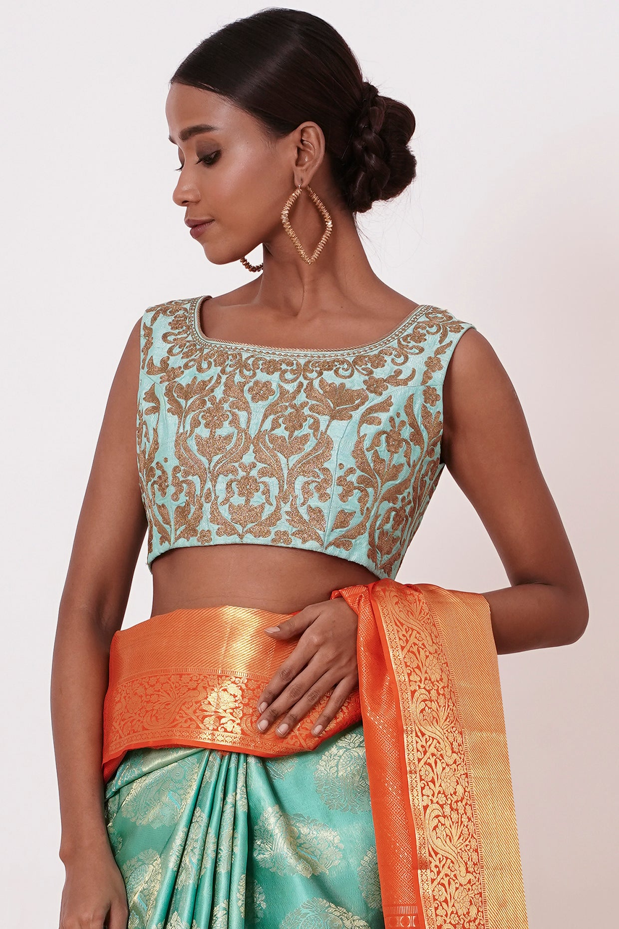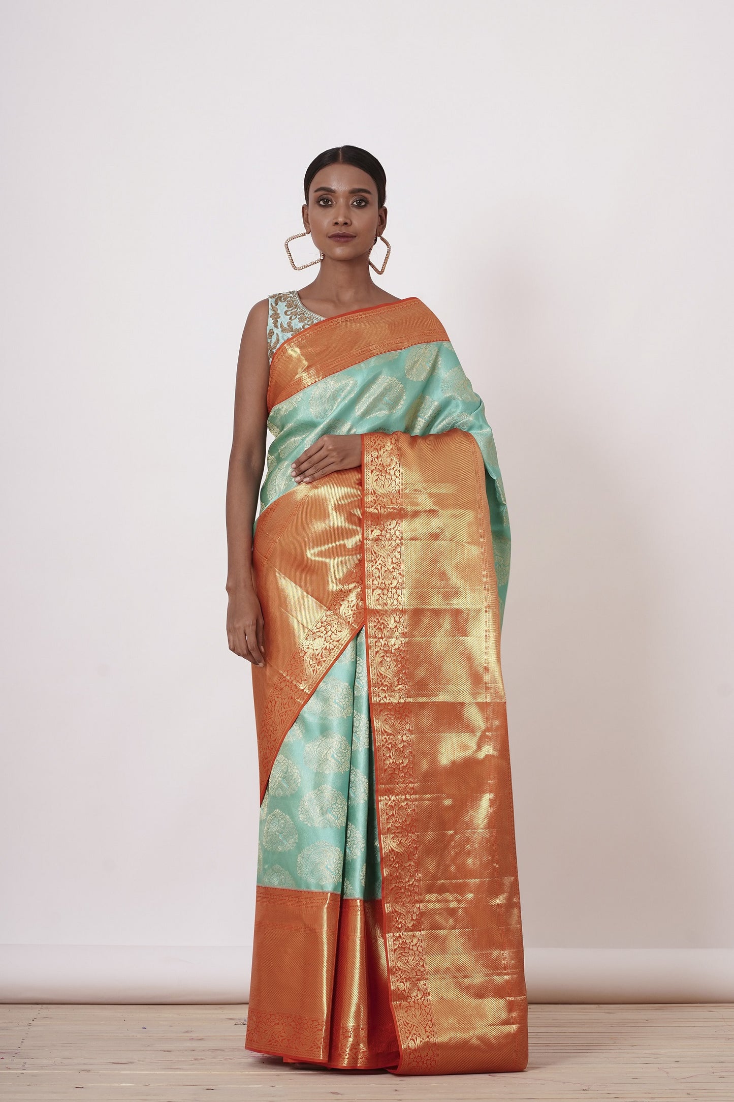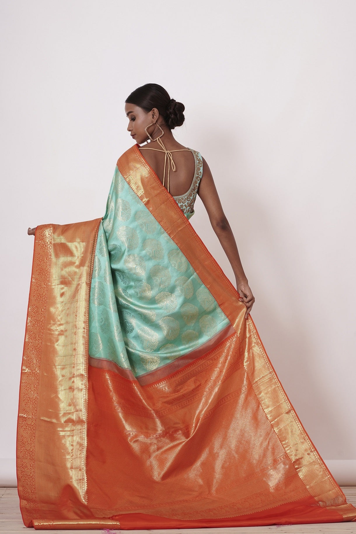 Turqouise Dharamavaram Silk Saree with a Light Turqouise Blouse