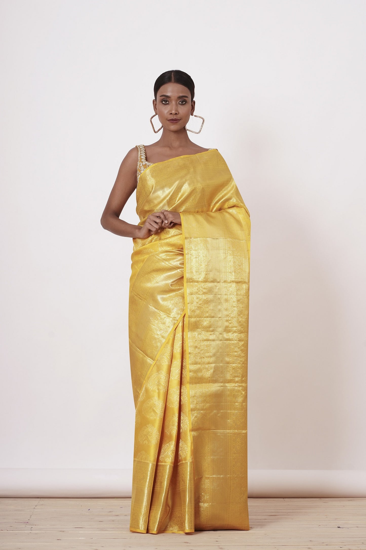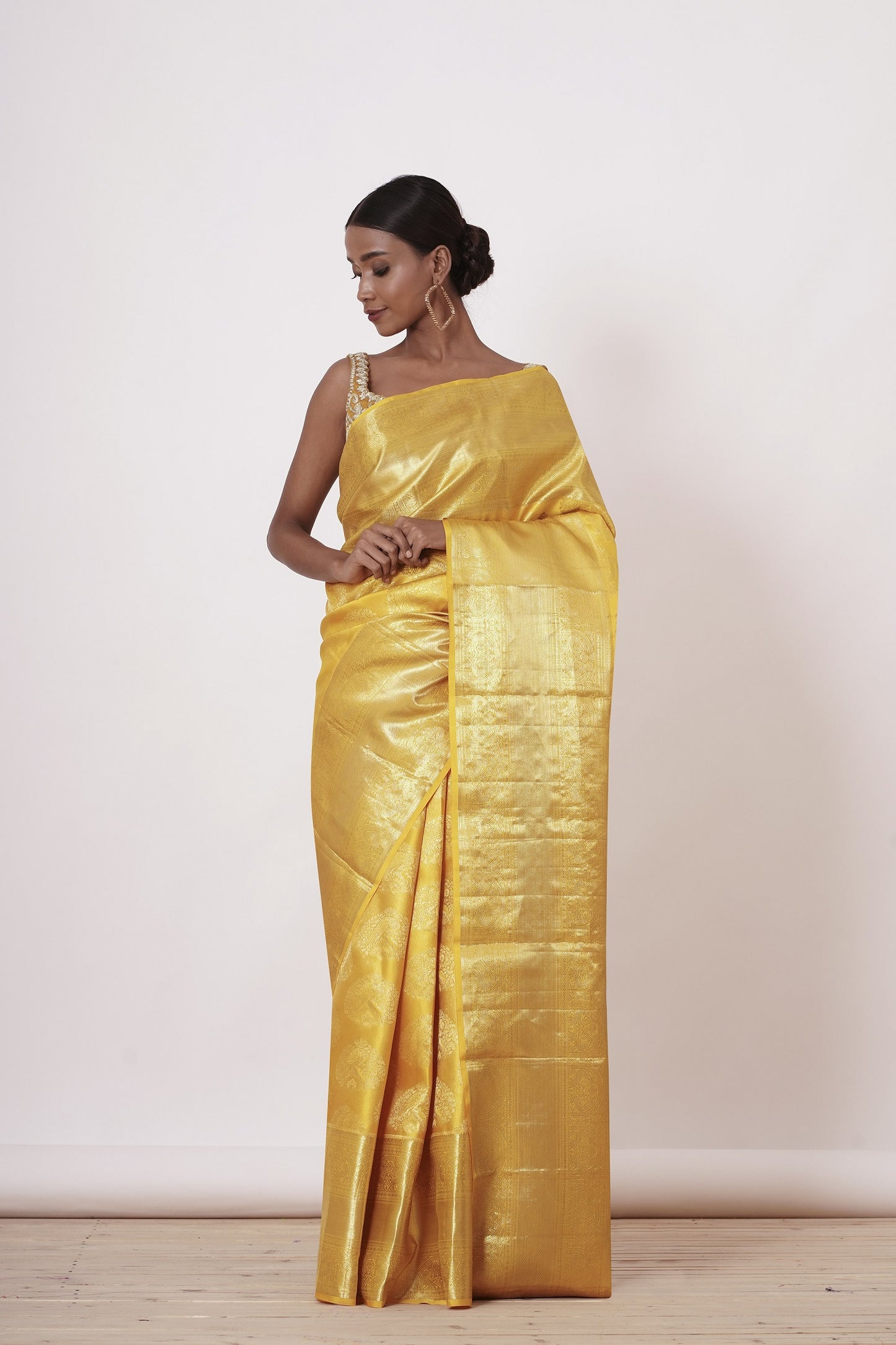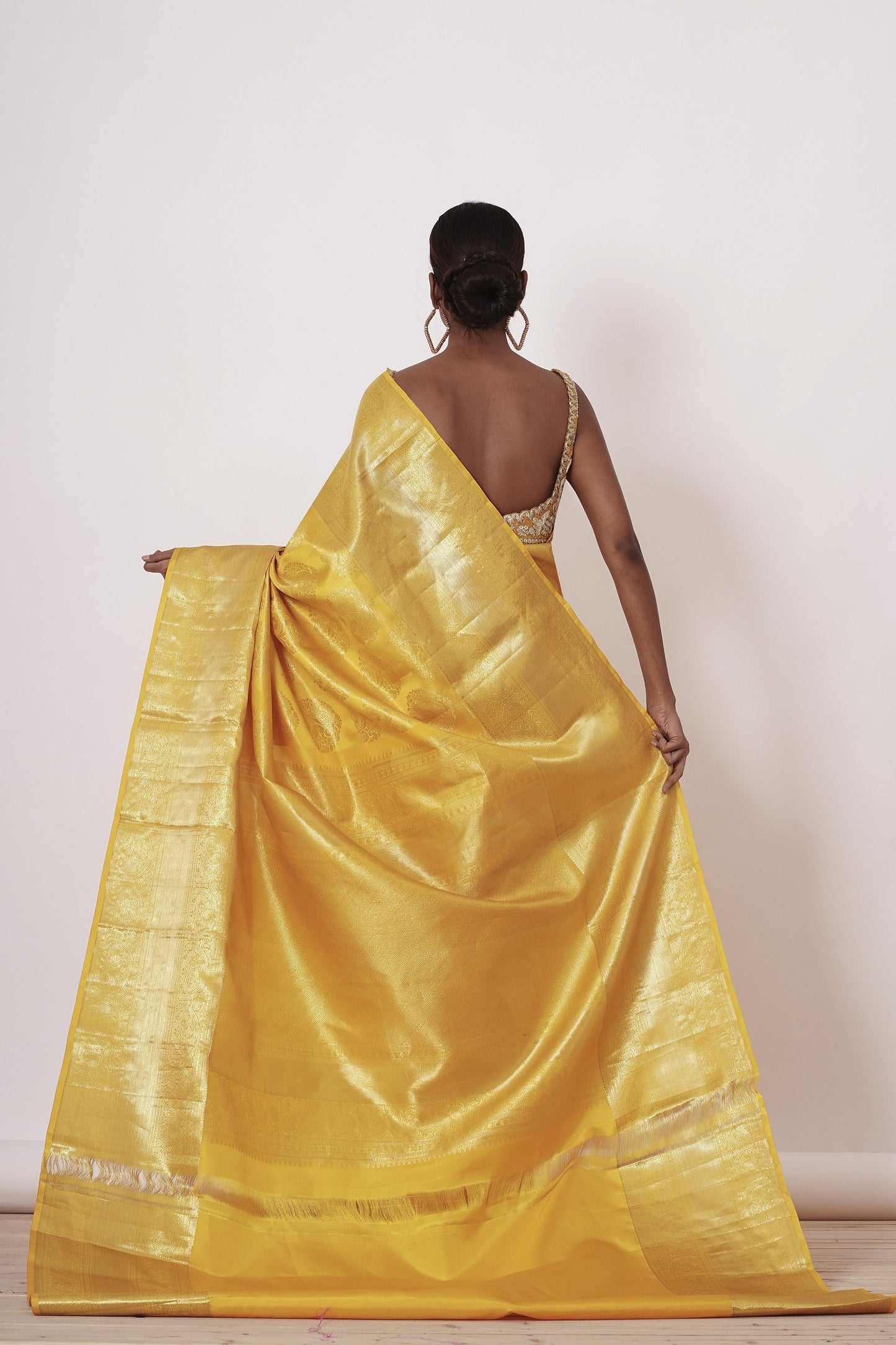 Royal Yellow Dharamavaram Silk Saree with a Gold Blouse .