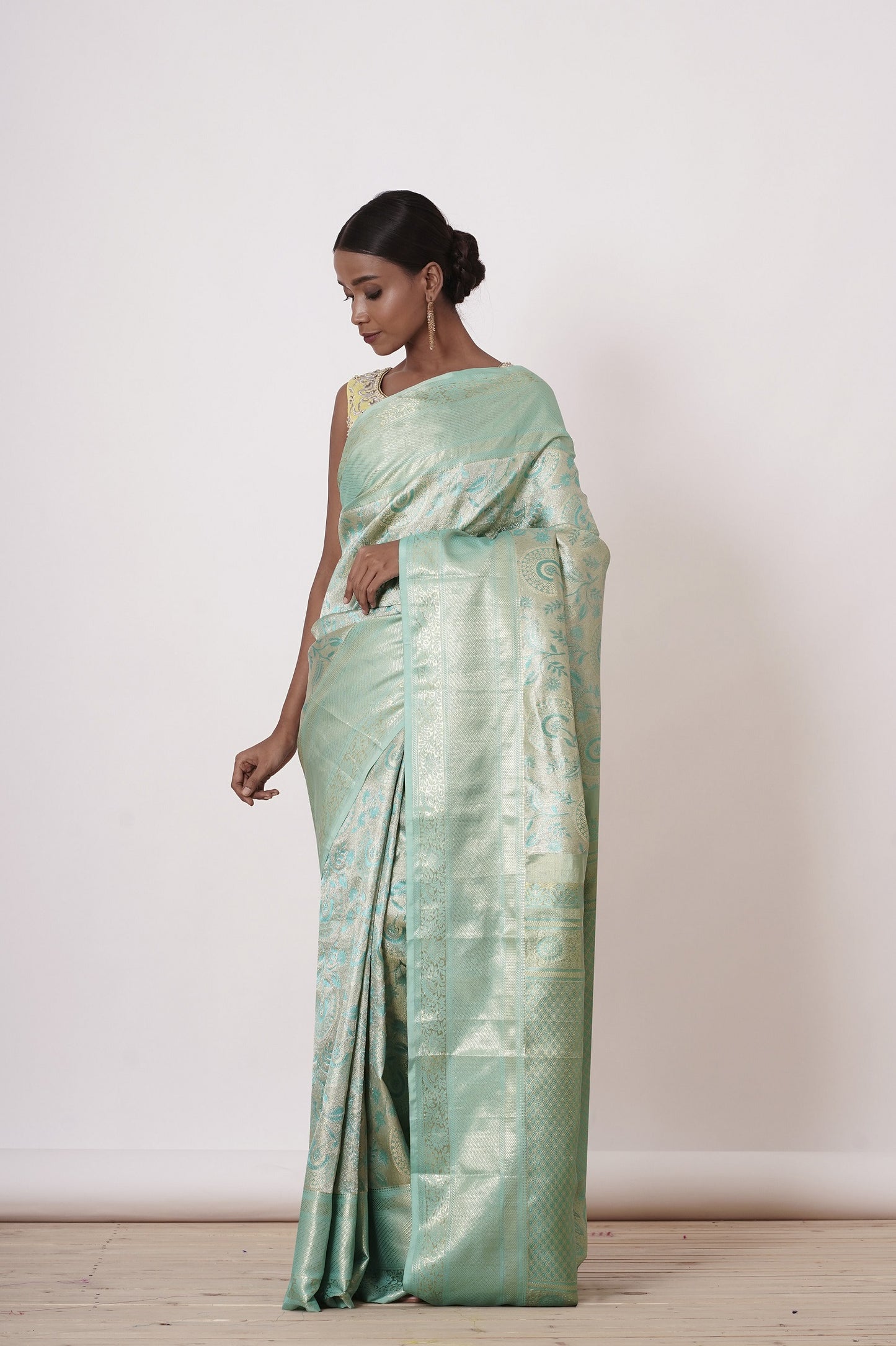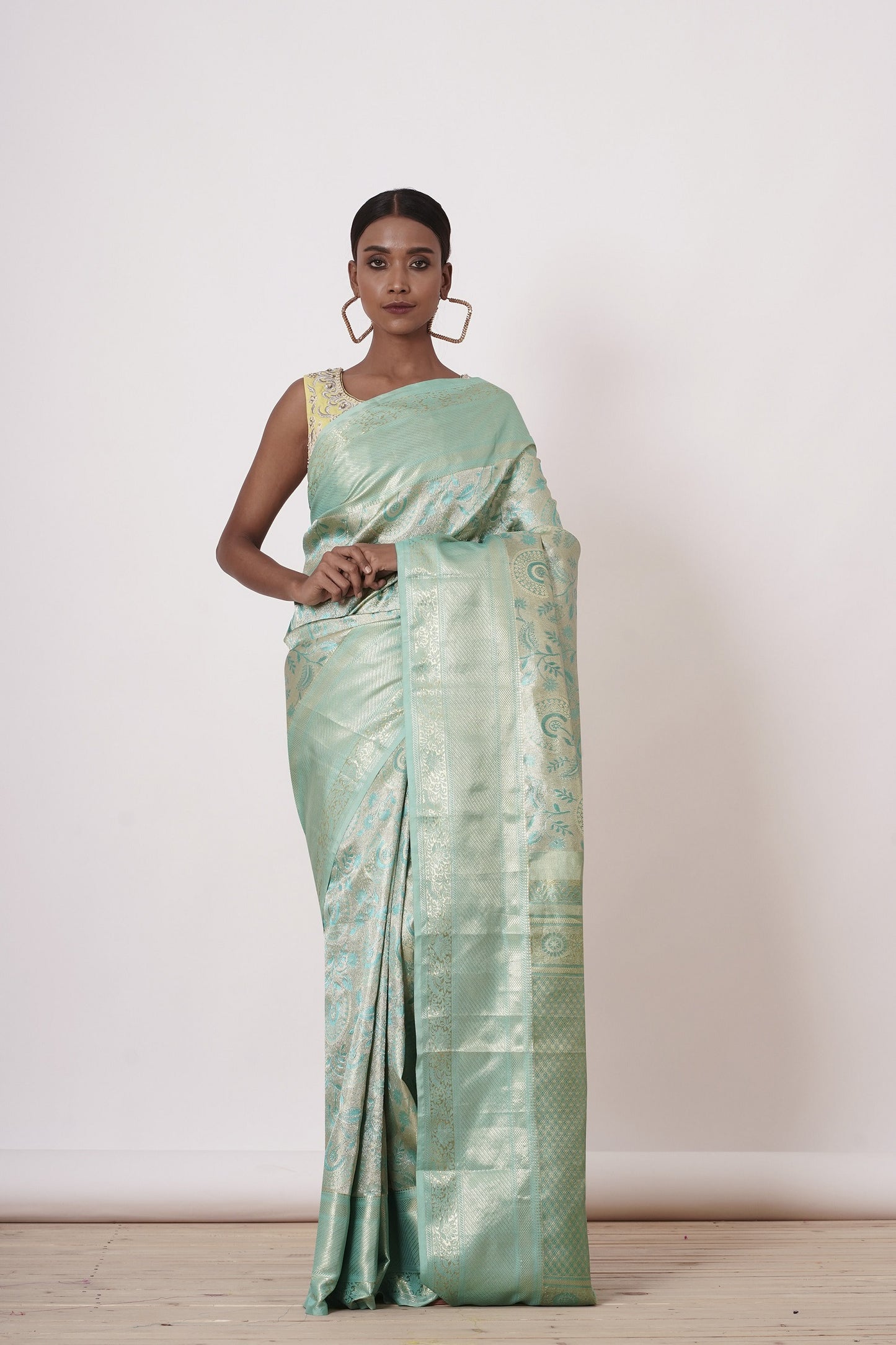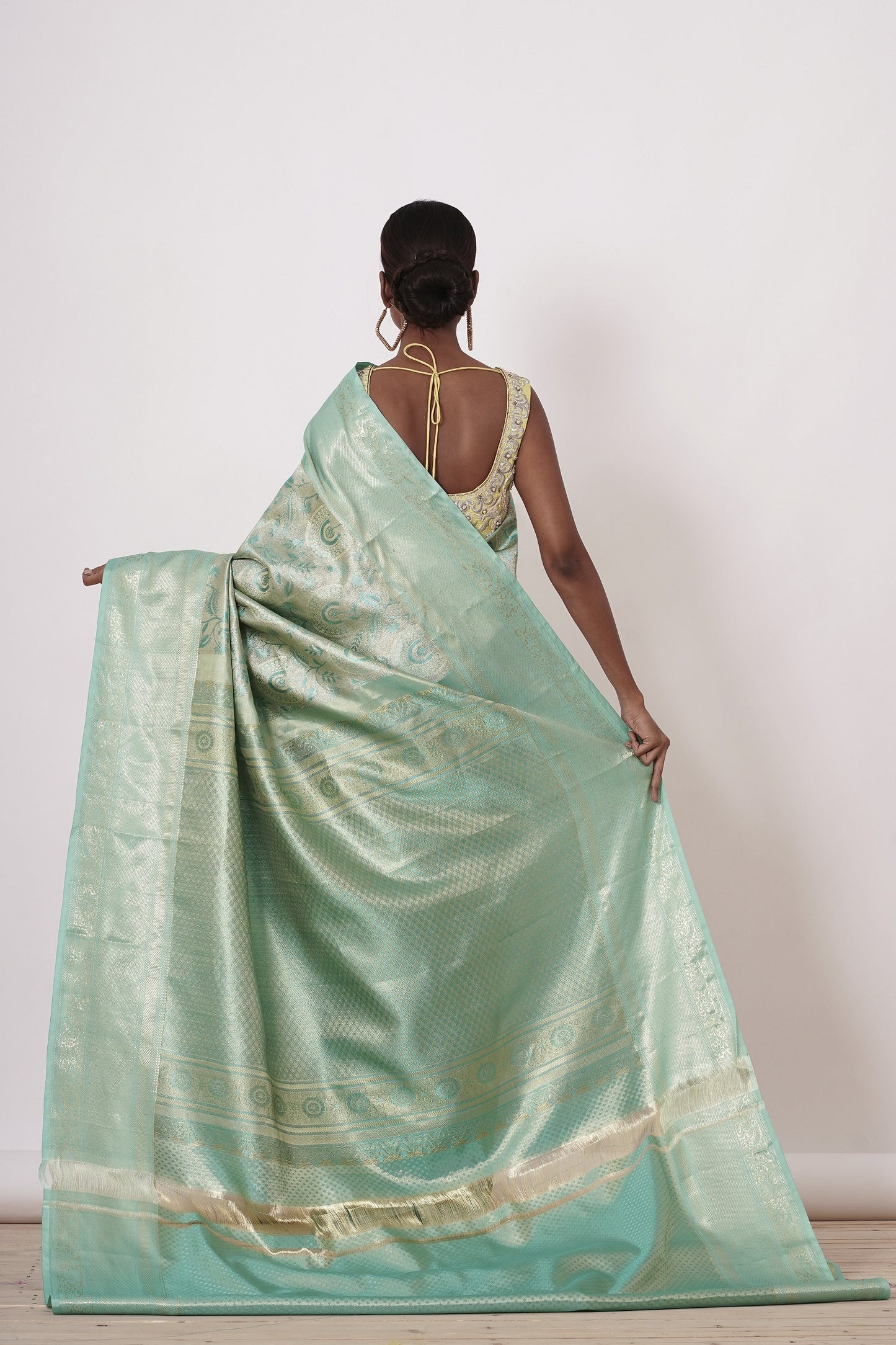 Turqouise Dharamavaram Silk Saree with a Lemon Yelllow Blouse