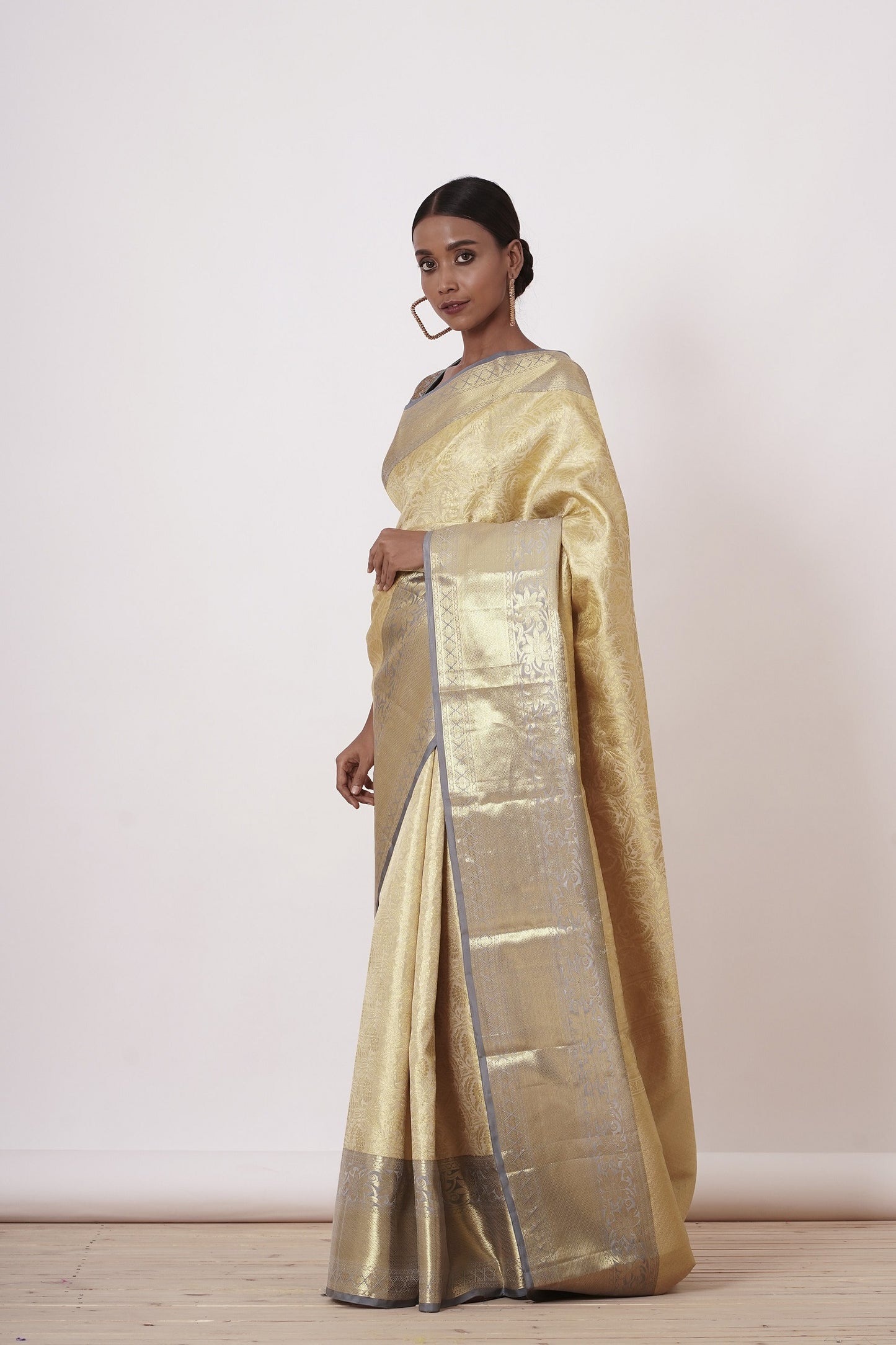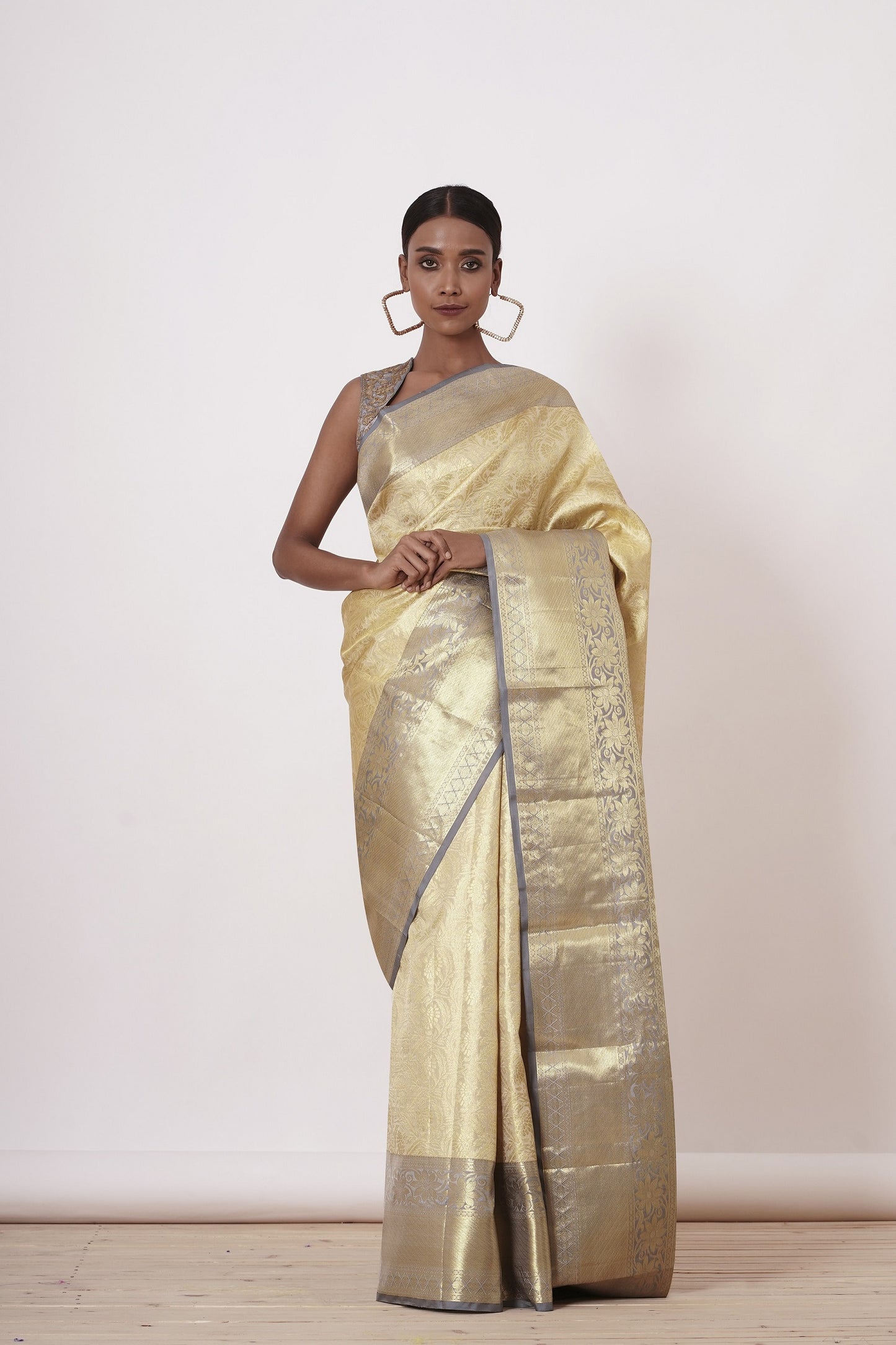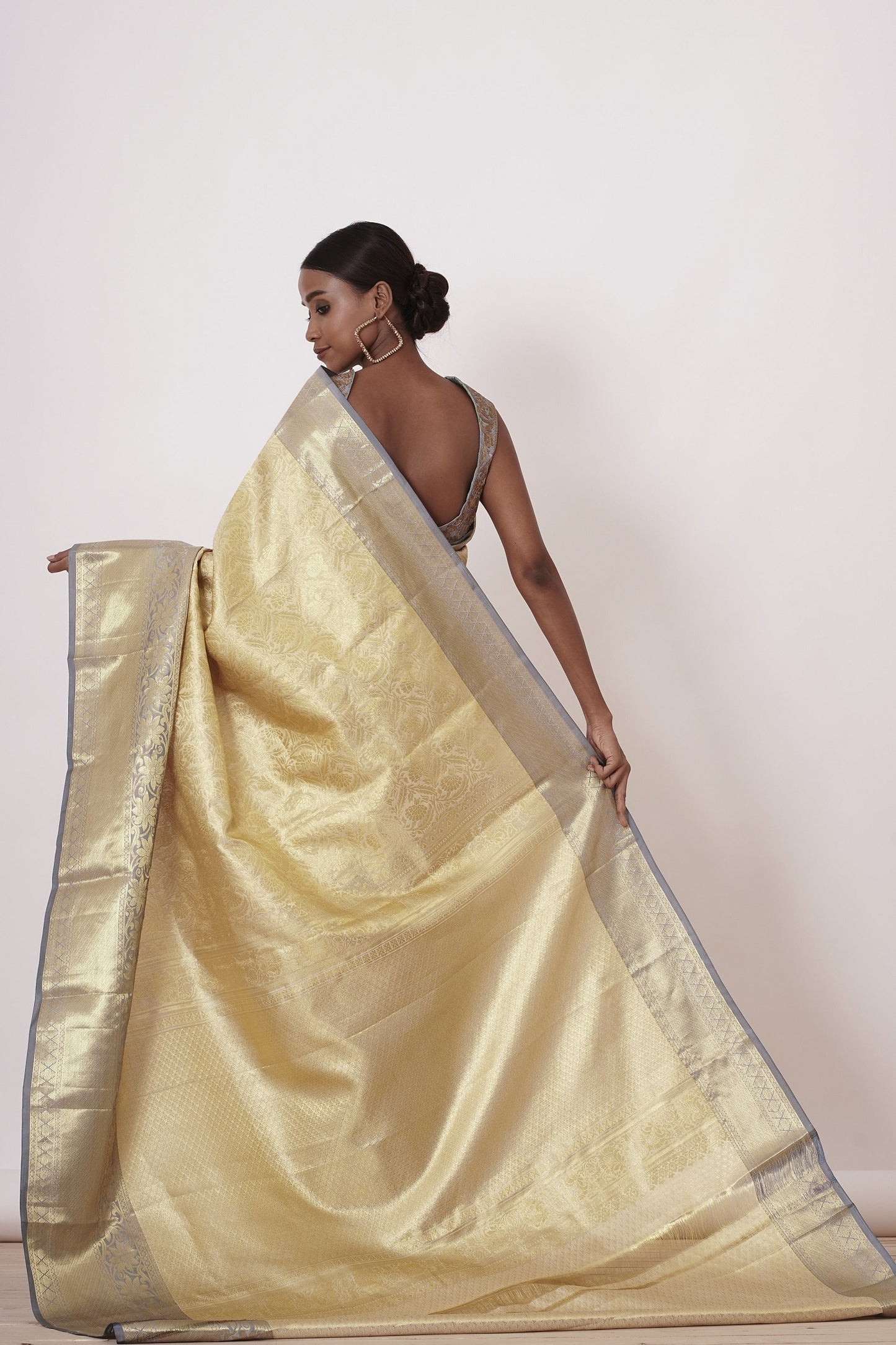 Experience the epitome of luxury and sophistication with this exquisite ivory and gold Dharamavaram silk saree, featuring a thick, intricate grey zari border that adds a touch of modern elegance. The saree's all-over jacquard pattern creates a beautiful, textured effect, while the accompanying grey blouse boasts stunning all-over zari embroidery, adding a touch of refined glamour. The combination of the saree's creamy ivory hue, gold accents, and intricate grey border creates a truly timeless effect, perfect for special occasions, weddings, or formal events where you want to exude poise, confidence, and understated opulence.