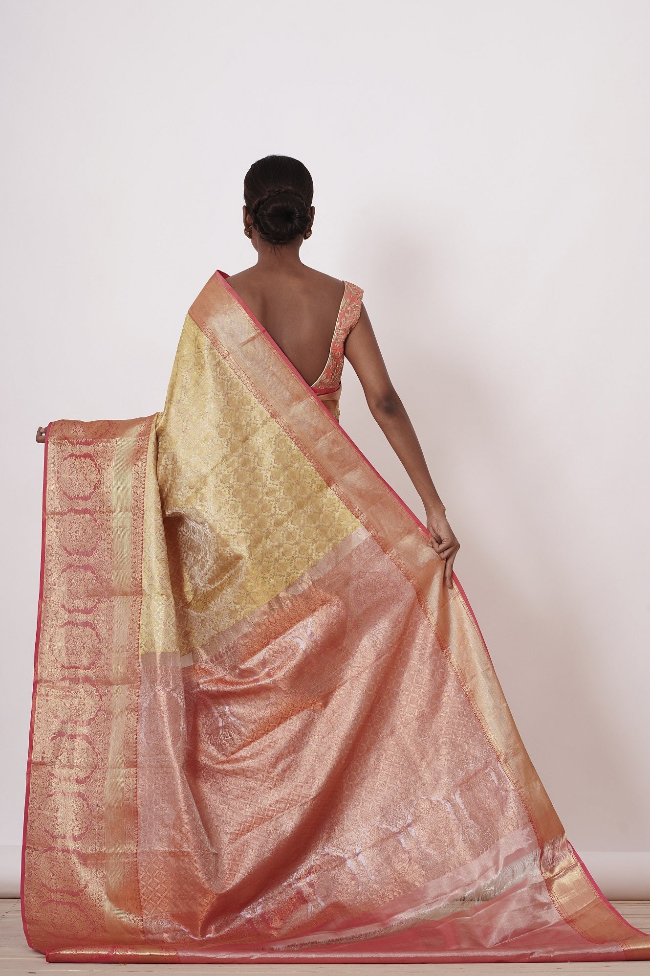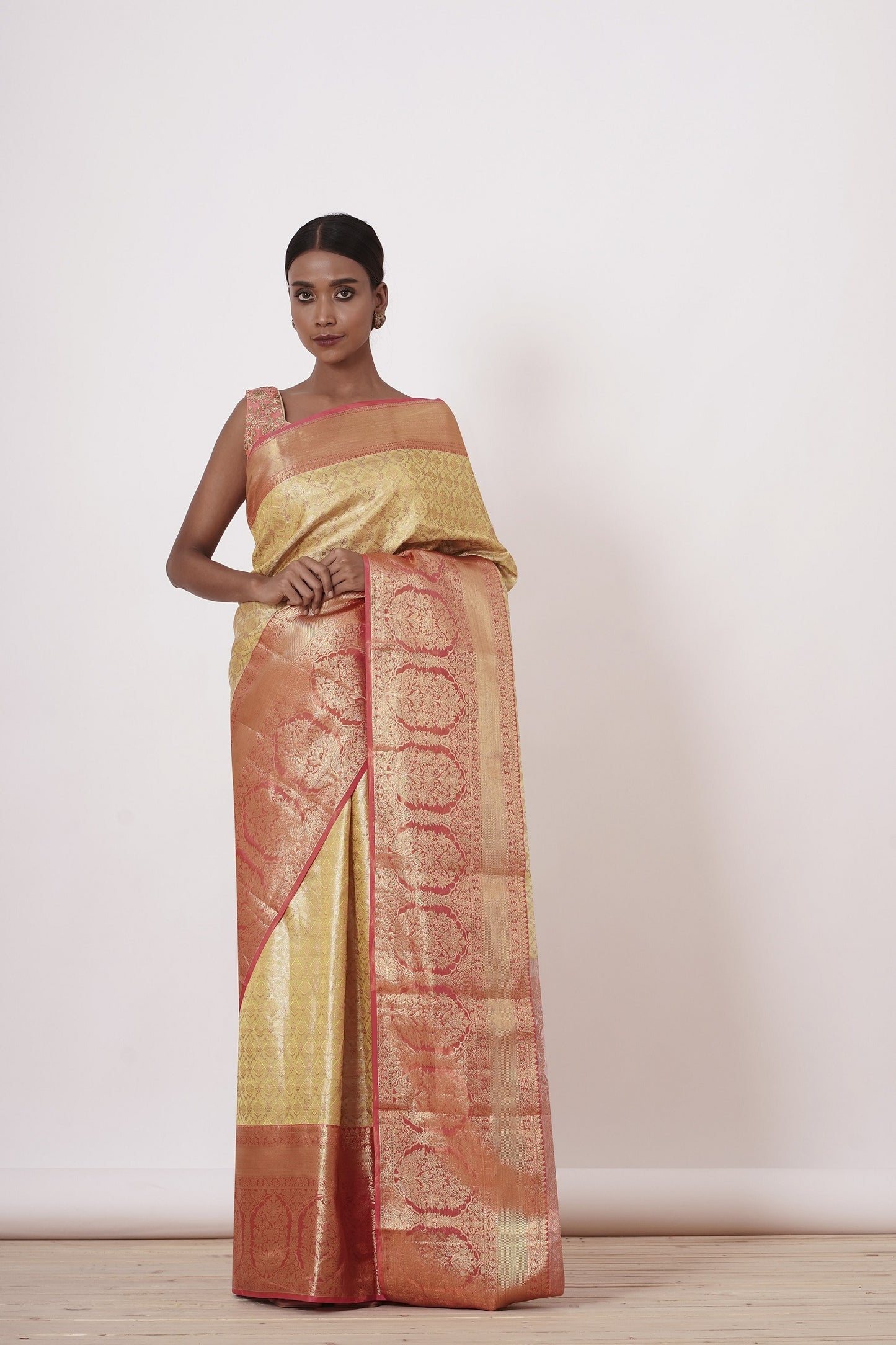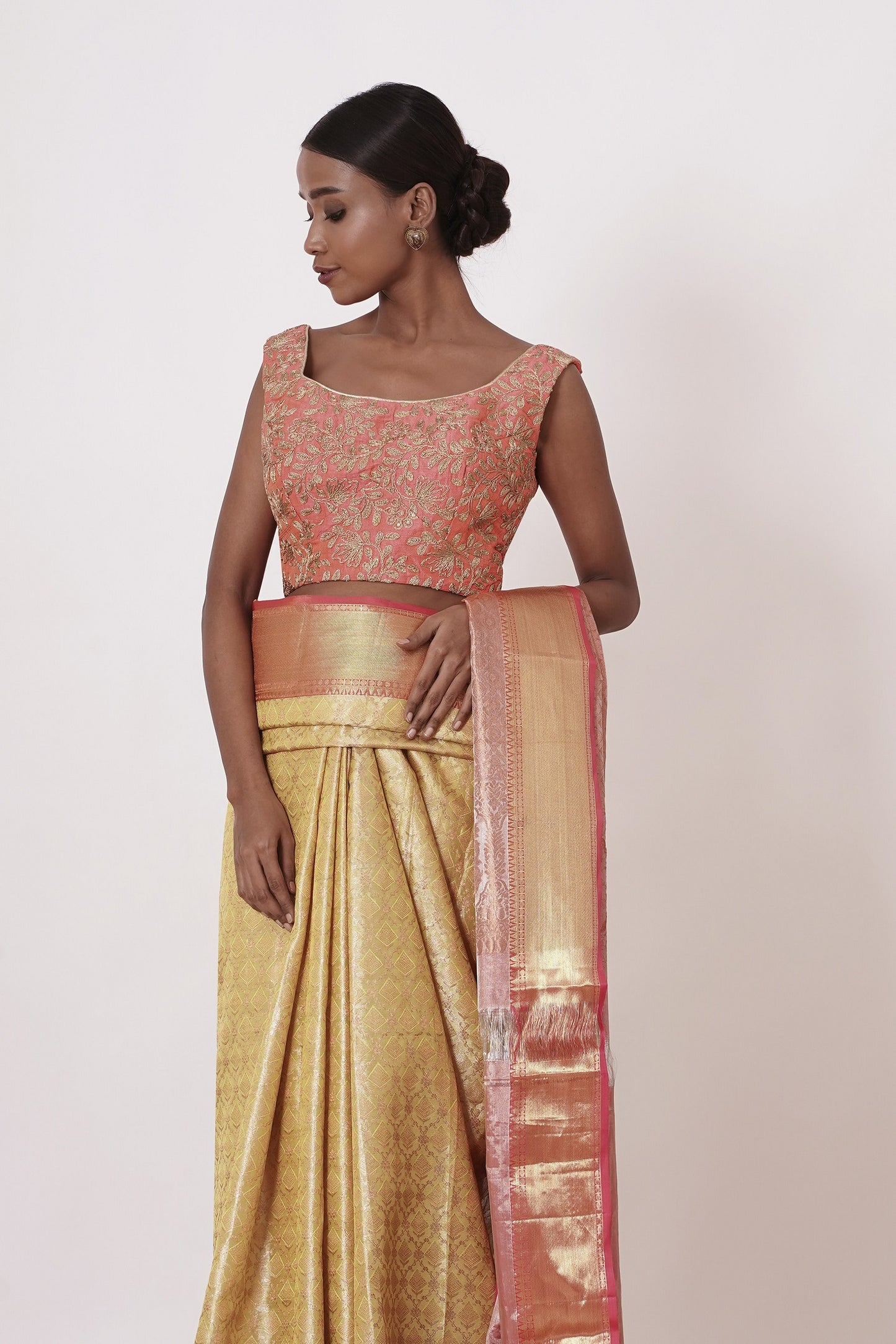 Gold Dharamavaram Silk Saree with a Peach Blouse