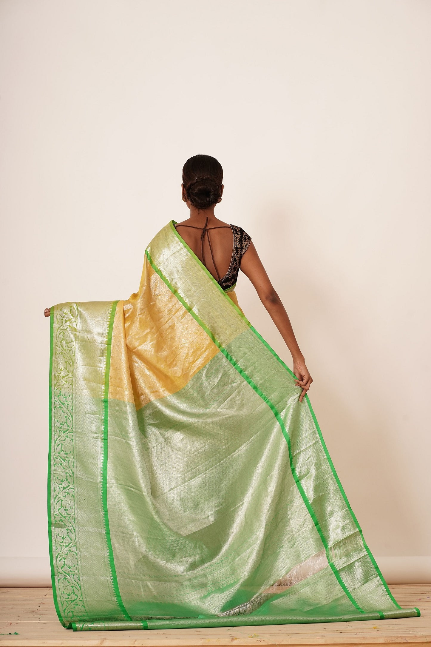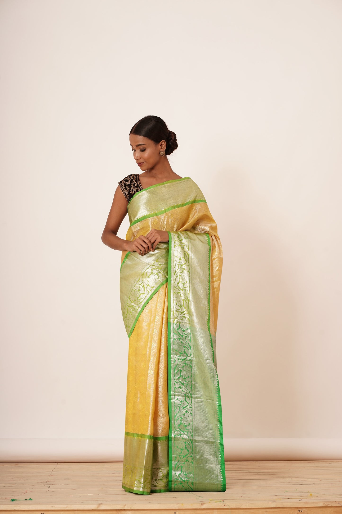 Pastel Yellow Saree with Green Border with Embroidered Velvet Blouse