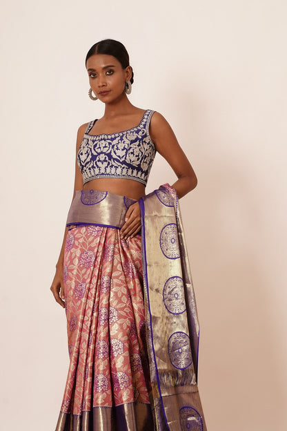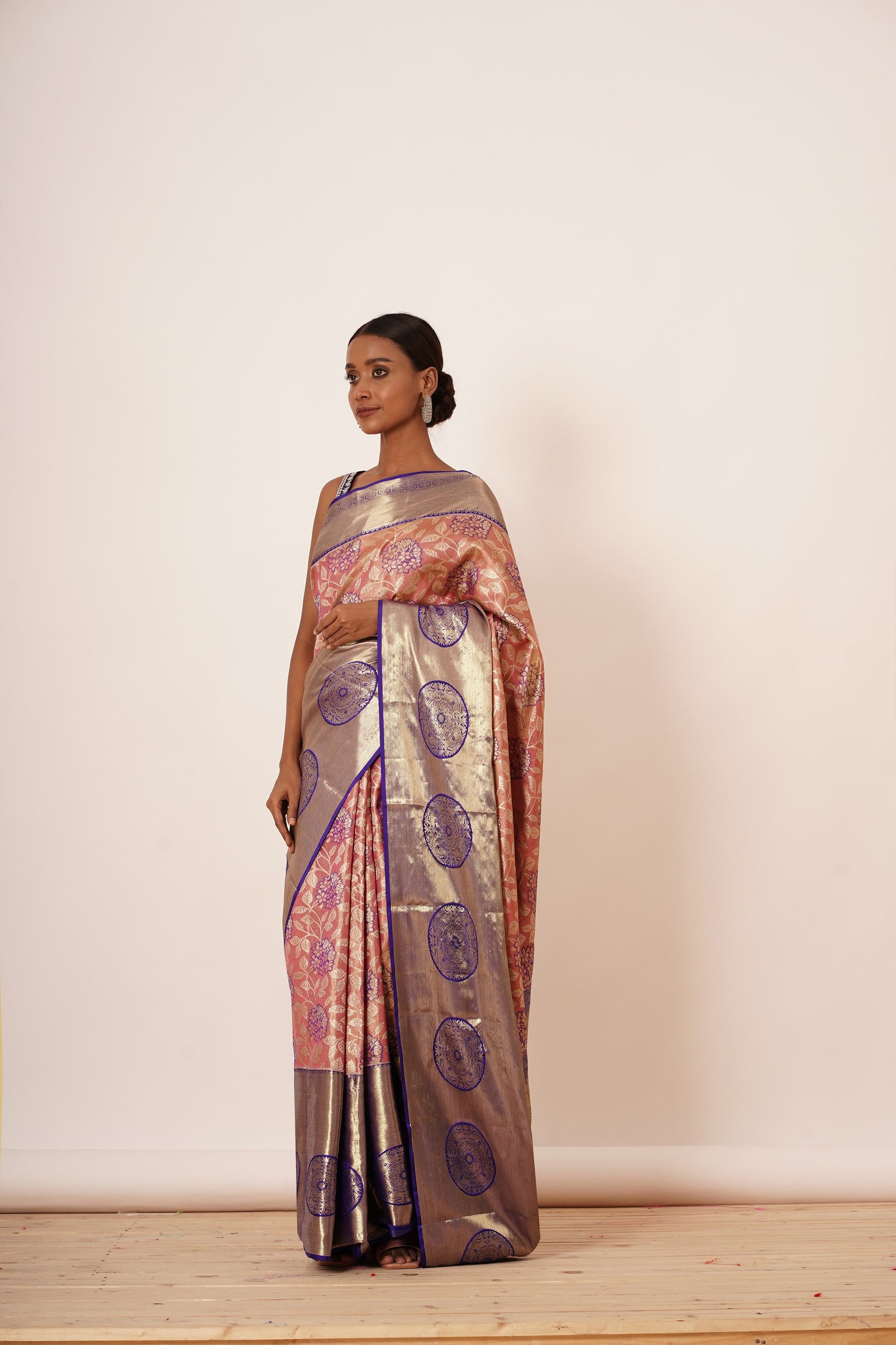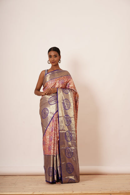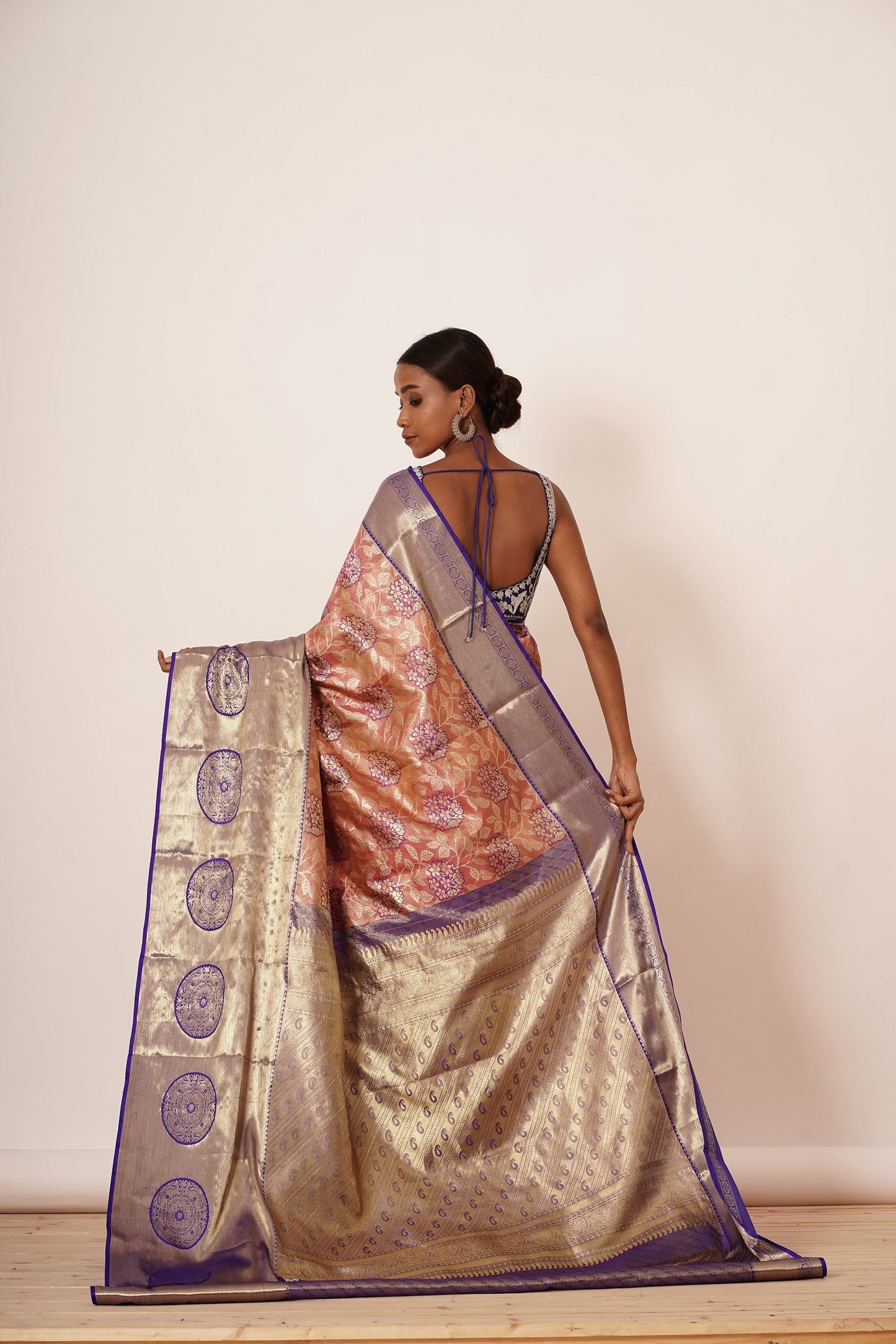 Dusty Peach Dharamavarm Silk Saree with Purple Border