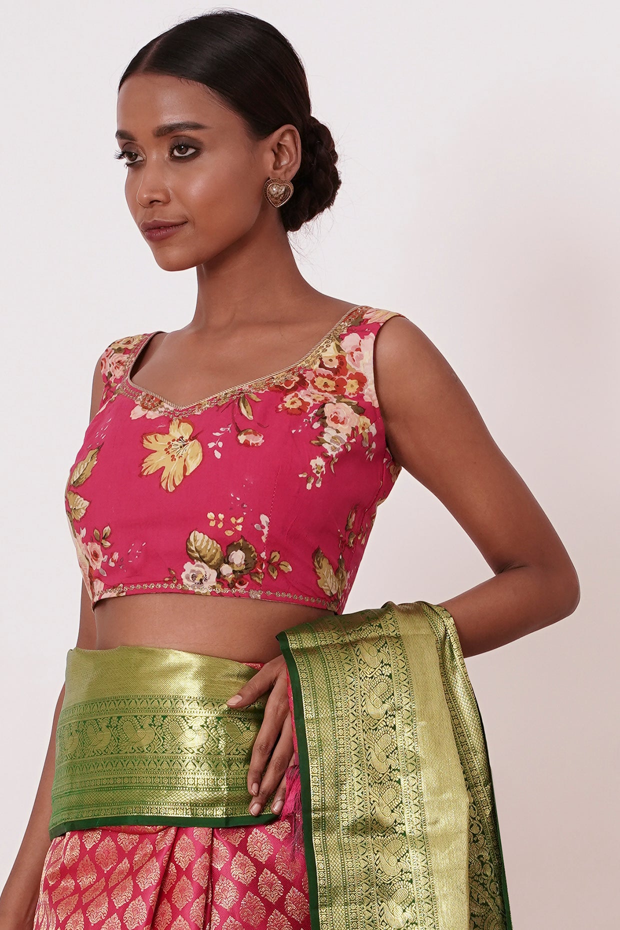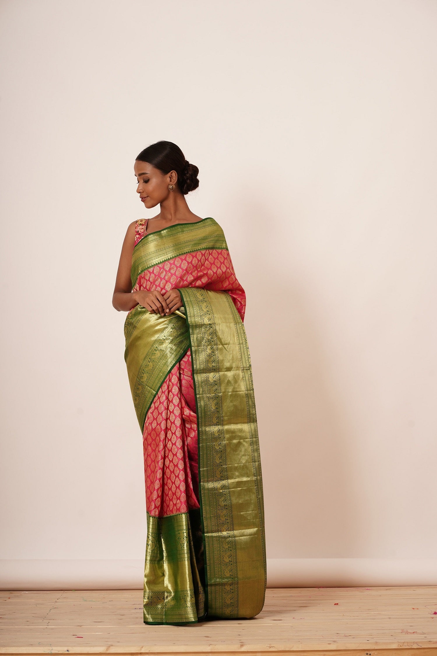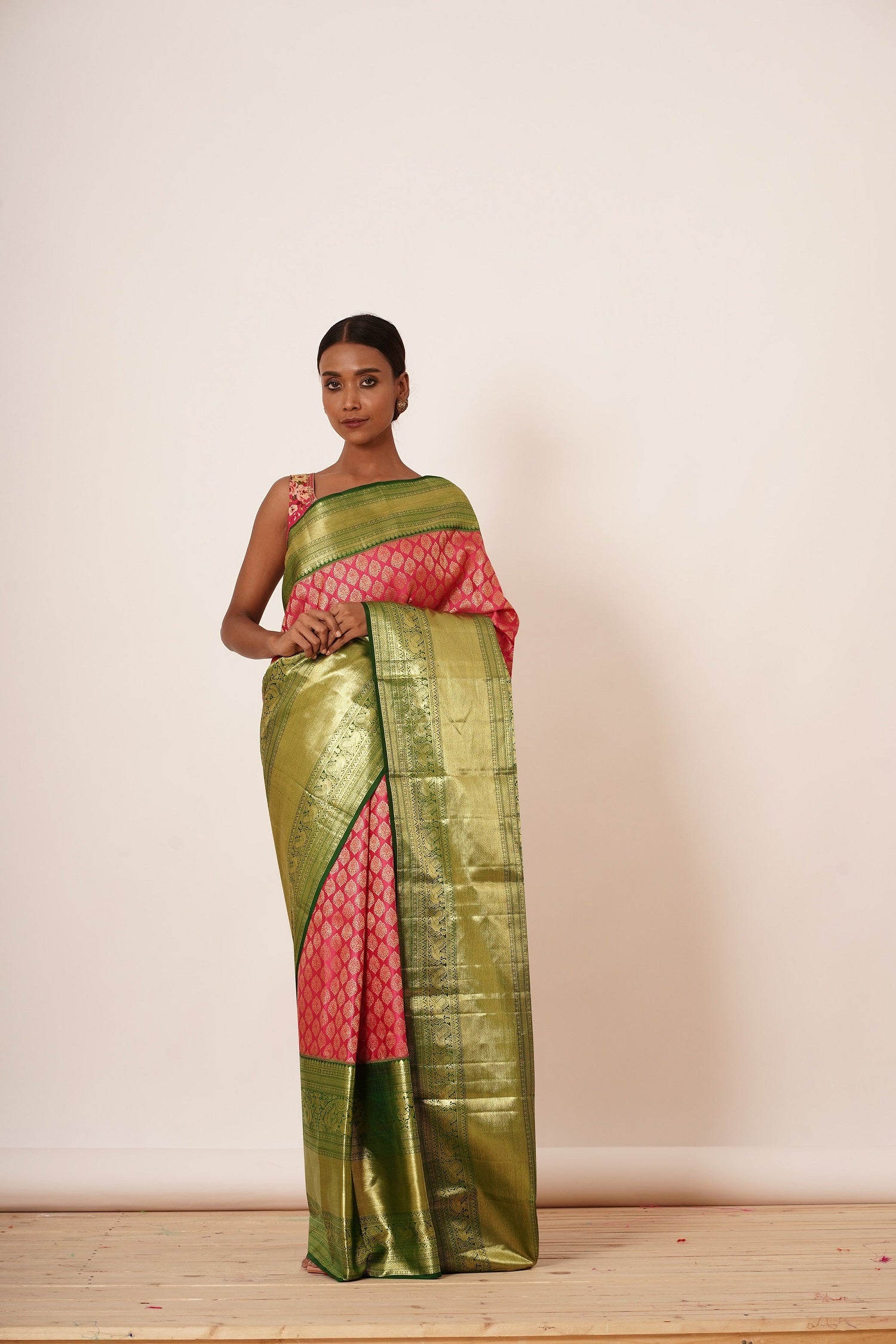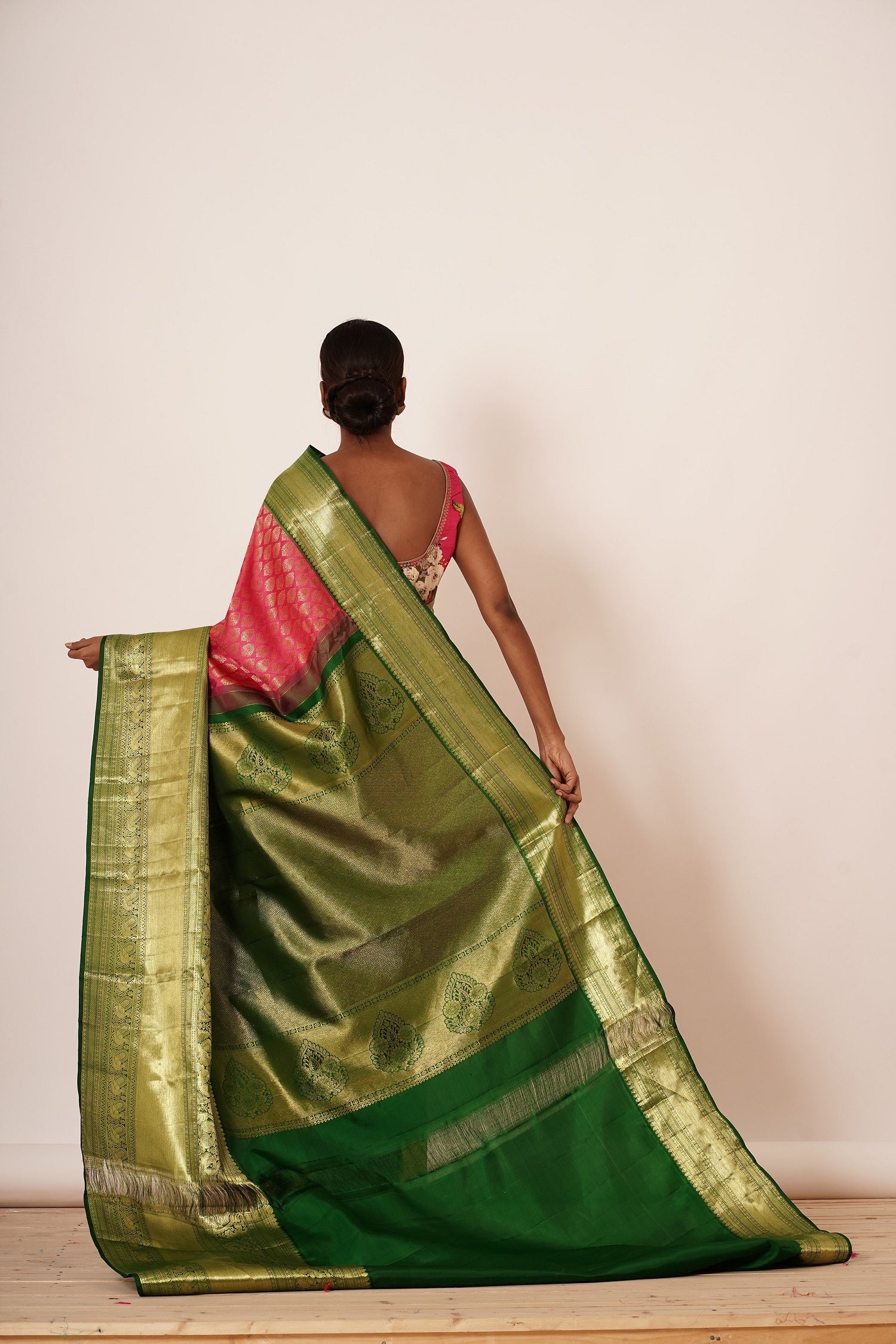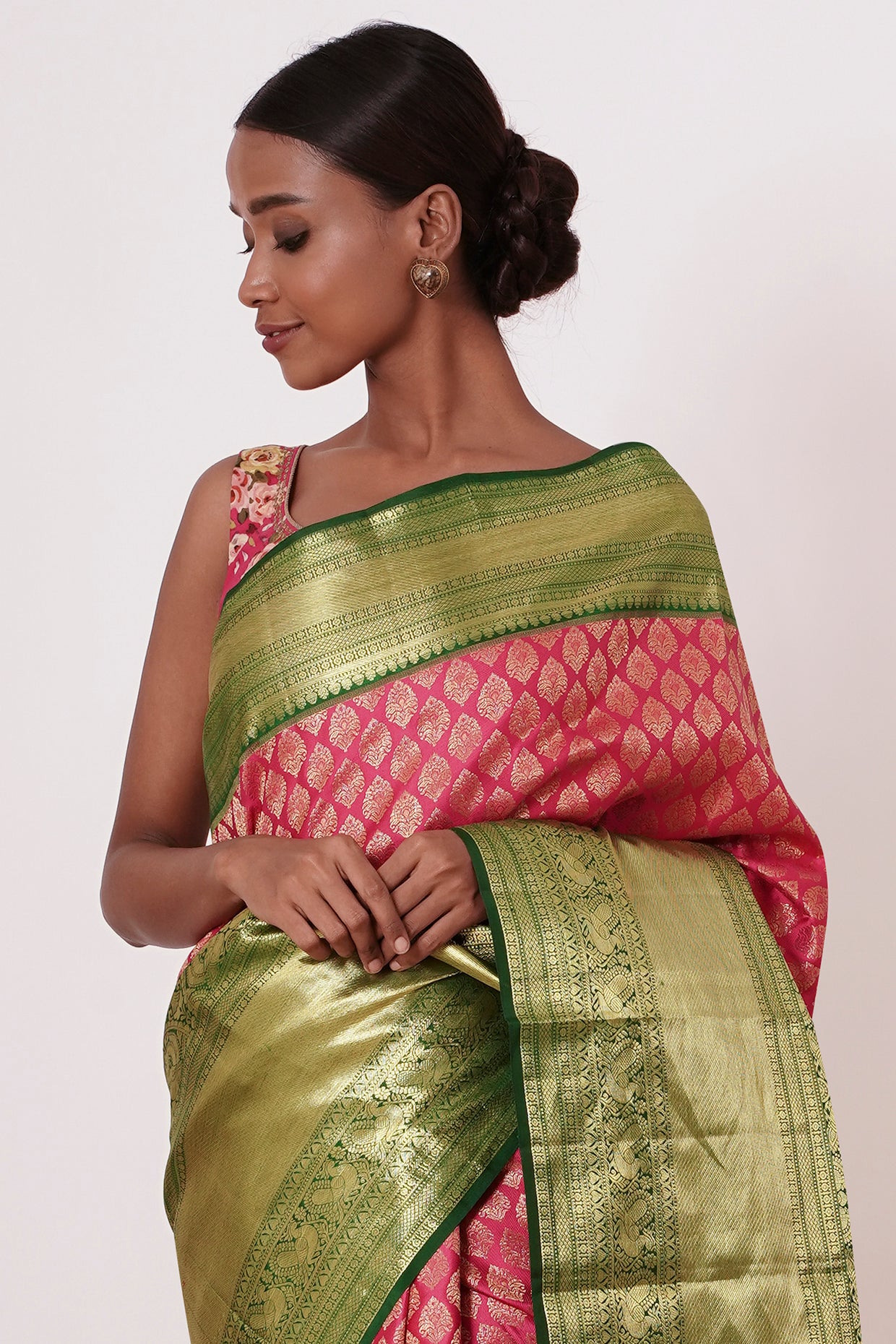 Make a statement with this stunning pink Dharmavaram silk saree, featuring a thick green border that adds a touch of elegance. The all-over gold zari brocade shines with intricate details, while the thick border is masterfully woven to create a work of art. The accompanying contrast digitally printed floral blouse adds a modern twist, perfect for adding a pop of color and personality to your look. The combination of the saree's soft pink hue, gold accents, and intricate brocade creates a truly regal effect, perfect for special occasions, weddings, or formal events where you want to exude confidence, poise, and sophisticated charm.