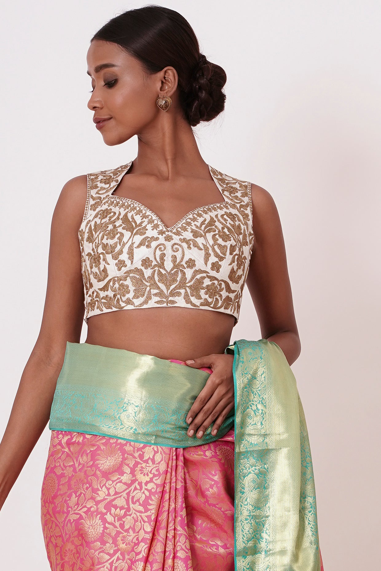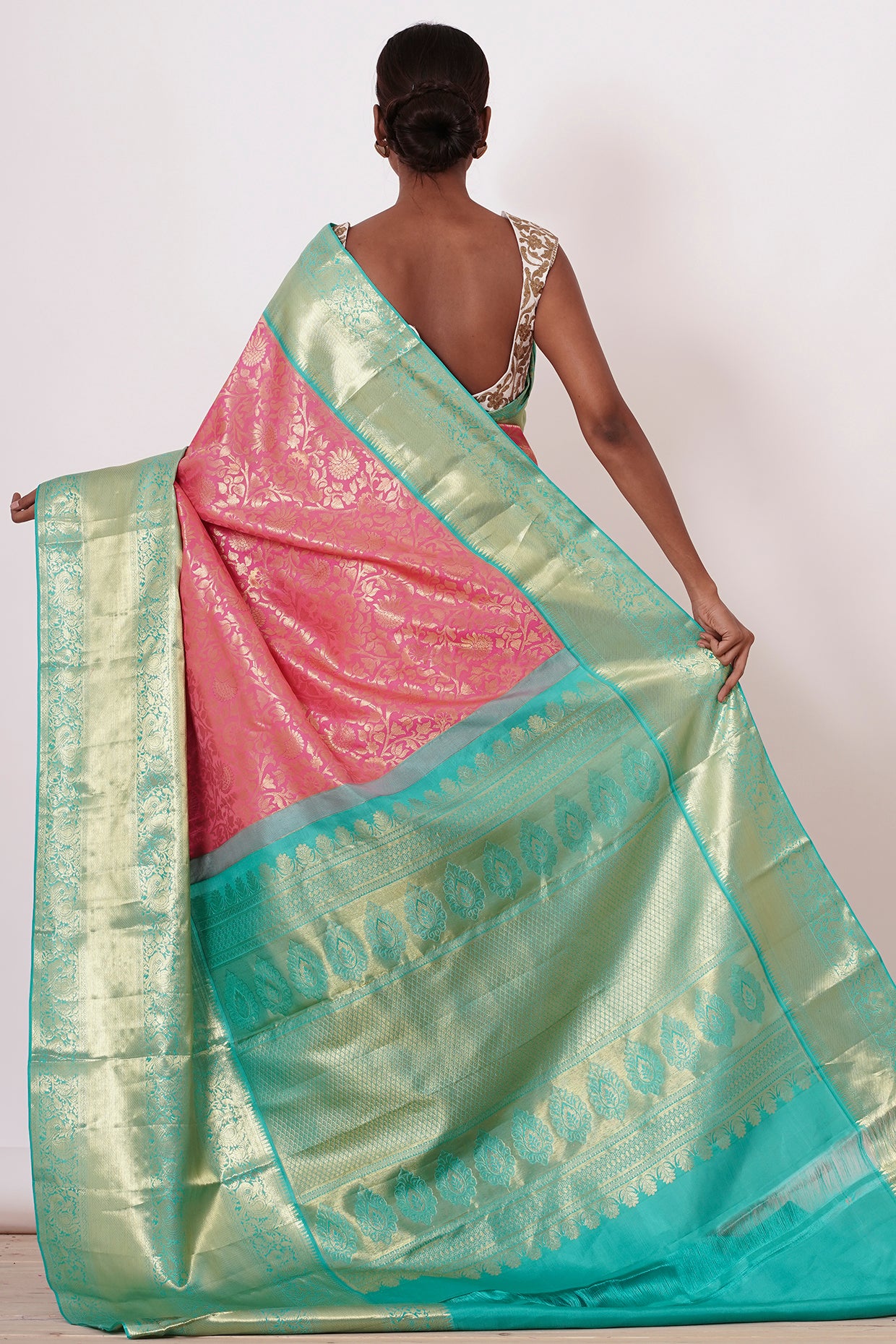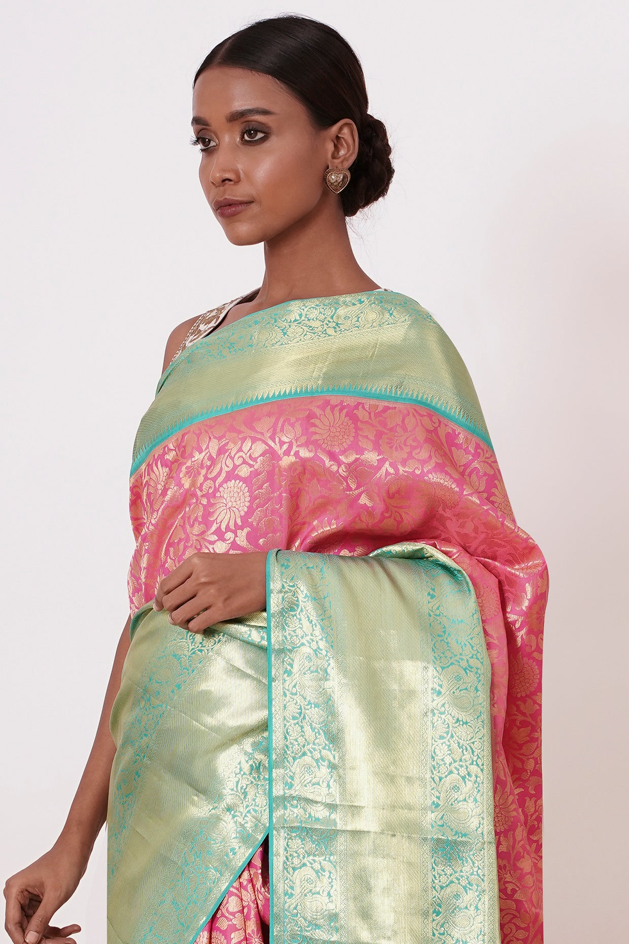 Experience the elegance of this onion pink Dharmavaram silk saree, featuring a thick, intricate cyan border that adds a touch of modern sophistication. The accompanying ivory blouse with all-over zari embroidery creates a stunning contrast, perfect for adding a touch of luxury to your look. The combination of the saree's soft onion pink hue, intricate cyan border, and delicate zari embroidery creates a truly captivating effect, exuding confidence, poise, and understated charm. Perfect for special occasions, weddings, or formal events where you want to make a statement with subtle elegance.