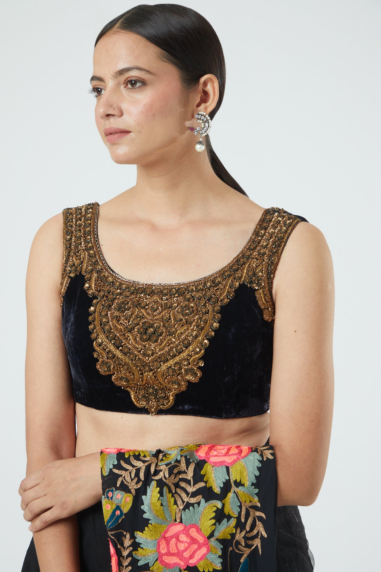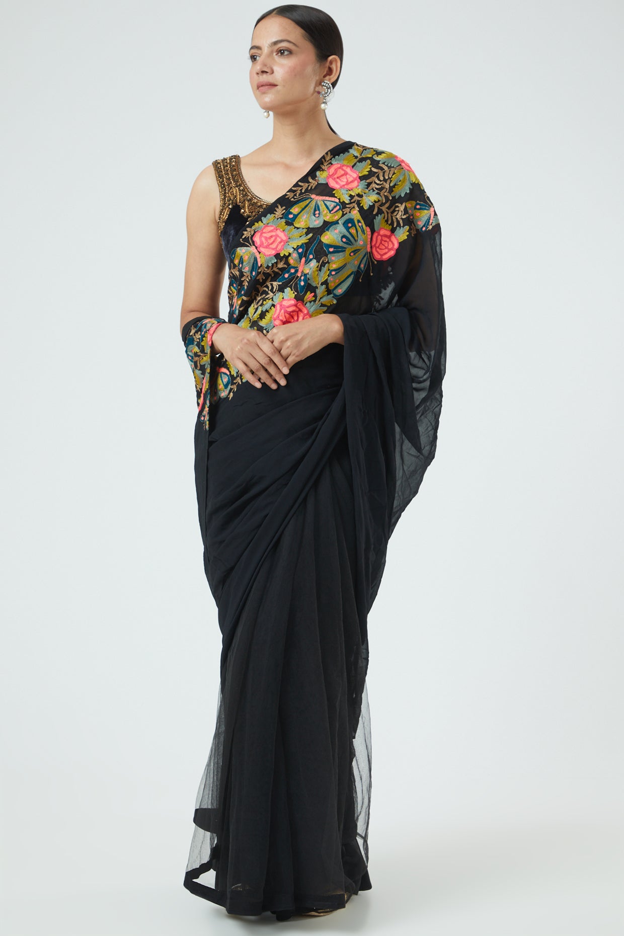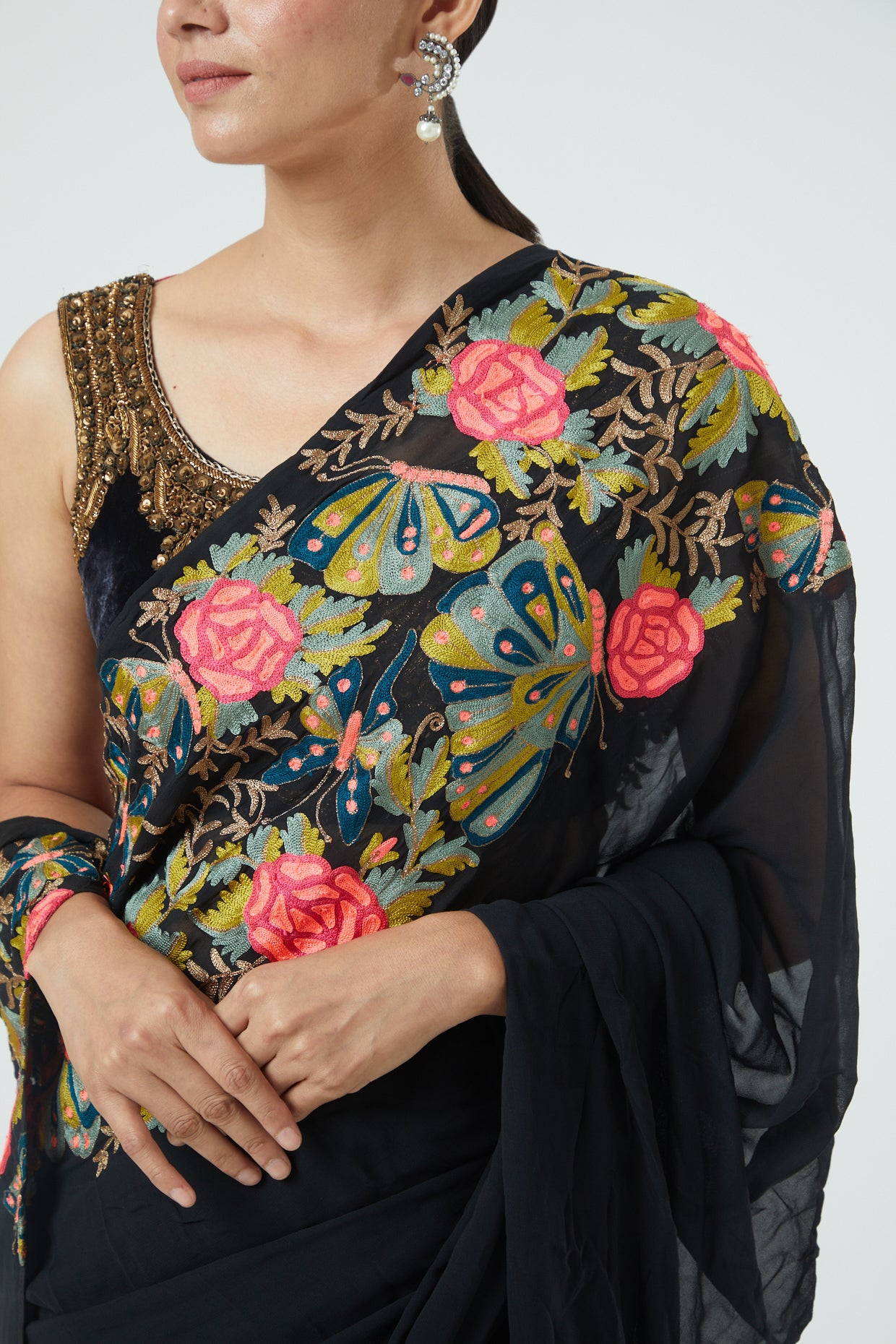 Featuring a black saree in net and georgette base with multi-coloured floral aari embroidery. It is paired with a matching velvet zardosi embroidered blouse.