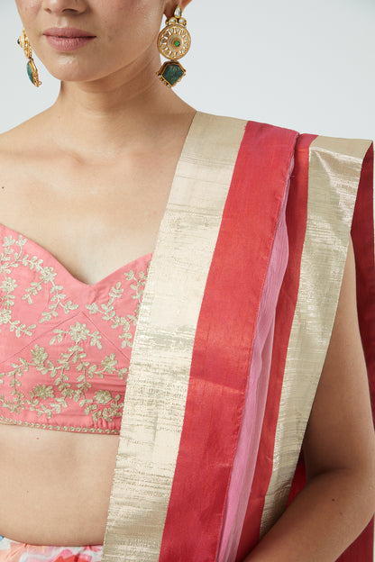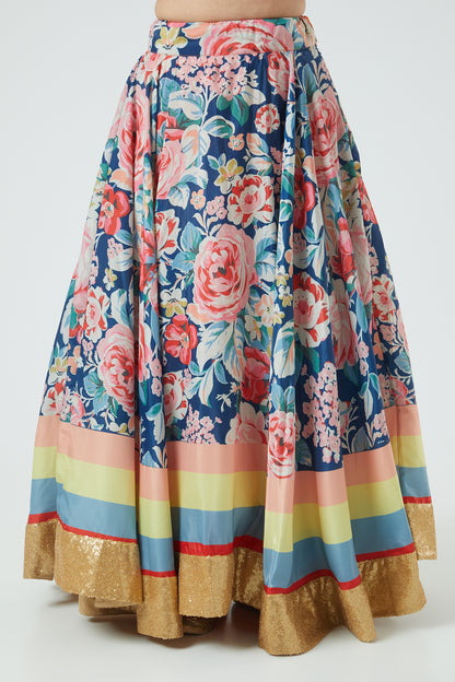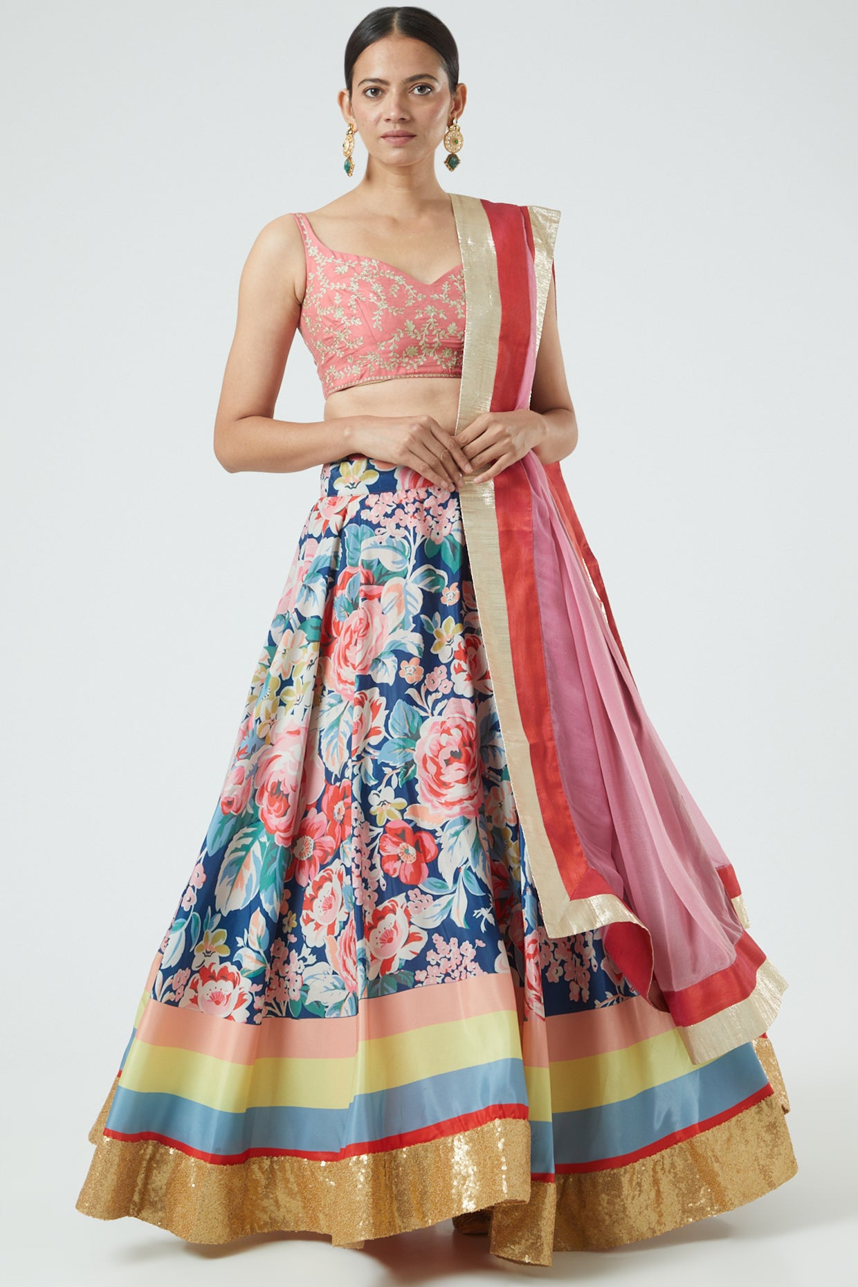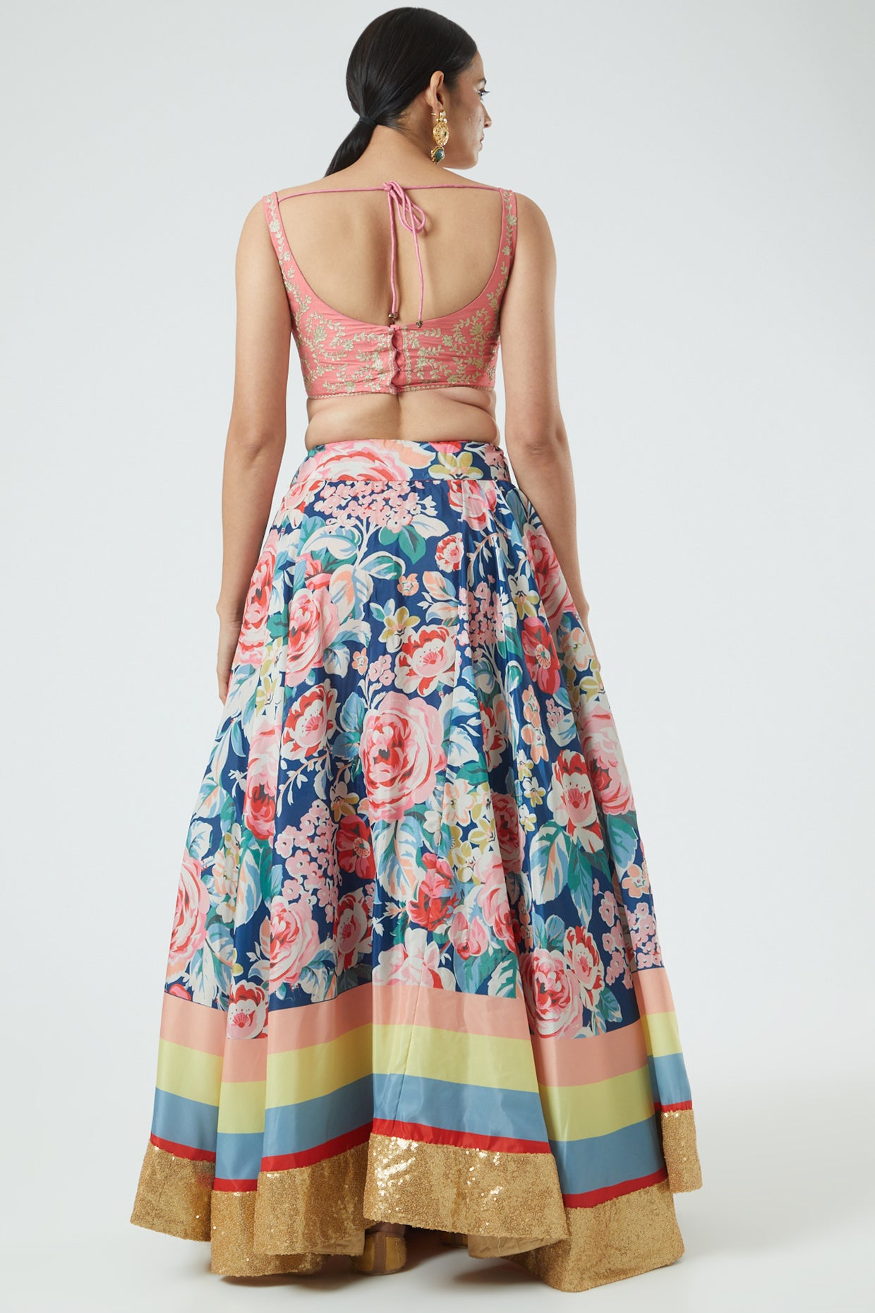 Featuring a blue and pink lehenga in silk blend base with floral print. It is paired with a matching aari embroidered blouse and a chiffon dupatta.